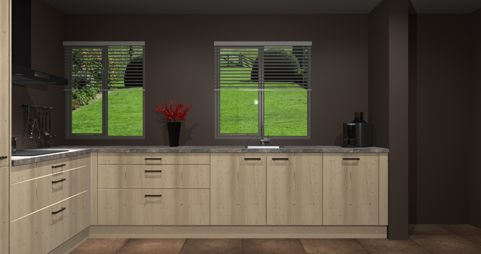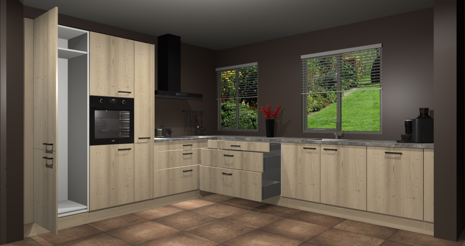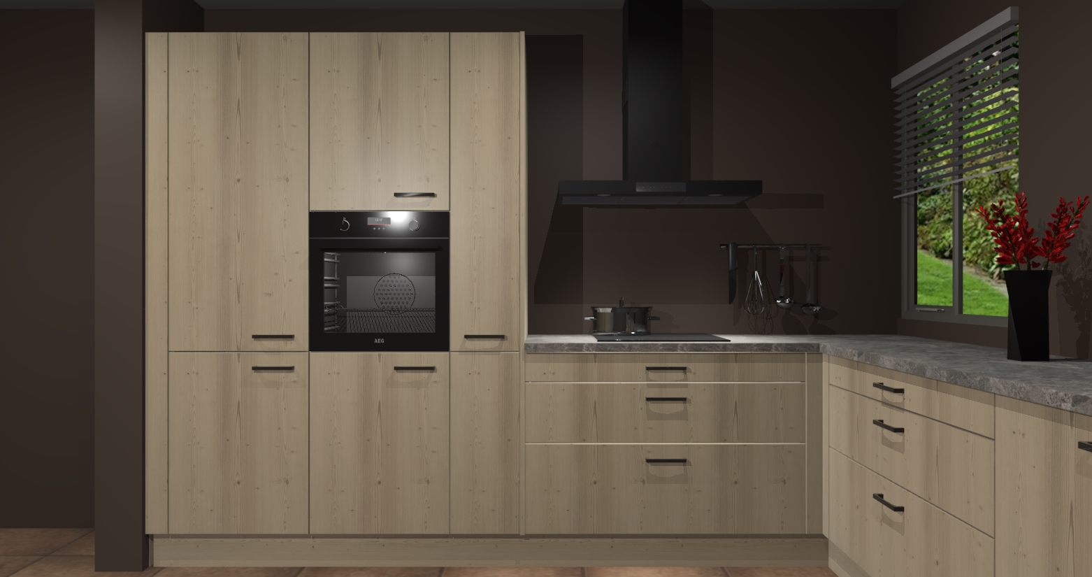 Welkom bij de Olm keuken Palermo. Deze prachtige keuken zal de komende jaren het middelpunt van de belangstelling in uw huis zijn. Uitgerust met vijf inbouwapparaten komt u nooit kookgereedschap tekort. Bovendien geeft de warme houtlook elke ruimte een uitnodigende en tijdloze uitstraling.