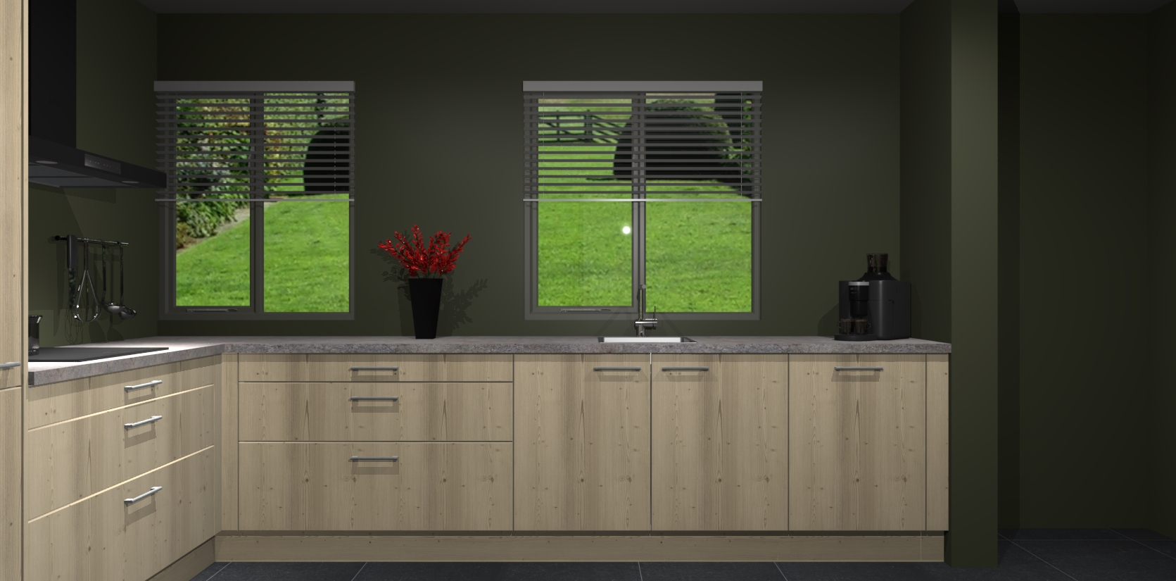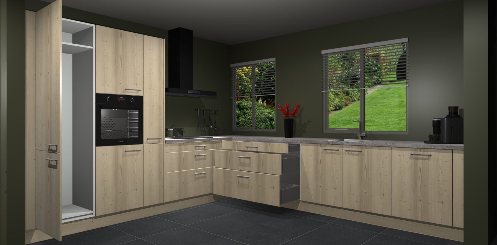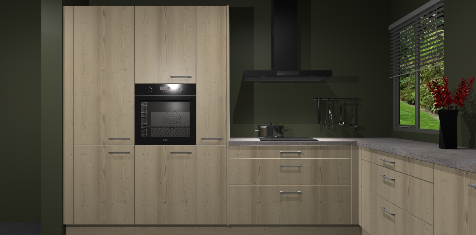 Welkom bij de Olm keuken Palermo. Deze prachtige keuken zal de komende jaren het middelpunt van de belangstelling in uw huis zijn. Uitgerust met vijf inbouwapparaten komt u nooit kookgereedschap tekort. Bovendien geeft de warme houtlook elke ruimte een uitnodigende en tijdloze uitstraling.