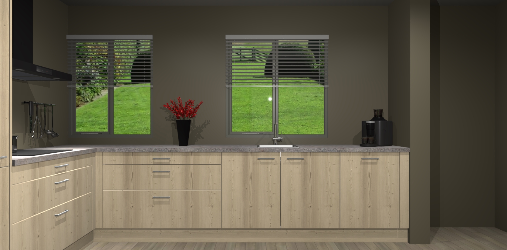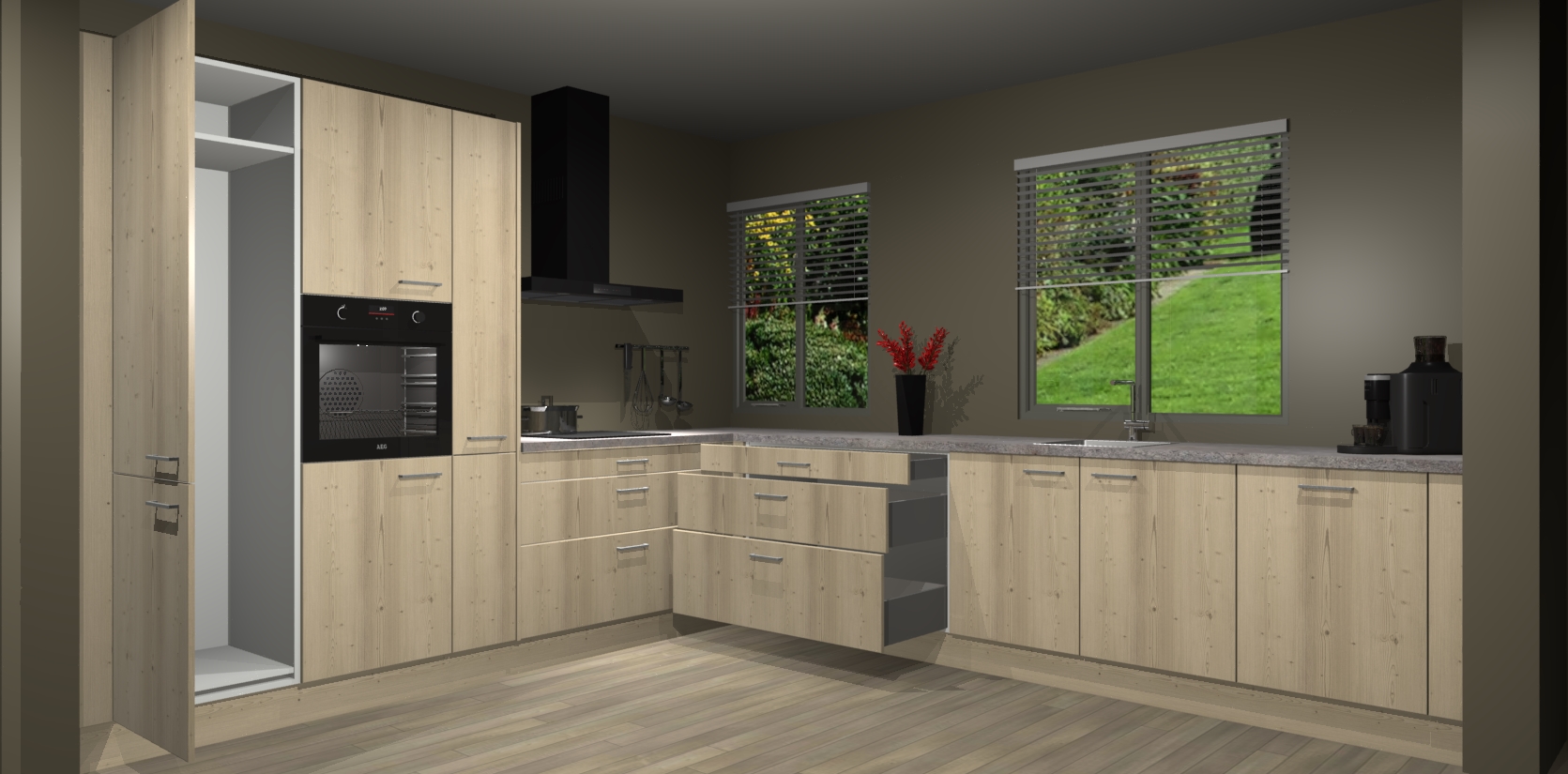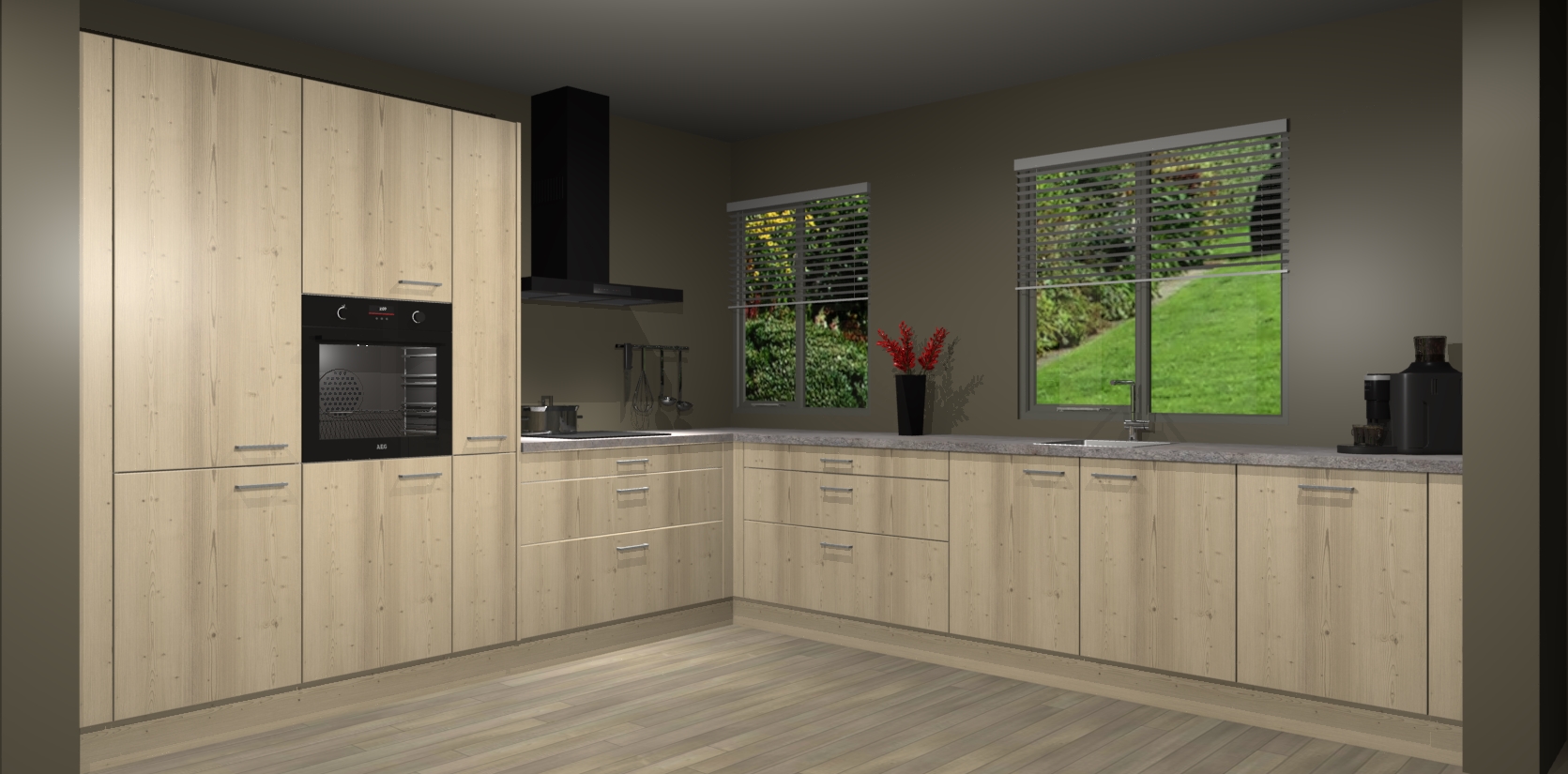 Welkom bij de Olm keuken Palermo. Deze prachtige keuken zal de komende jaren het middelpunt van de belangstelling in uw huis zijn. Uitgerust met vijf inbouwapparaten komt u nooit kookgereedschap tekort. Bovendien geeft de warme houtlook elke ruimte een uitnodigende en tijdloze uitstraling.