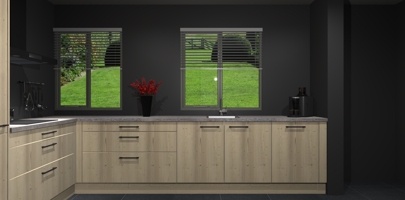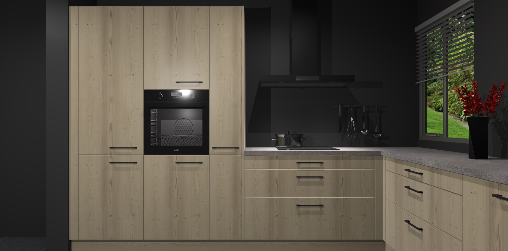 Welkom bij de Olm keuken Palermo. Deze prachtige keuken zal de komende jaren het middelpunt van de belangstelling in uw huis zijn. Uitgerust met vijf inbouwapparaten komt u nooit kookgereedschap tekort. Bovendien geeft de warme houtlook elke ruimte een uitnodigende en tijdloze uitstraling.