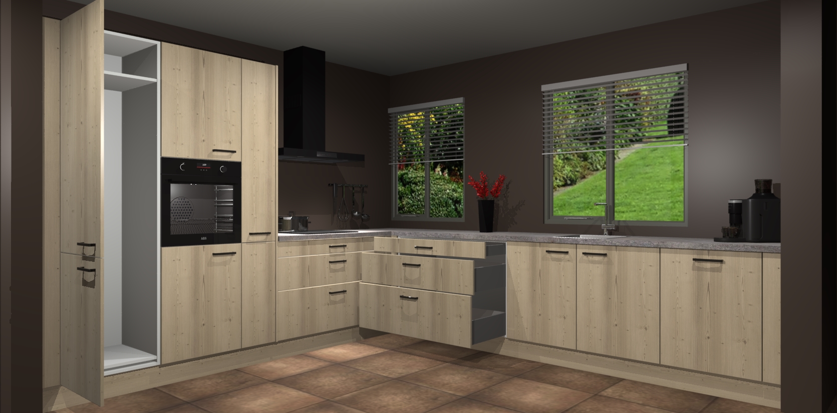 Welkom bij de Olm keuken Palermo. Deze prachtige keuken zal de komende jaren het middelpunt van de belangstelling in uw huis zijn. Uitgerust met vijf inbouwapparaten komt u nooit kookgereedschap tekort. Bovendien geeft de warme houtlook elke ruimte een uitnodigende en tijdloze uitstraling.