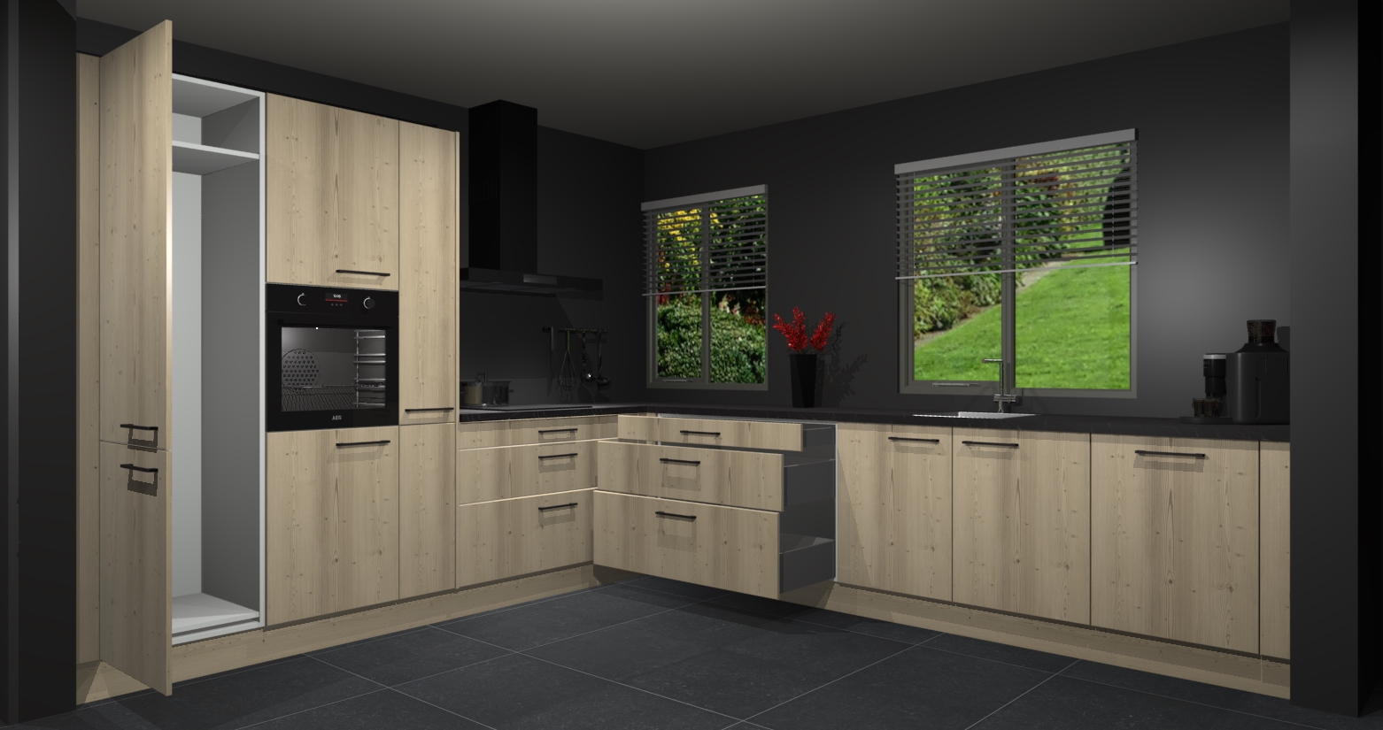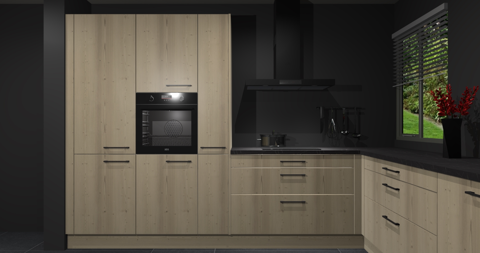 Welkom bij de Olm keuken Palermo. Deze prachtige keuken zal de komende jaren het middelpunt van de belangstelling in uw huis zijn. Uitgerust met vijf inbouwapparaten komt u nooit kookgereedschap tekort. Bovendien geeft de warme houtlook elke ruimte een uitnodigende en tijdloze uitstraling.