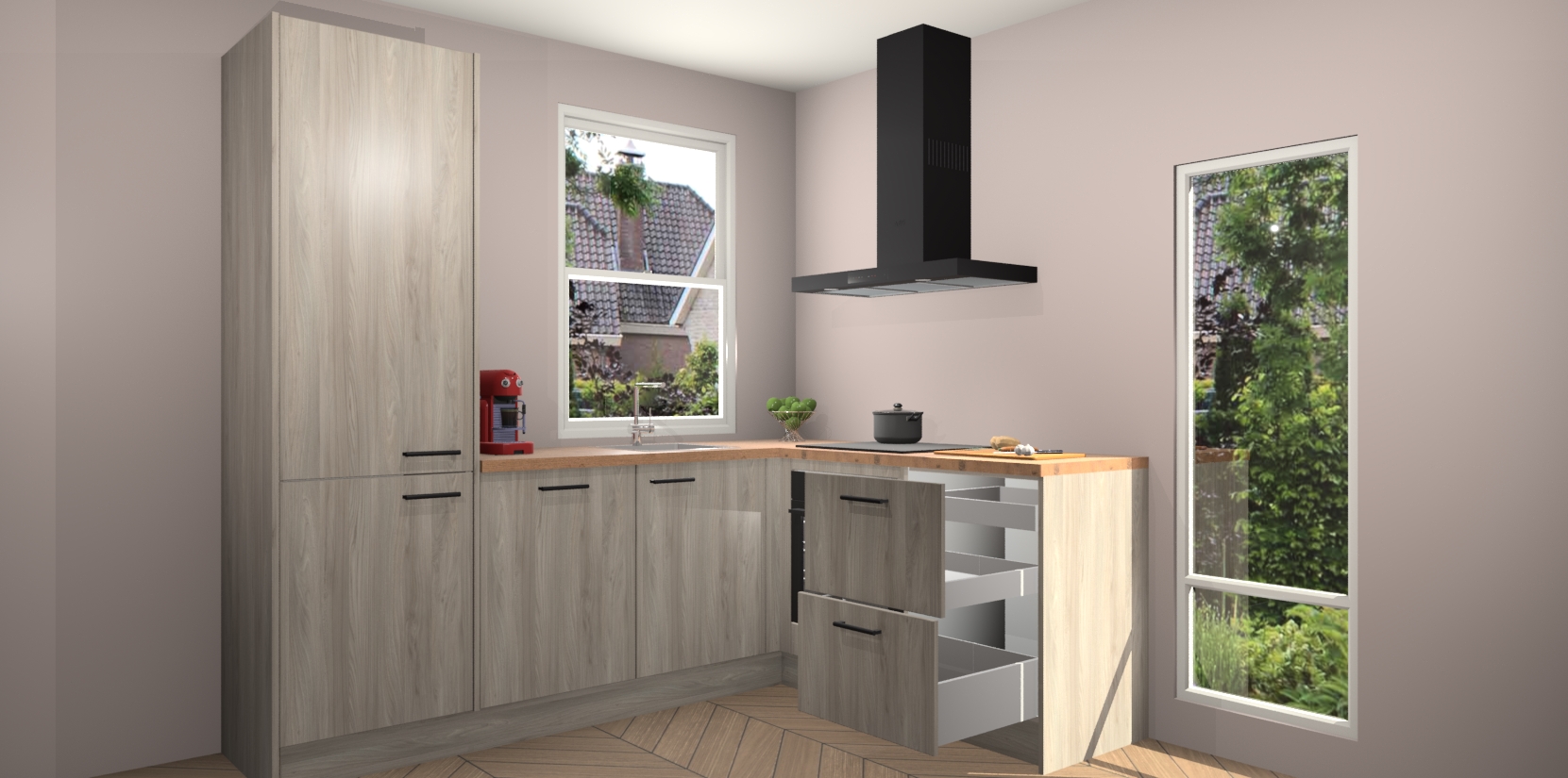 De prachtige Olm keuken Phuket is de perfecte keuze als u op zoek bent naar een moderne hoekkeuken met alle luxe en comfort die u kunt verwachten! De uitstraling in het houtlook-design draagt bij aan de warme sfeer die u nu al voelt wanneer u er naar kijkt. Heeft u genoeg van ouderwetse keukens? Probeer dan direct deze moderne, mooie hoekkeukens en laat iedereen verbluft achter!