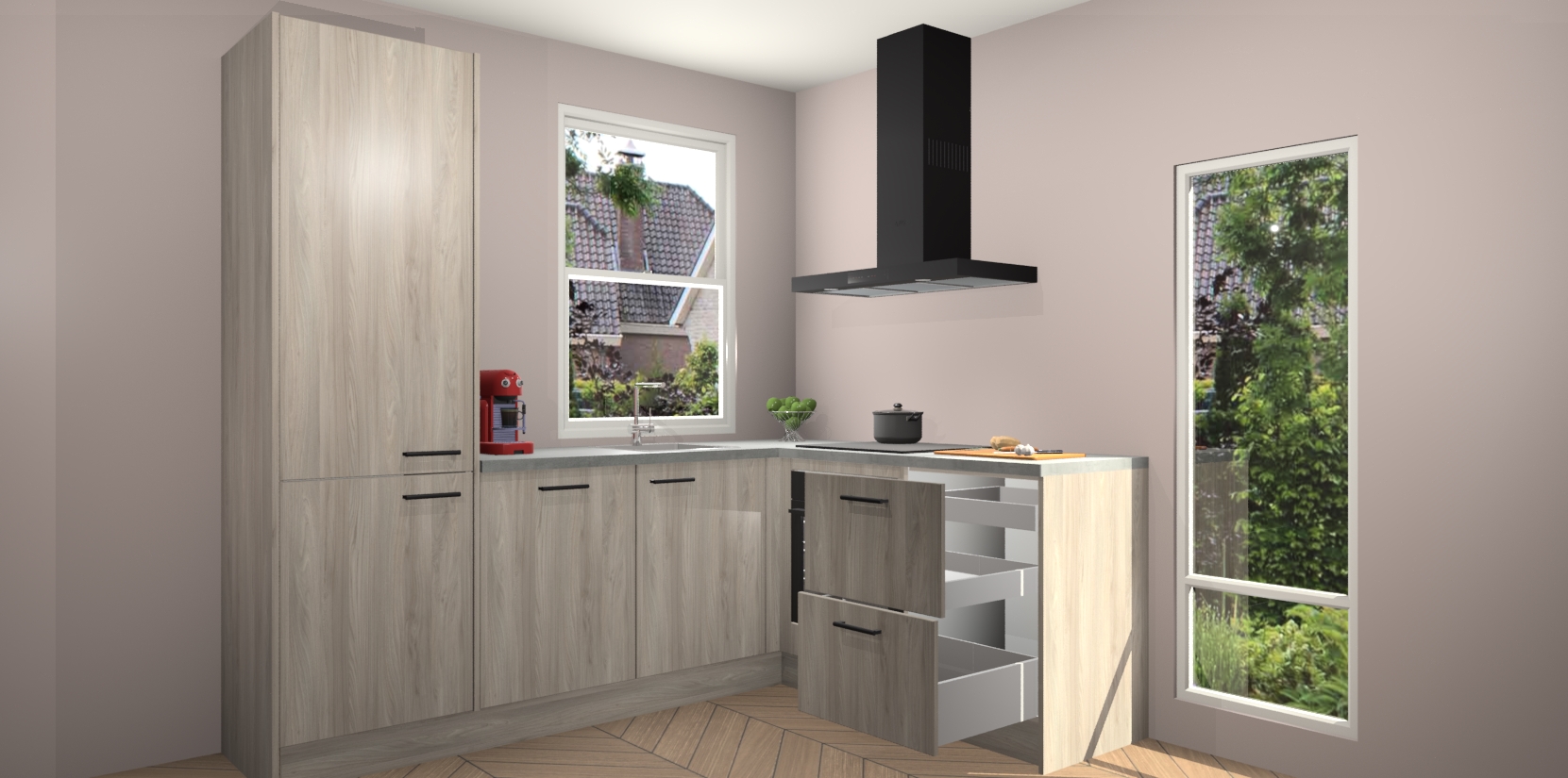 De prachtige Olm keuken Phuket is de perfecte keuze als u op zoek bent naar een moderne hoekkeuken met alle luxe en comfort die u kunt verwachten! De uitstraling in het houtlook-design draagt bij aan de warme sfeer die u nu al voelt wanneer u er naar kijkt. Heeft u genoeg van ouderwetse keukens? Probeer dan direct deze moderne, mooie hoekkeukens en laat iedereen verbluft achter!