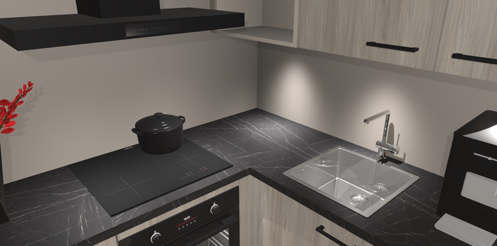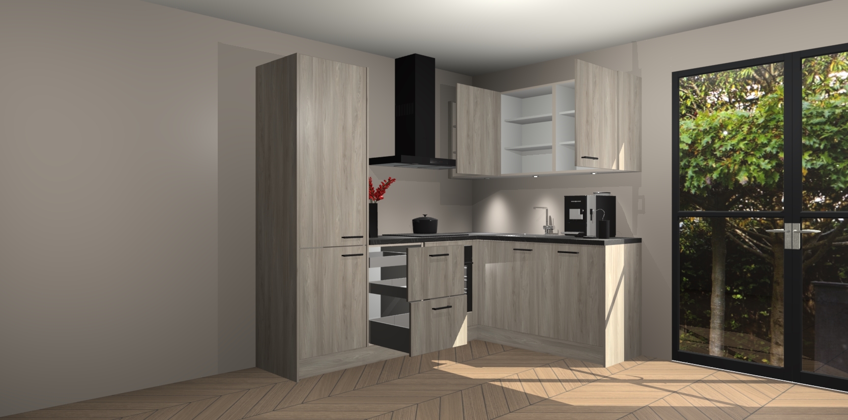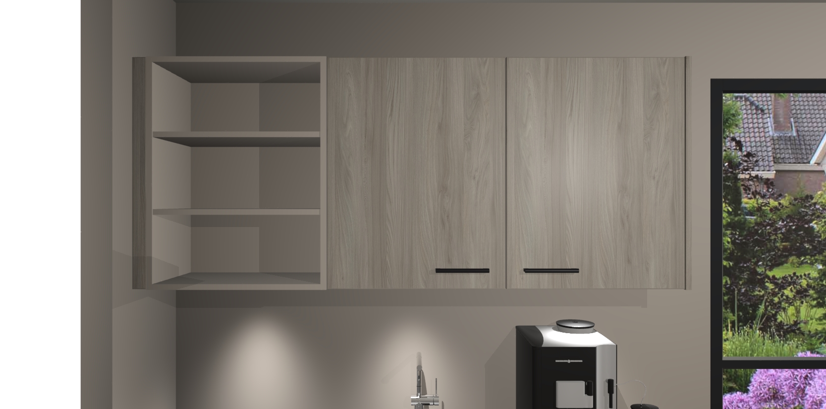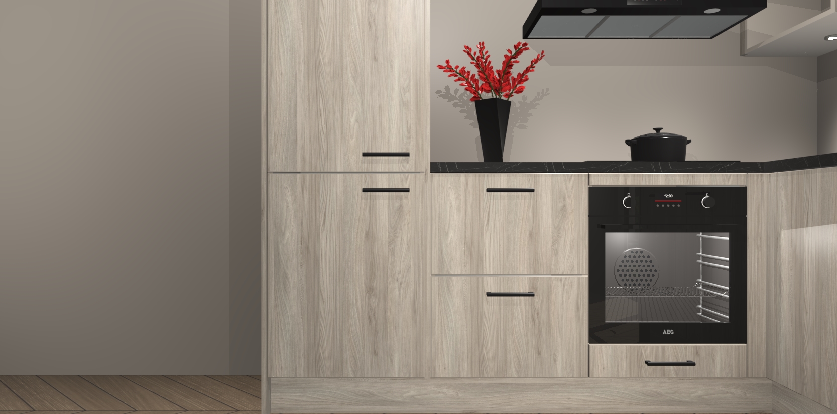 Wauw, dit is de Olm keuken Pilsen! U kunt gerust zeggen dat u elegantie combineert met functionaliteit met deze keuken. Met een modern en chique ontwerp is de keuken precies wat u nodig heeft om uw ruimte te verfraaien. De binnenzijde van de kasten is in dezelfde donkere kleur als de buitenzijde voor een uniforme look, compleet met softclose-kasten die stil sluiten.