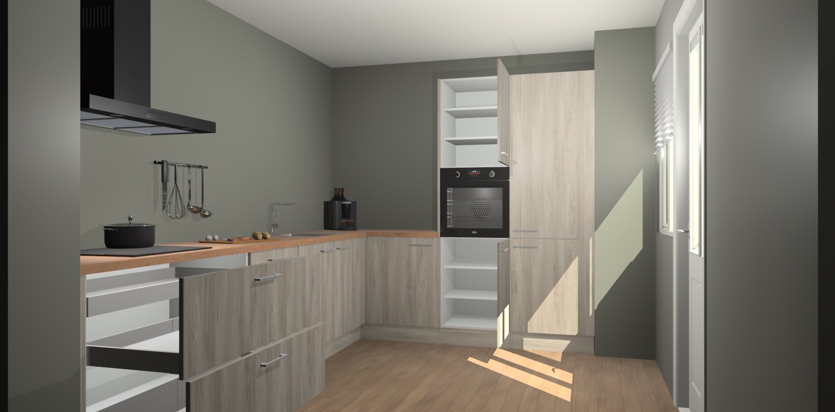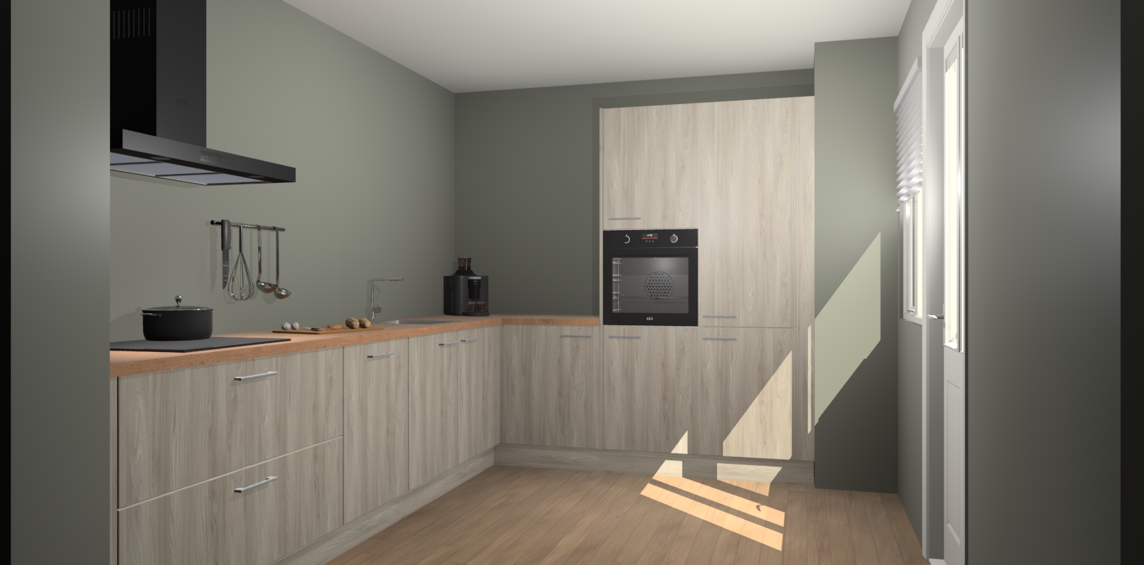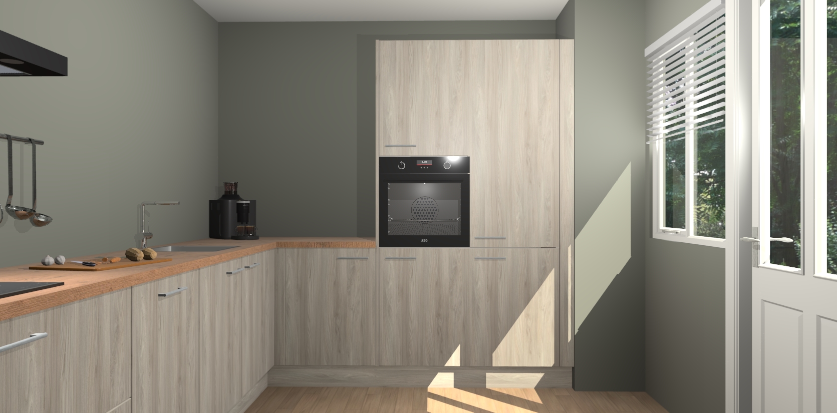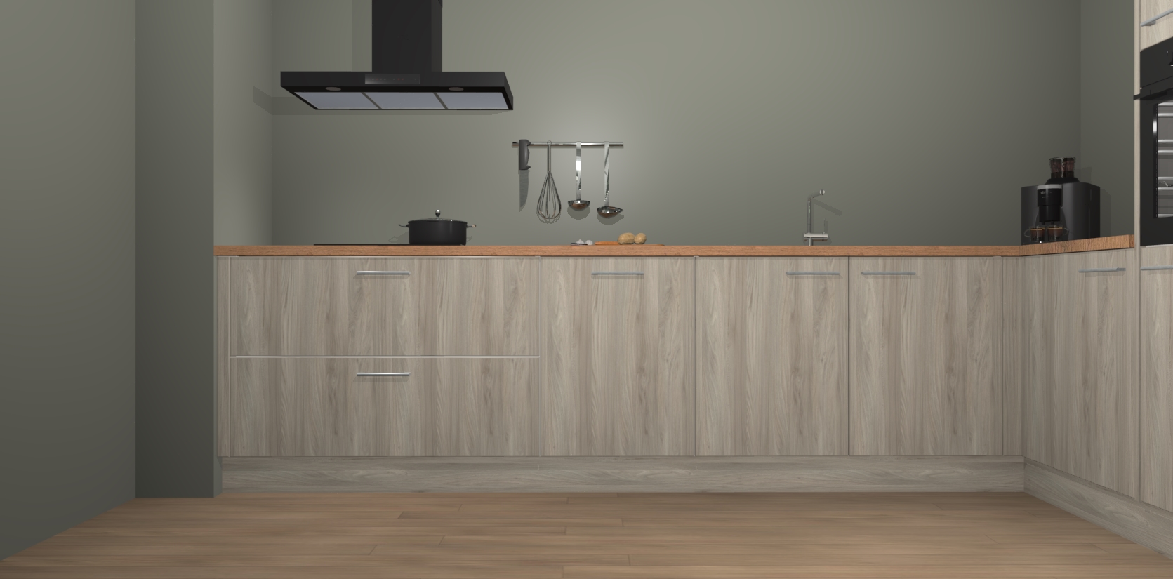 Welkom bij de Olm keuken Portland. Deze prachtige keuken zal de komende jaren het middelpunt van de belangstelling in uw huis zijn. Uitgerust met vijf inbouwapparaten komt u nooit kookgereedschap tekort. Bovendien geeft de warme houtlook elke ruimte een uitnodigende en tijdloze uitstraling.