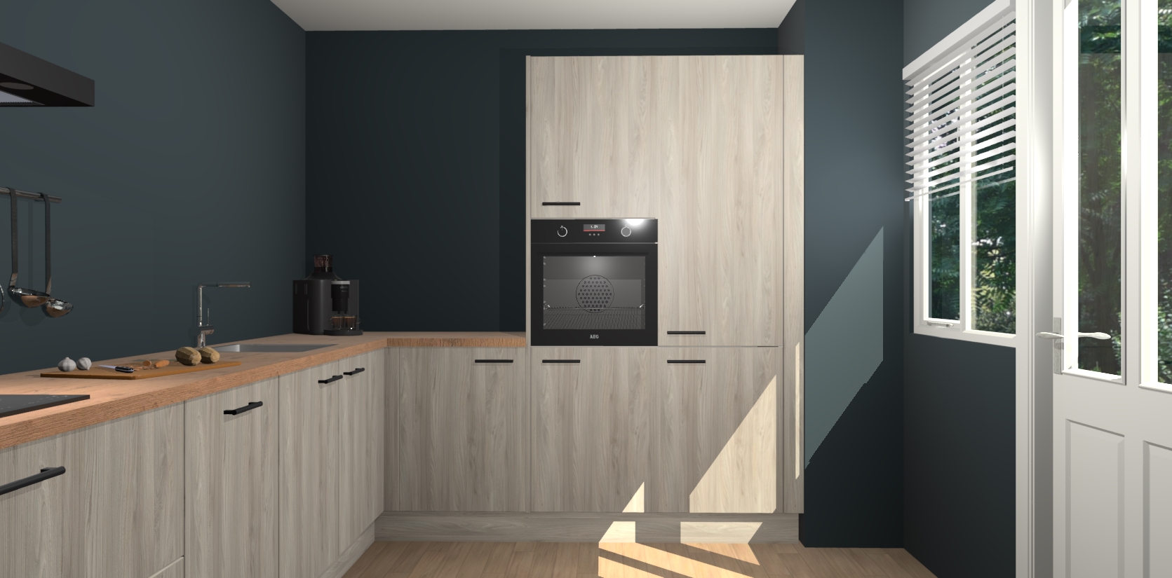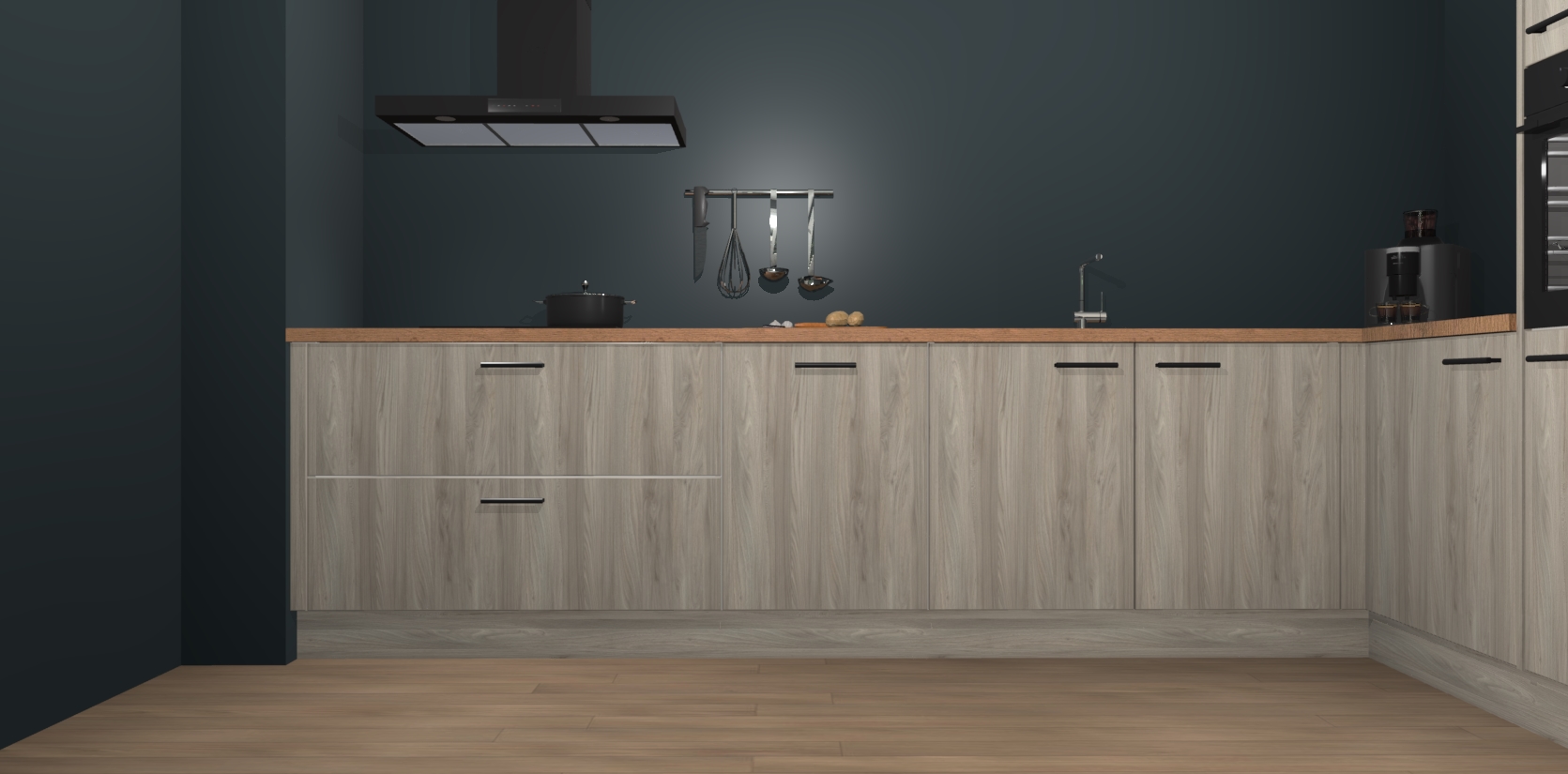 Welkom bij de Olm keuken Portland. Deze prachtige keuken zal de komende jaren het middelpunt van de belangstelling in uw huis zijn. Uitgerust met vijf inbouwapparaten komt u nooit kookgereedschap tekort. Bovendien geeft de warme houtlook elke ruimte een uitnodigende en tijdloze uitstraling.
