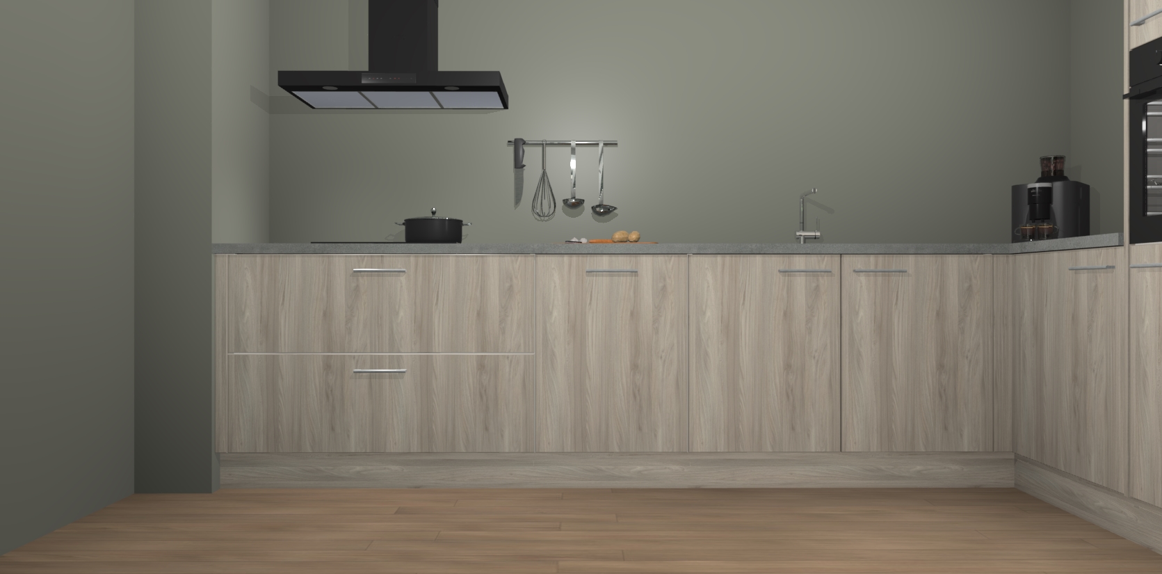Welkom bij de Olm keuken Portland. Deze prachtige keuken zal de komende jaren het middelpunt van de belangstelling in uw huis zijn. Uitgerust met vijf inbouwapparaten komt u nooit kookgereedschap tekort. Bovendien geeft de warme houtlook elke ruimte een uitnodigende en tijdloze uitstraling.