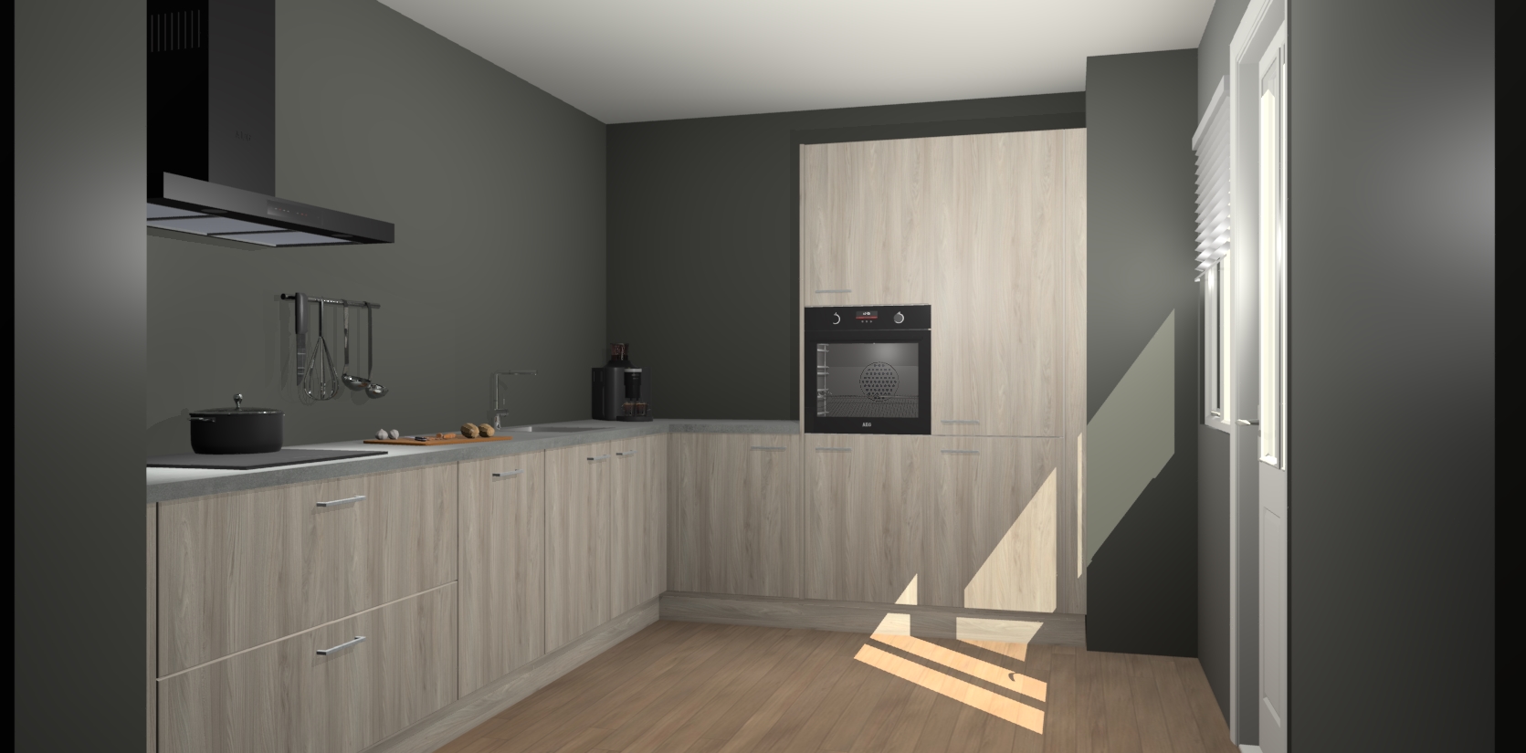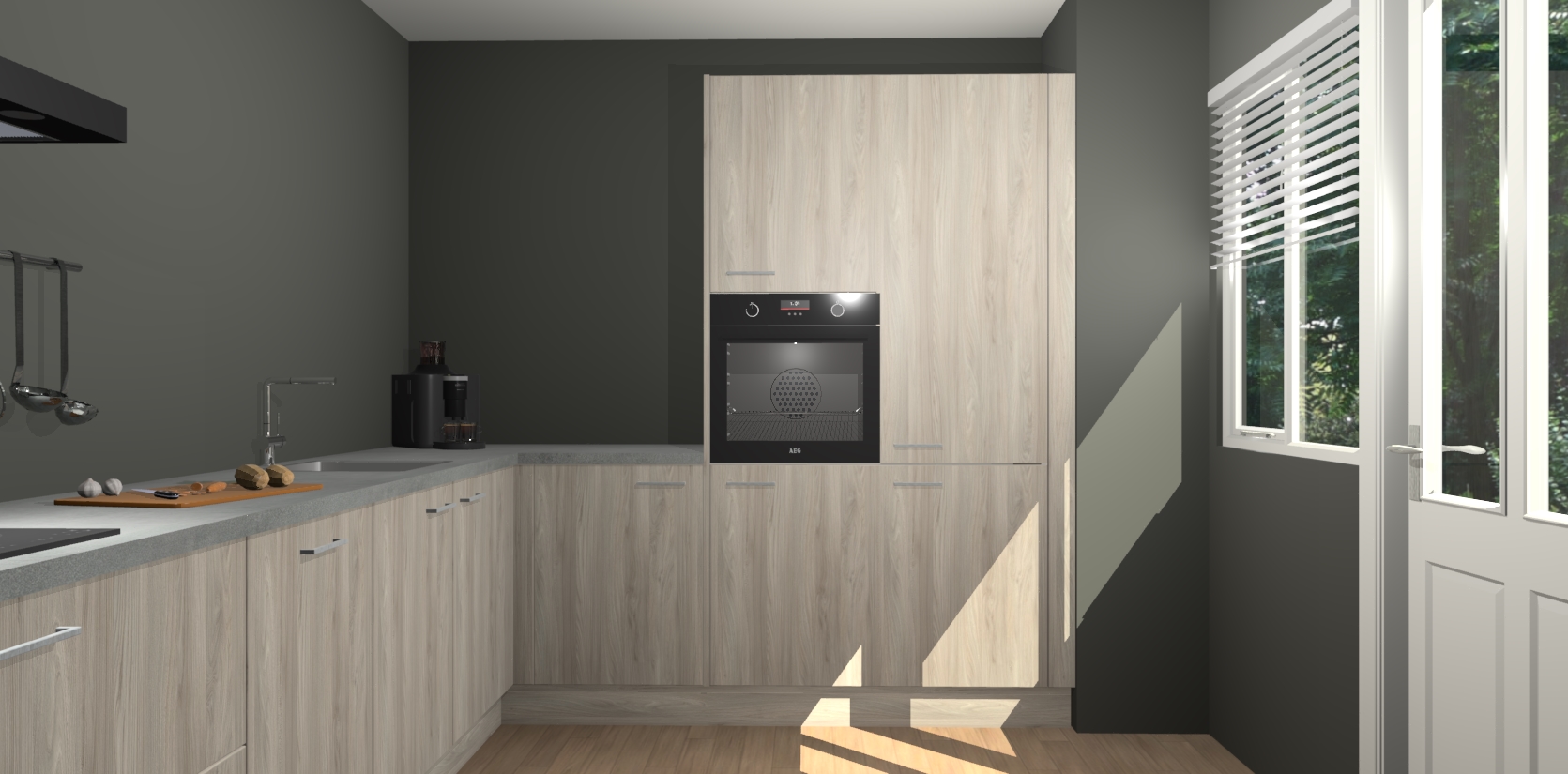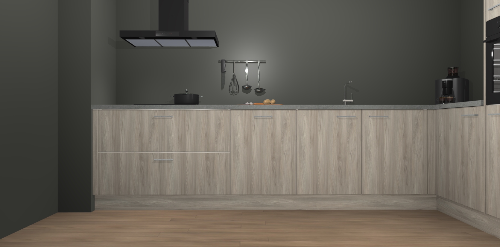 Welkom bij de Olm keuken Portland. Deze prachtige keuken zal de komende jaren het middelpunt van de belangstelling in uw huis zijn. Uitgerust met vijf inbouwapparaten komt u nooit kookgereedschap tekort. Bovendien geeft de warme houtlook elke ruimte een uitnodigende en tijdloze uitstraling.