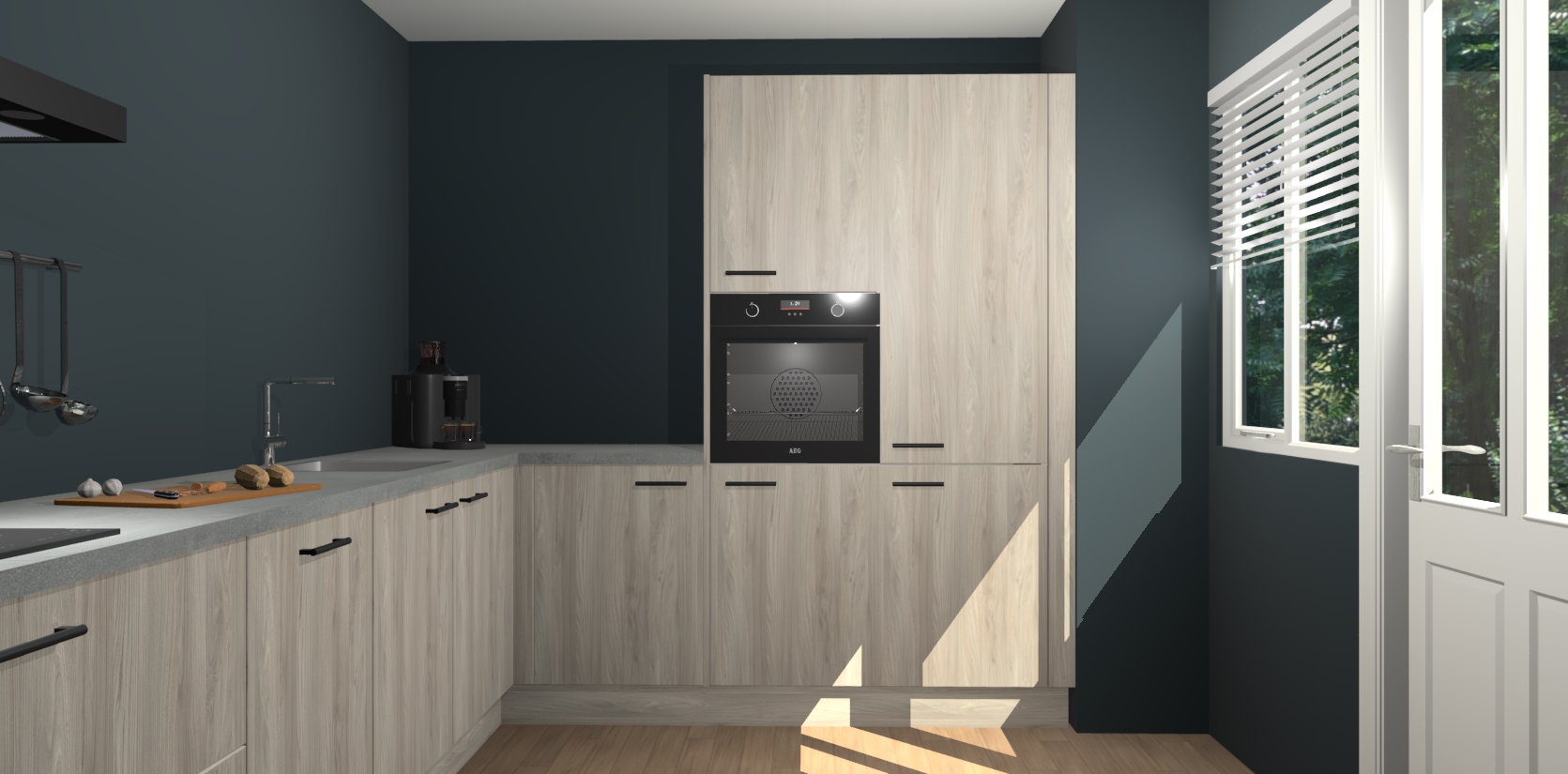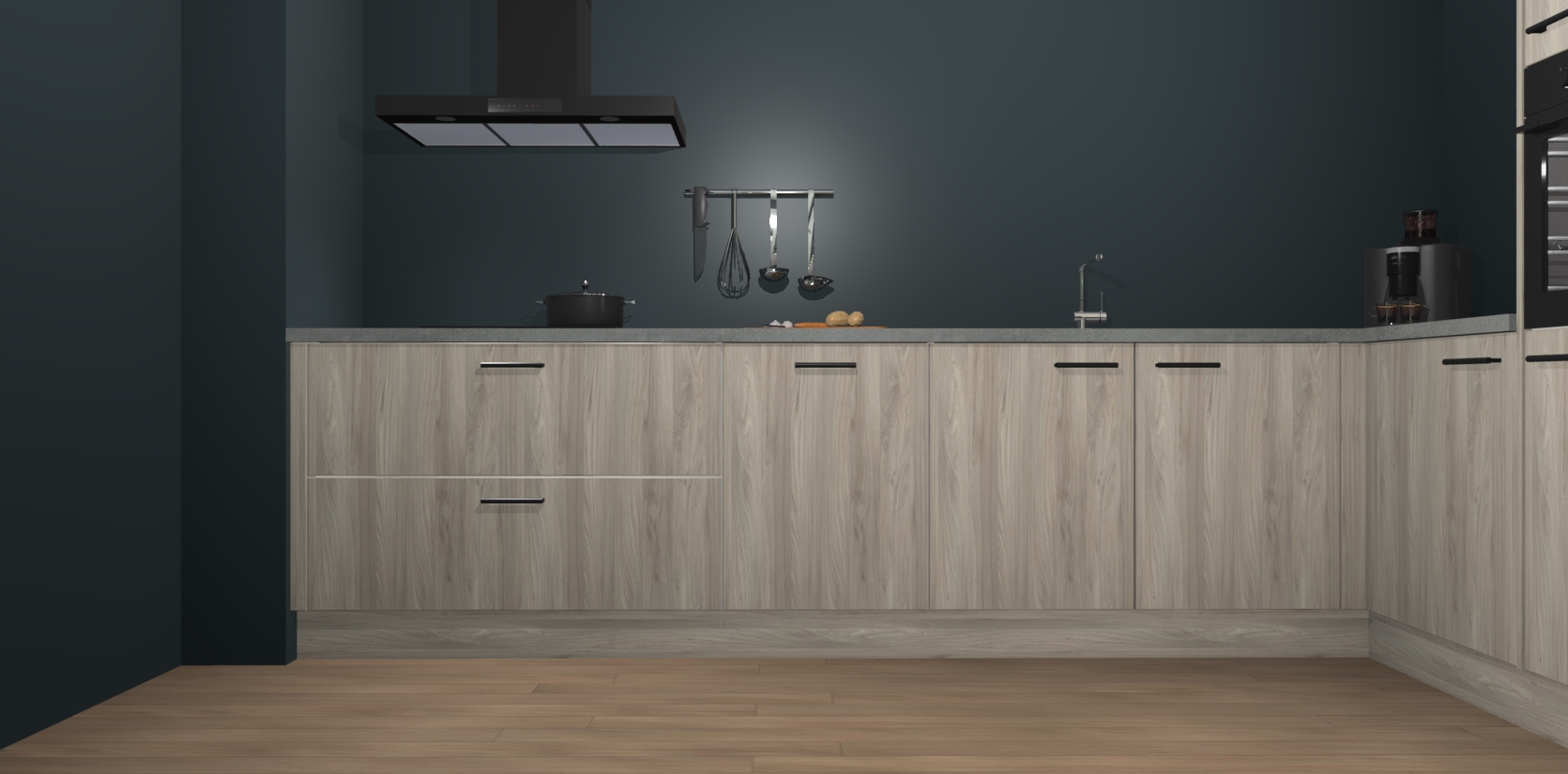 Welkom bij de Olm keuken Portland. Deze prachtige keuken zal de komende jaren het middelpunt van de belangstelling in uw huis zijn. Uitgerust met vijf inbouwapparaten komt u nooit kookgereedschap tekort. Bovendien geeft de warme houtlook elke ruimte een uitnodigende en tijdloze uitstraling.