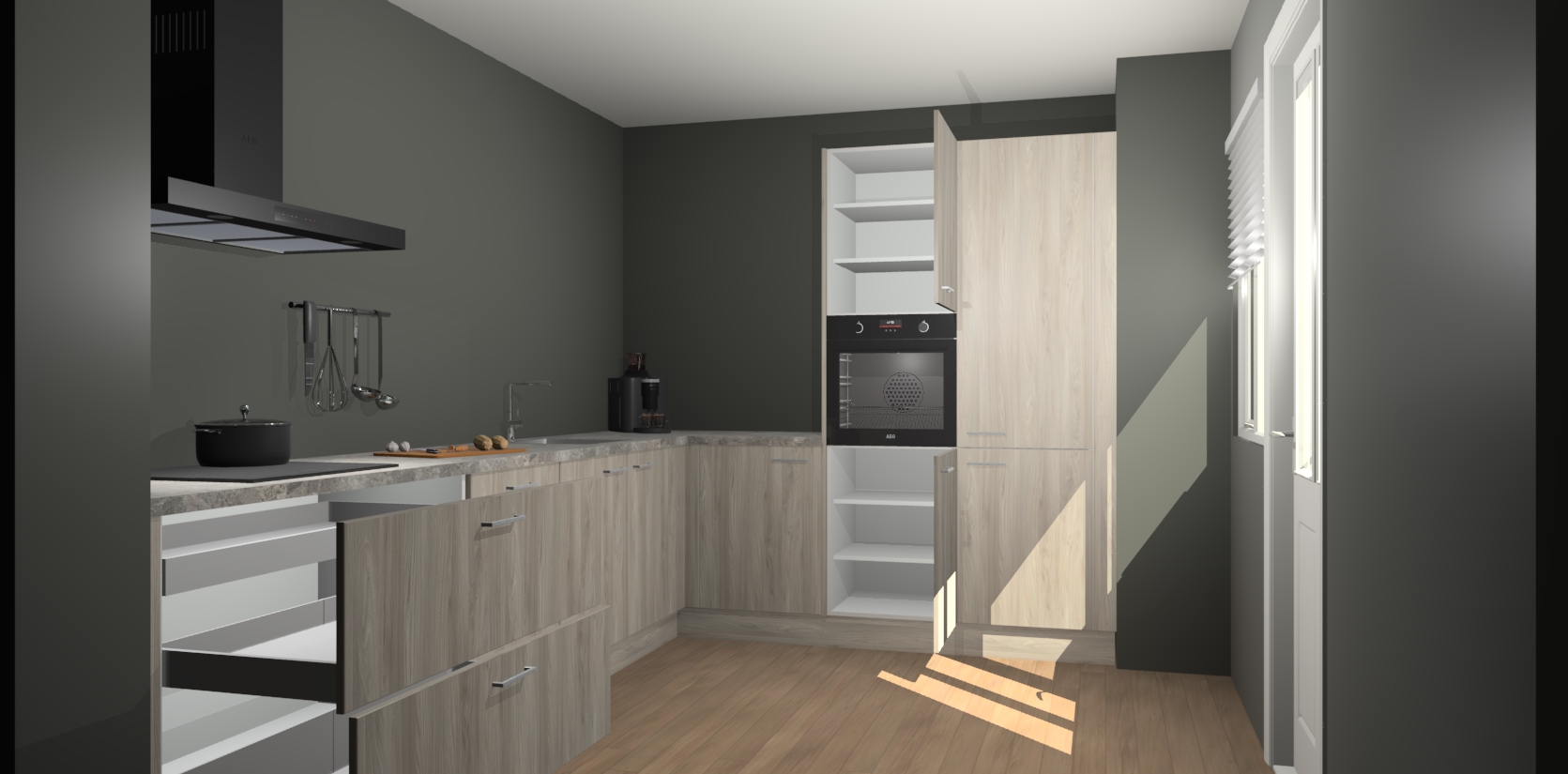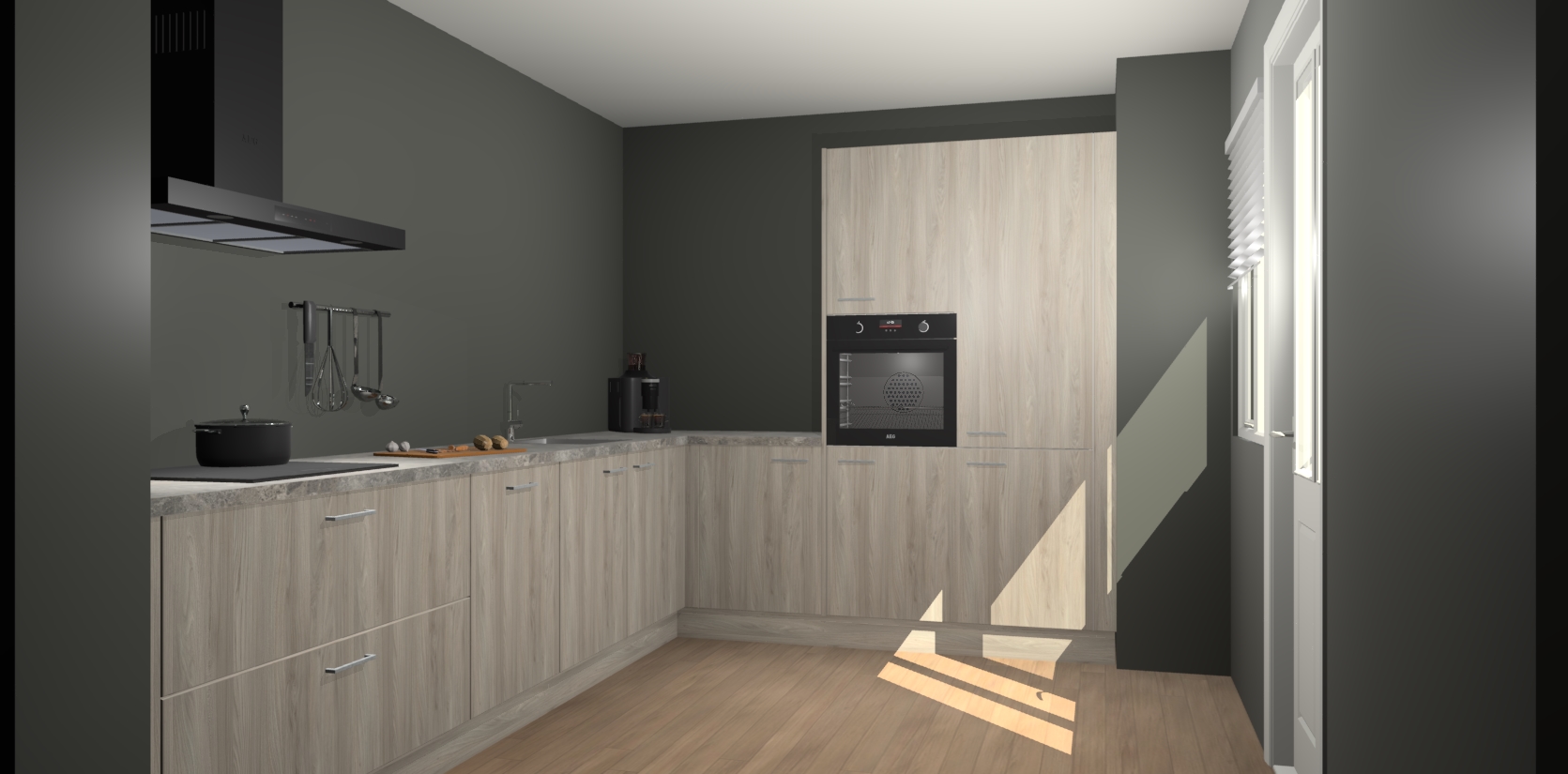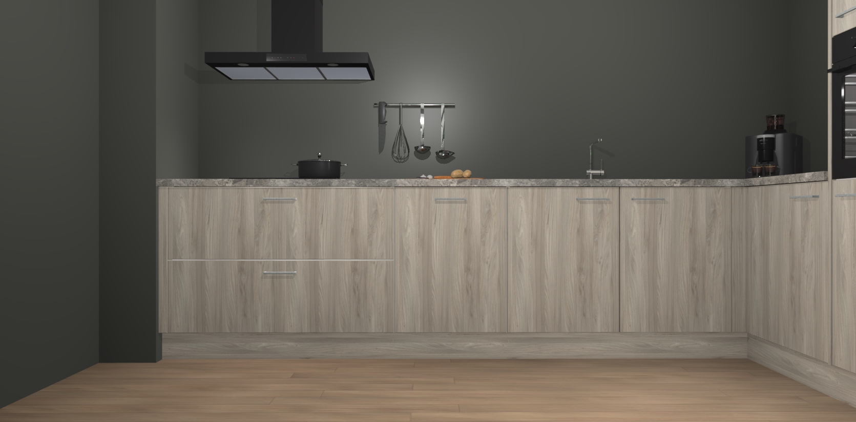 Welkom bij de Olm keuken Portland. Deze prachtige keuken zal de komende jaren het middelpunt van de belangstelling in uw huis zijn. Uitgerust met vijf inbouwapparaten komt u nooit kookgereedschap tekort. Bovendien geeft de warme houtlook elke ruimte een uitnodigende en tijdloze uitstraling.