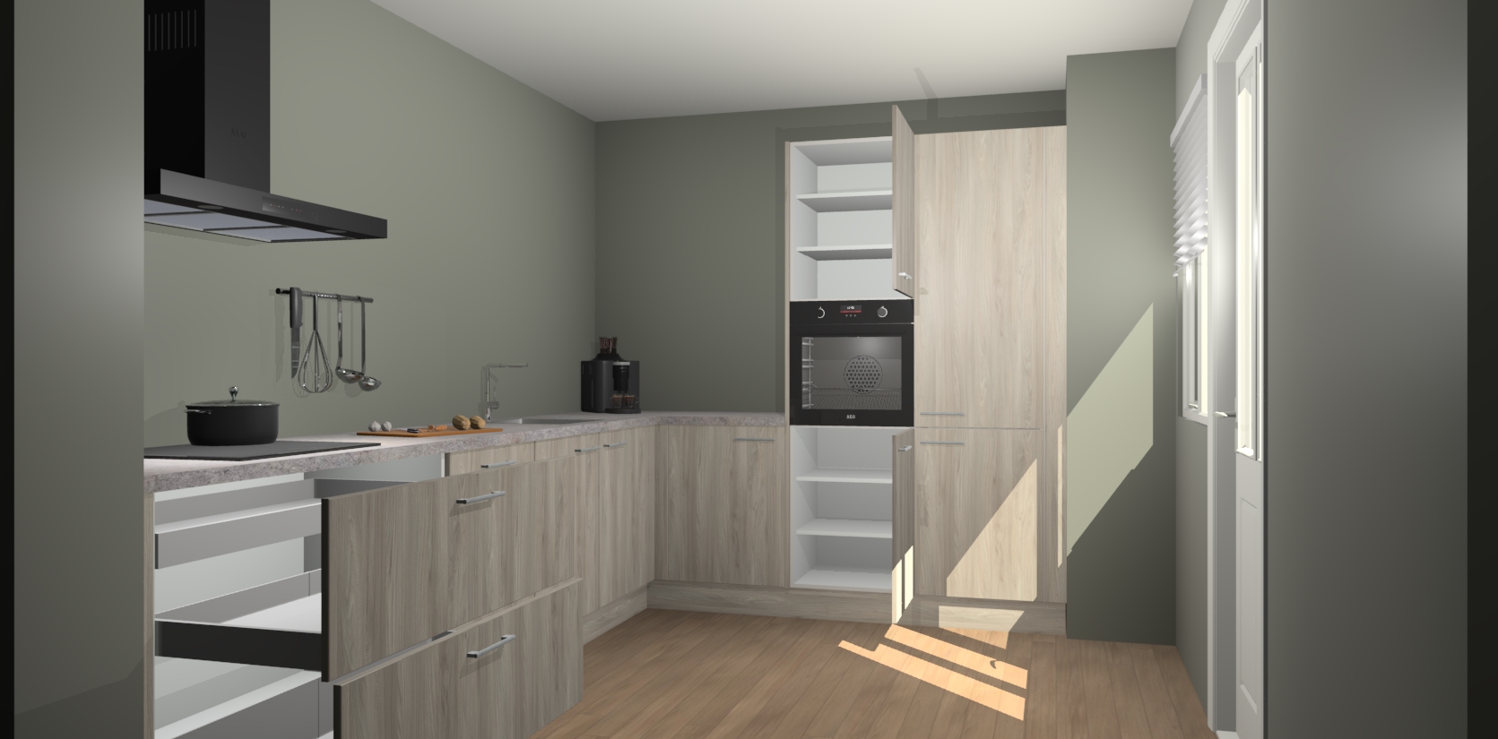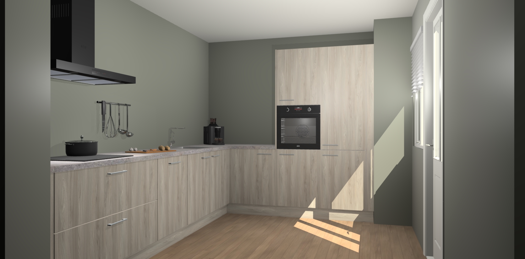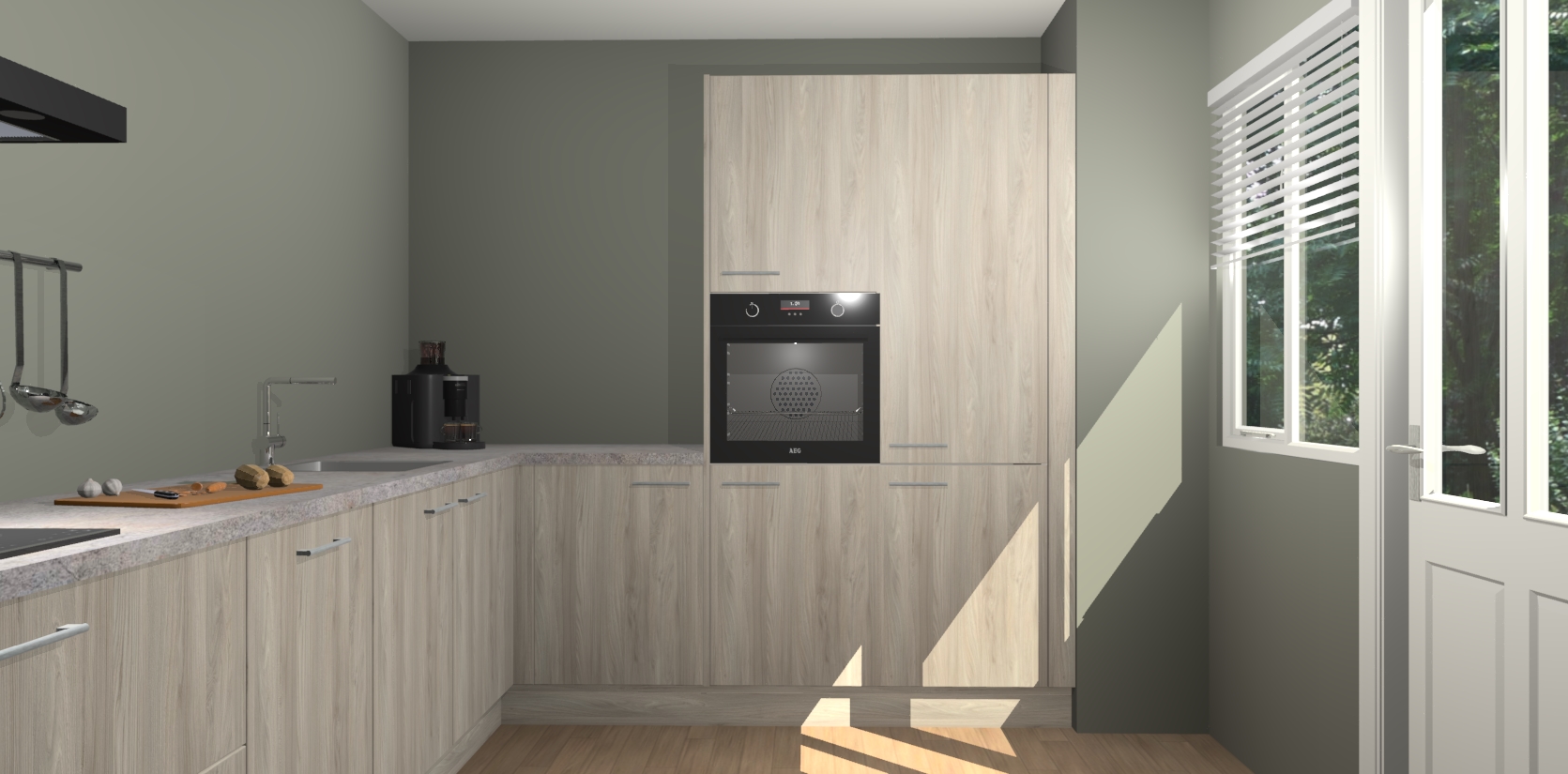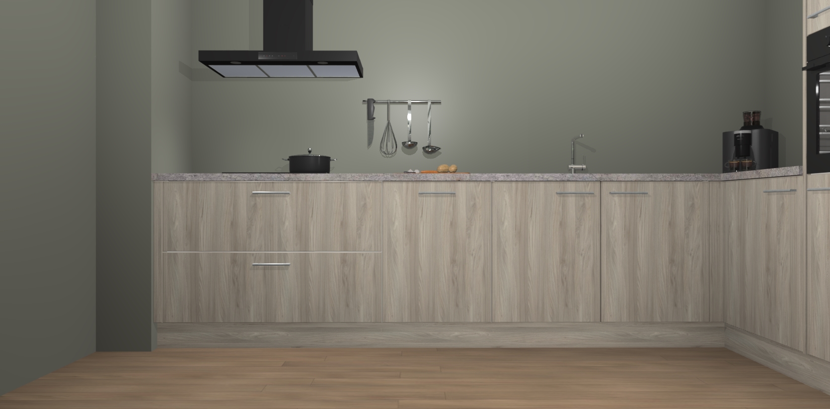 Welkom bij de Olm keuken Portland. Deze prachtige keuken zal de komende jaren het middelpunt van de belangstelling in uw huis zijn. Uitgerust met vijf inbouwapparaten komt u nooit kookgereedschap tekort. Bovendien geeft de warme houtlook elke ruimte een uitnodigende en tijdloze uitstraling.