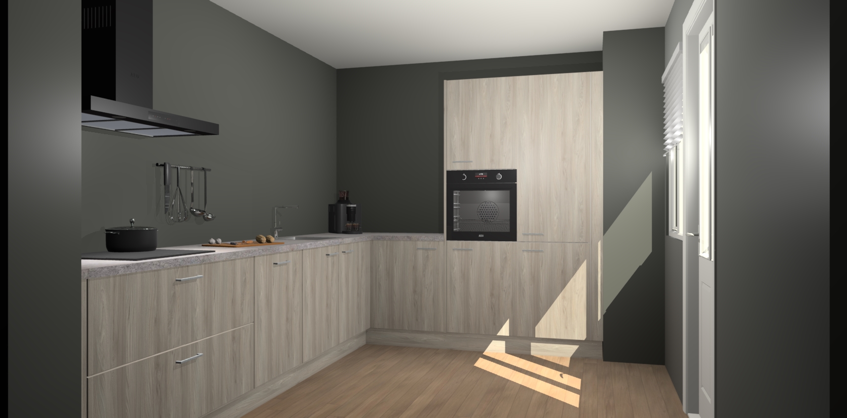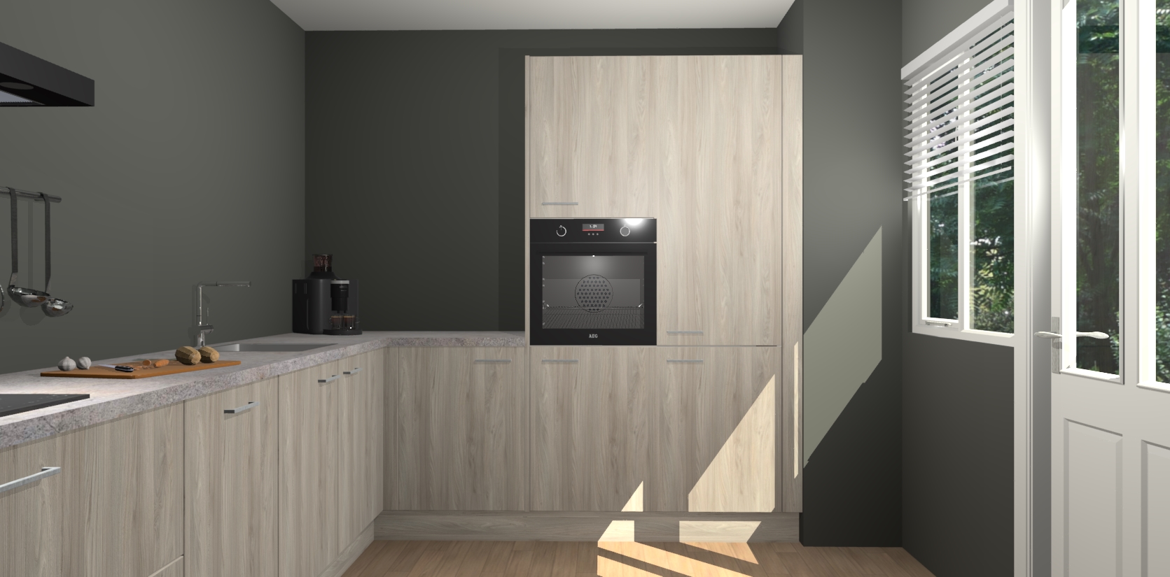 Welkom bij de Olm keuken Portland. Deze prachtige keuken zal de komende jaren het middelpunt van de belangstelling in uw huis zijn. Uitgerust met vijf inbouwapparaten komt u nooit kookgereedschap tekort. Bovendien geeft de warme houtlook elke ruimte een uitnodigende en tijdloze uitstraling.