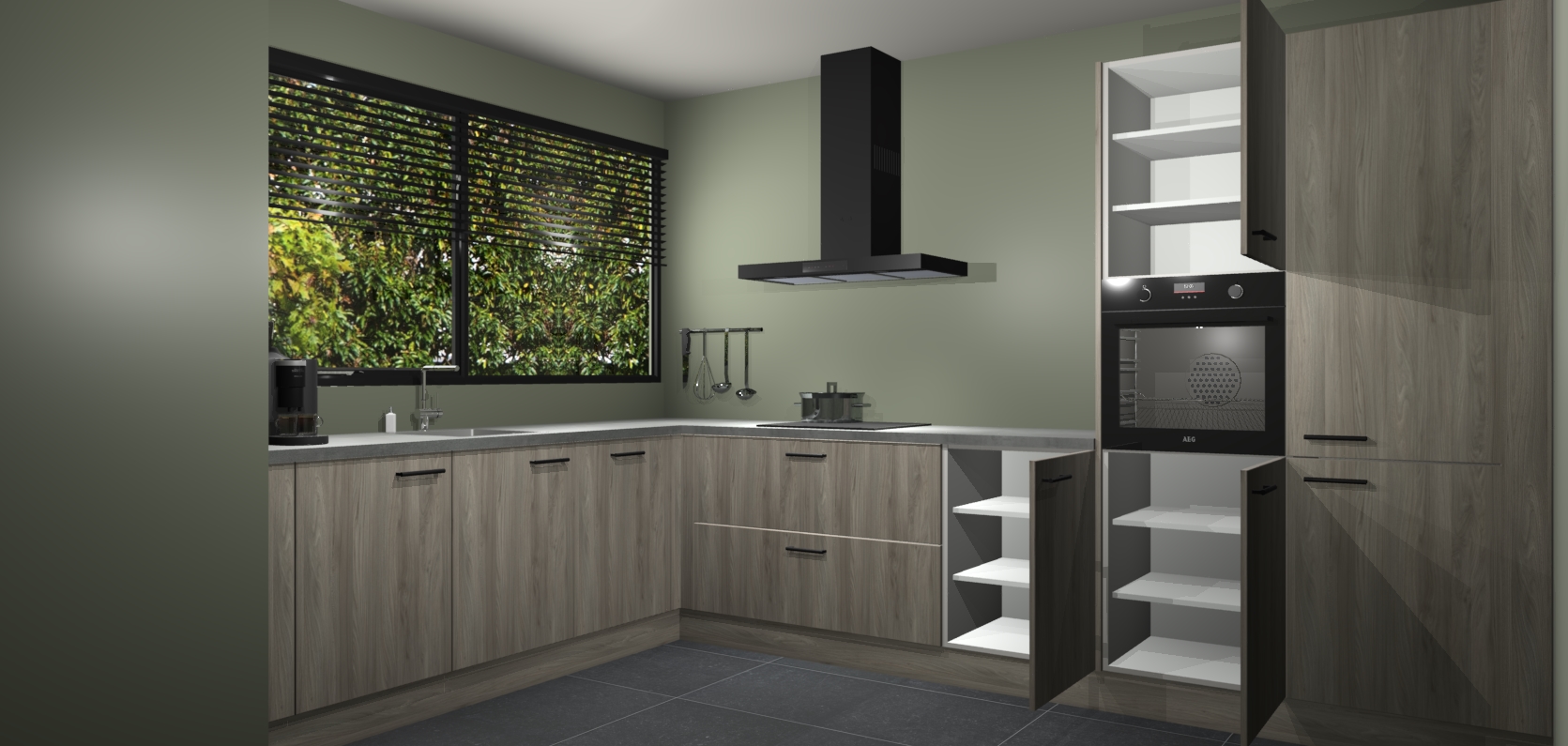Met een modern, tijdloos design en ruime opslagruimte, zult u zich in no-time thuis voelen in uw nieuwe keuken. Uw leven wordt eenvoudiger met de soft-close deuren die voor het ultieme stille comfort zorgen - geen geluid dat u stoort terwijl u kookt. Ook is de keuken voorzien van 5 ingebouwde apparaten: een oven, inductie kookplaat, afzuigkap, vaatwasser en koelkast. Deze kunnen gemakkelijk na bestelling worden bijgewerkt naar AEG - waardoor uw luxe ervaring compleet is.