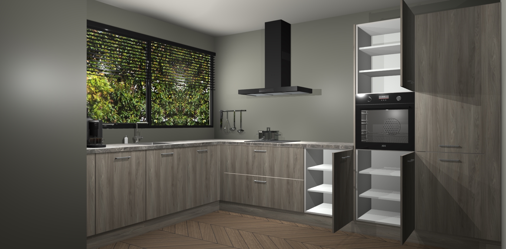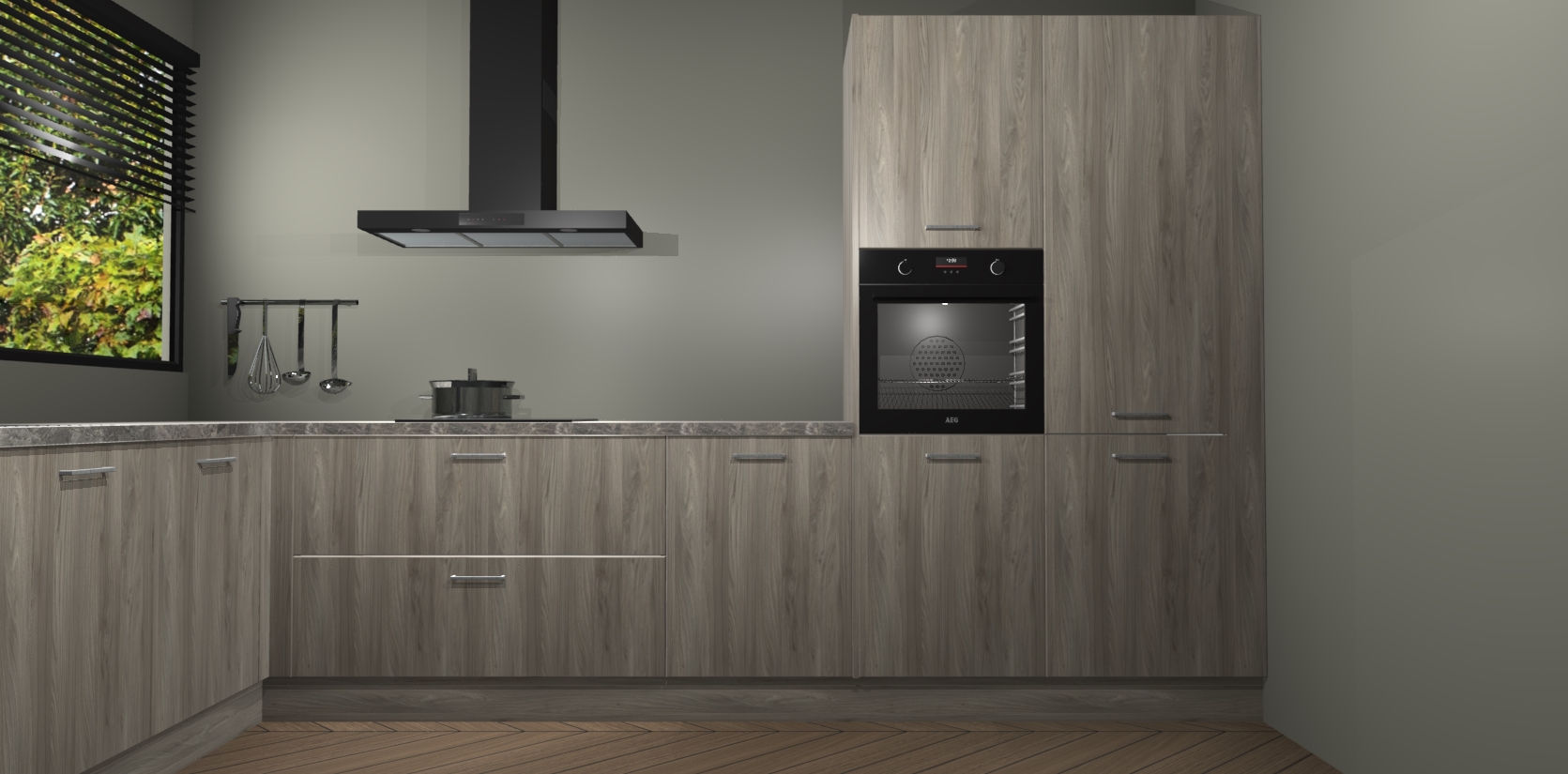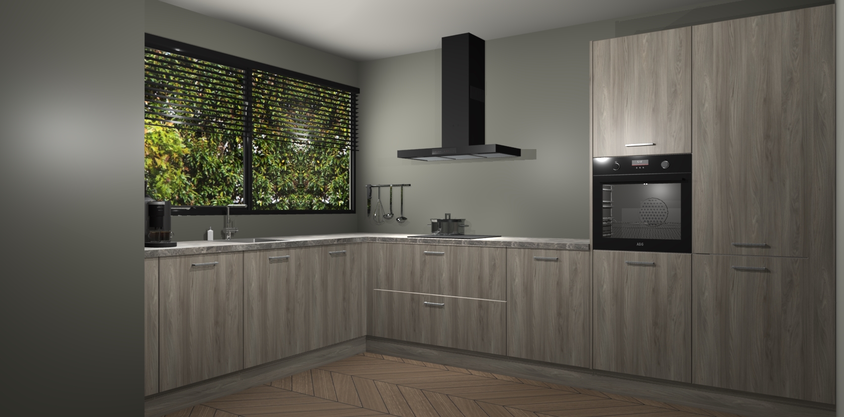 Met een modern, tijdloos design en ruime opslagruimte, zult u zich in no-time thuis voelen in uw nieuwe keuken. Uw leven wordt eenvoudiger met de soft-close deuren die voor het ultieme stille comfort zorgen - geen geluid dat u stoort terwijl u kookt. Ook is de keuken voorzien van 5 ingebouwde apparaten: een oven, inductie kookplaat, afzuigkap, vaatwasser en koelkast. Deze kunnen gemakkelijk na bestelling worden bijgewerkt naar AEG - waardoor uw luxe ervaring compleet is.