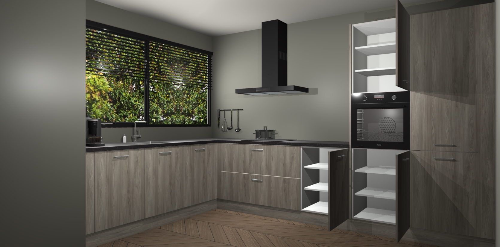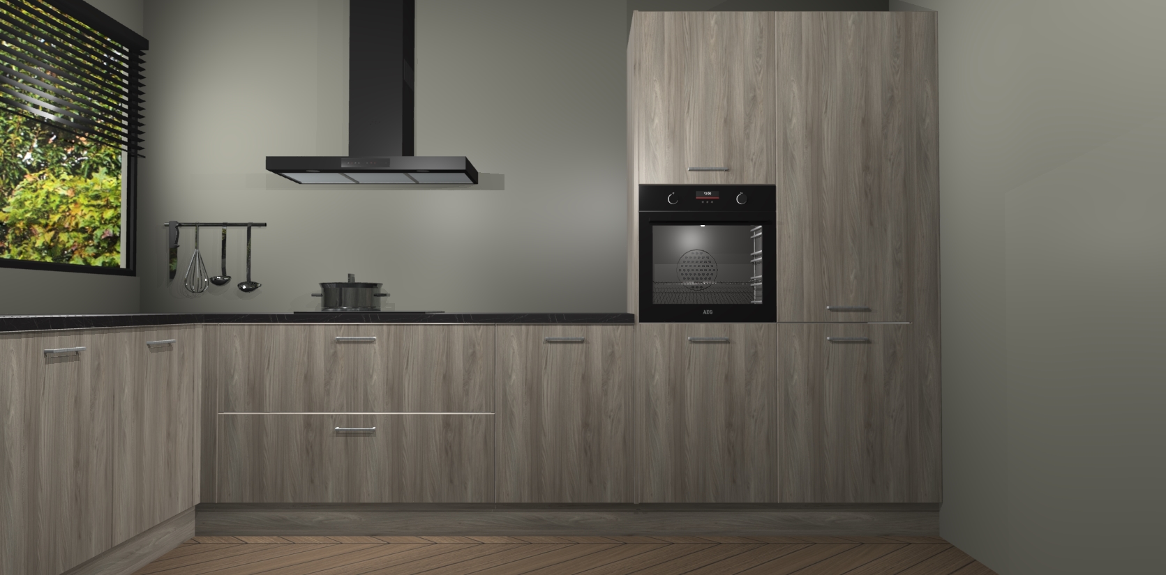 Met een modern, tijdloos design en ruime opslagruimte, zult u zich in no-time thuis voelen in uw nieuwe keuken. Uw leven wordt eenvoudiger met de soft-close deuren die voor het ultieme stille comfort zorgen - geen geluid dat u stoort terwijl u kookt. Ook is de keuken voorzien van 5 ingebouwde apparaten: een oven, inductie kookplaat, afzuigkap, vaatwasser en koelkast. Deze kunnen gemakkelijk na bestelling worden bijgewerkt naar AEG - waardoor uw luxe ervaring compleet is.