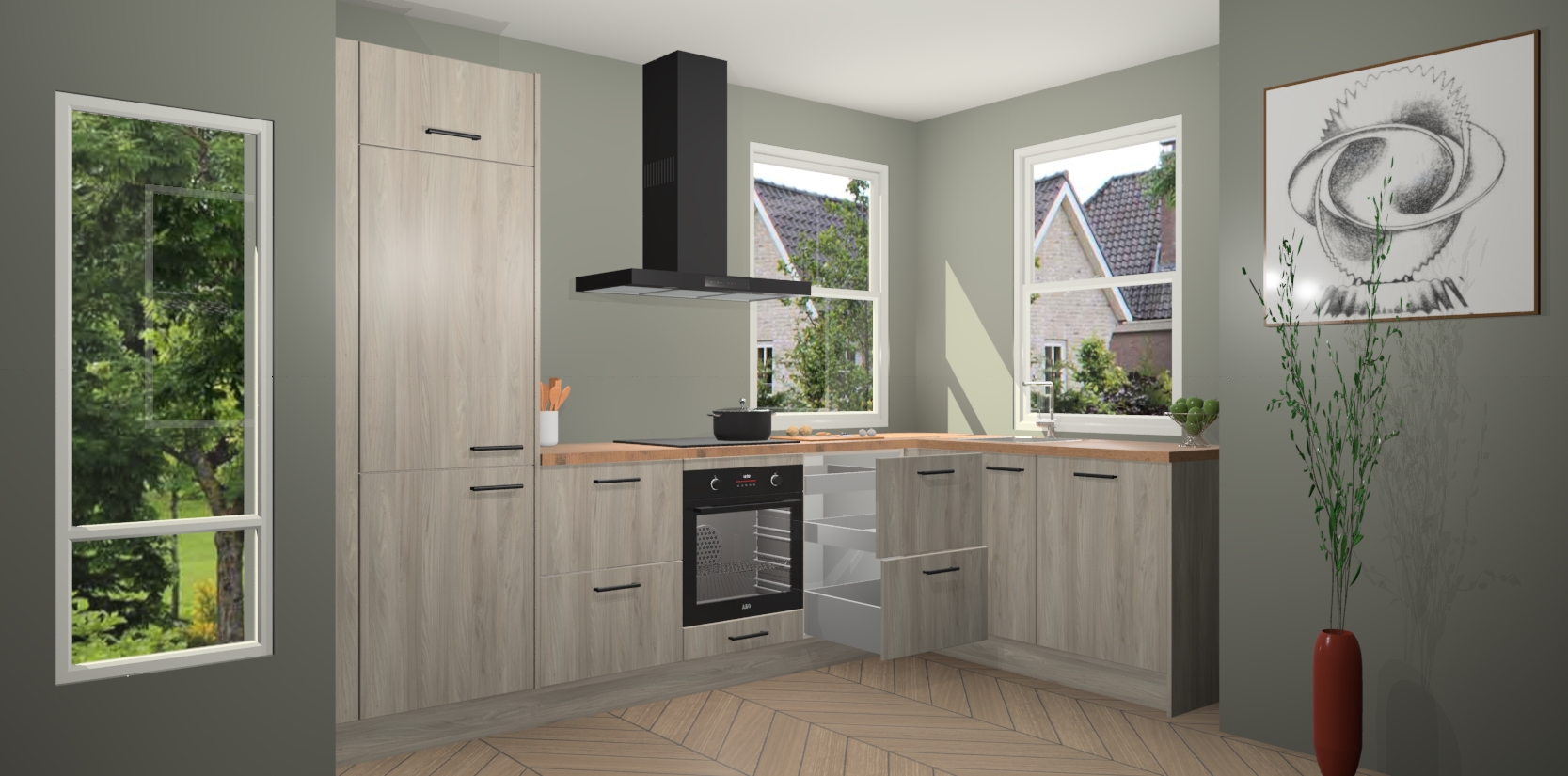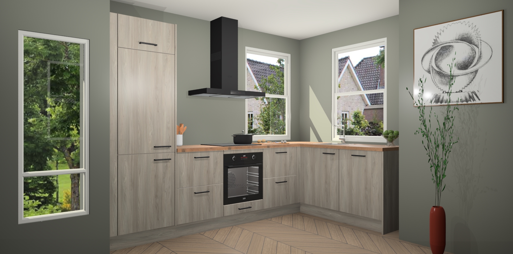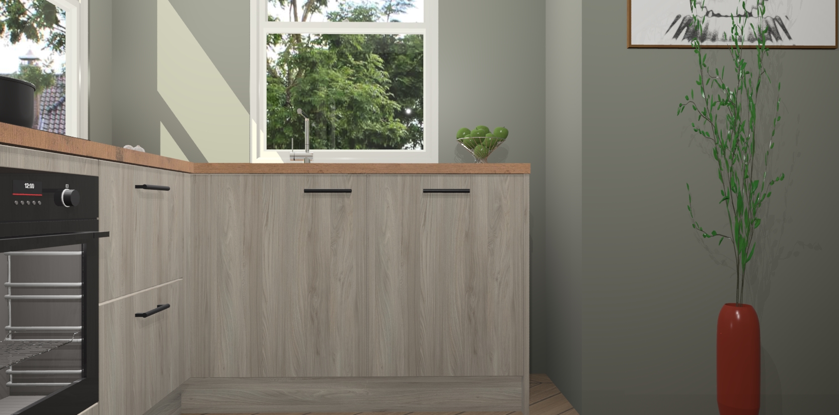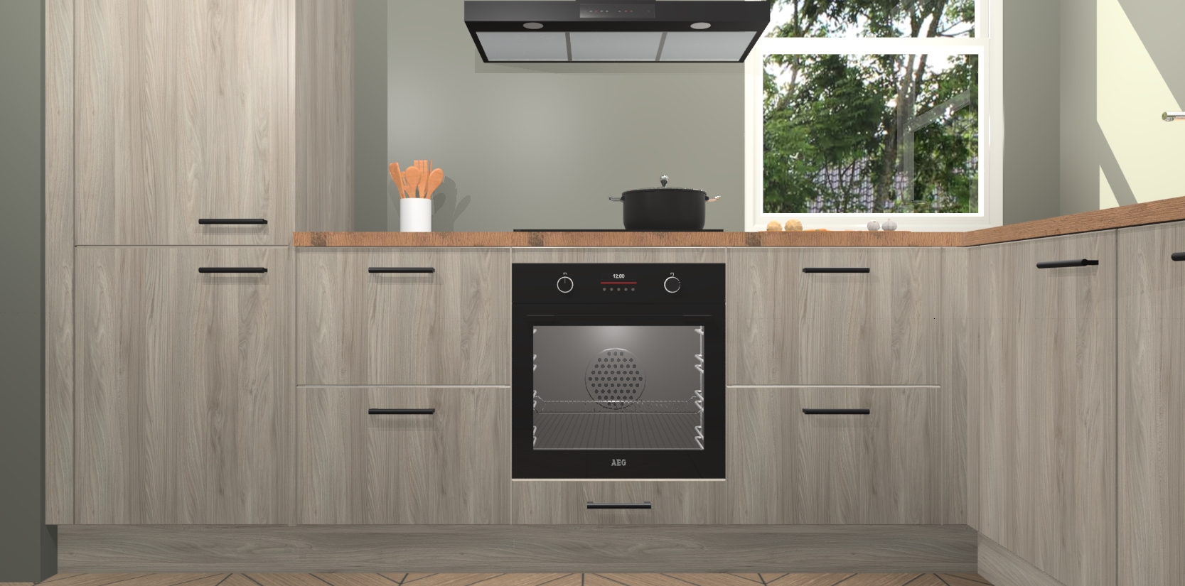 Wat maakt deze keuken zo bijzonder? Ten eerste geeft het houten werkblad uw ruimte een onmiskenbaar klassieke uitstraling. De natuurlijke afwerking roept warmte en elegantie op die nooit uit de mode zullen raken. Bovendien is het gemakkelijk schoon te houden en te onderhouden, zodat je er jarenlang plezier van kunt hebben. Als u op zoek bent naar extra gemak in uw keuken, dan heeft u bij het plaatsen van een bestelling bij ons ook de optie om uw toestellen te upgraden naar AEG-modellen - zo haalt u moderne innovatie van topmerken in apparatentechnologie rechtstreeks in huis.