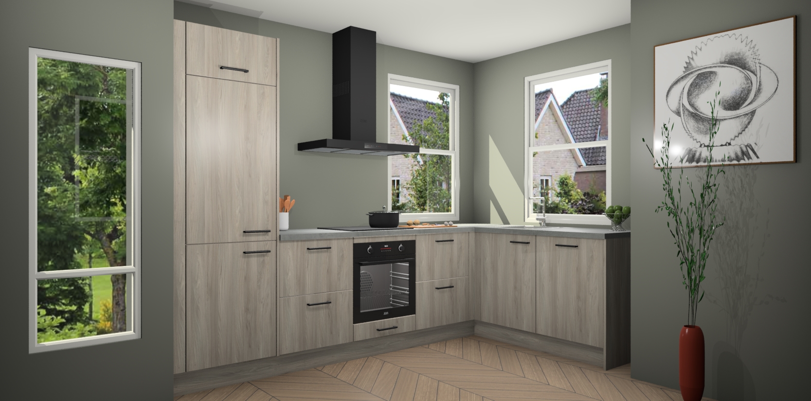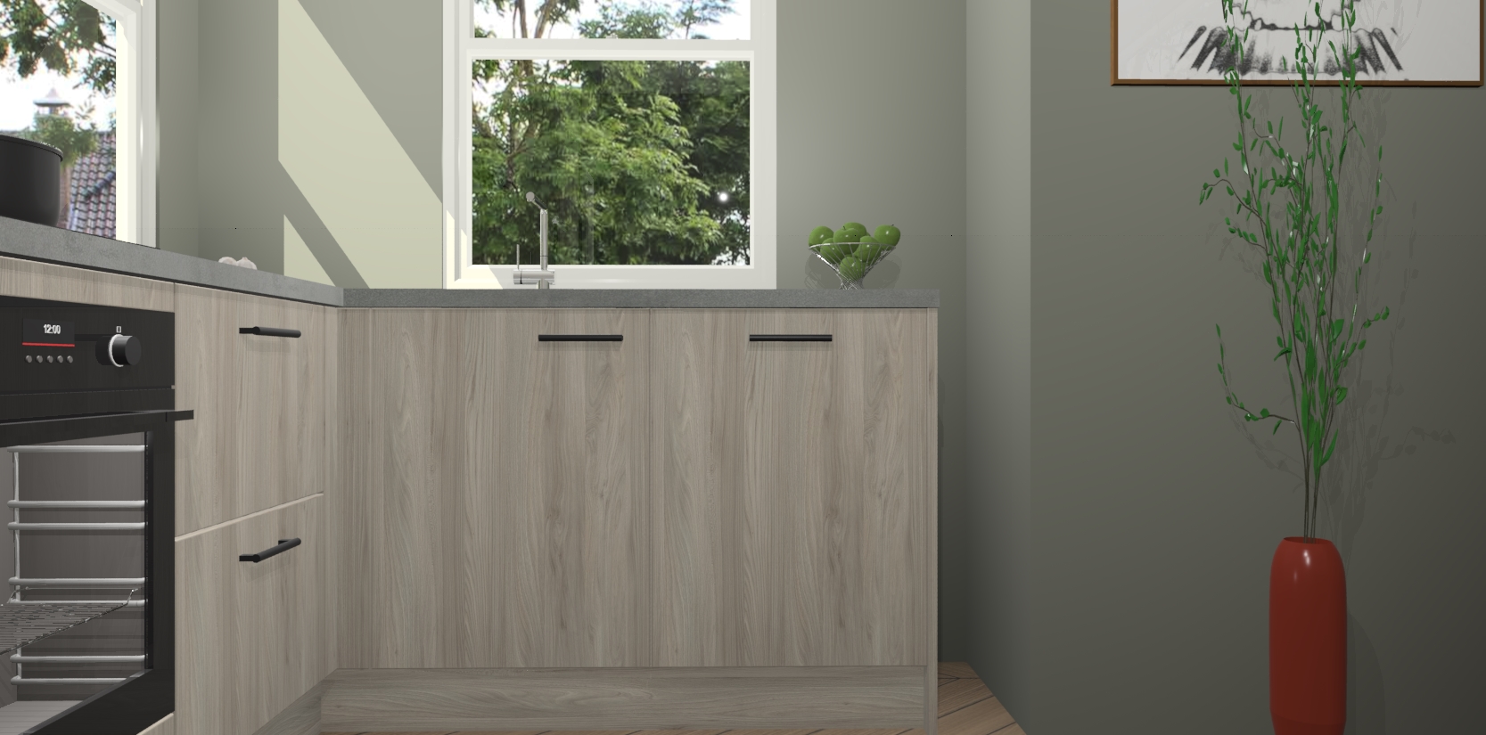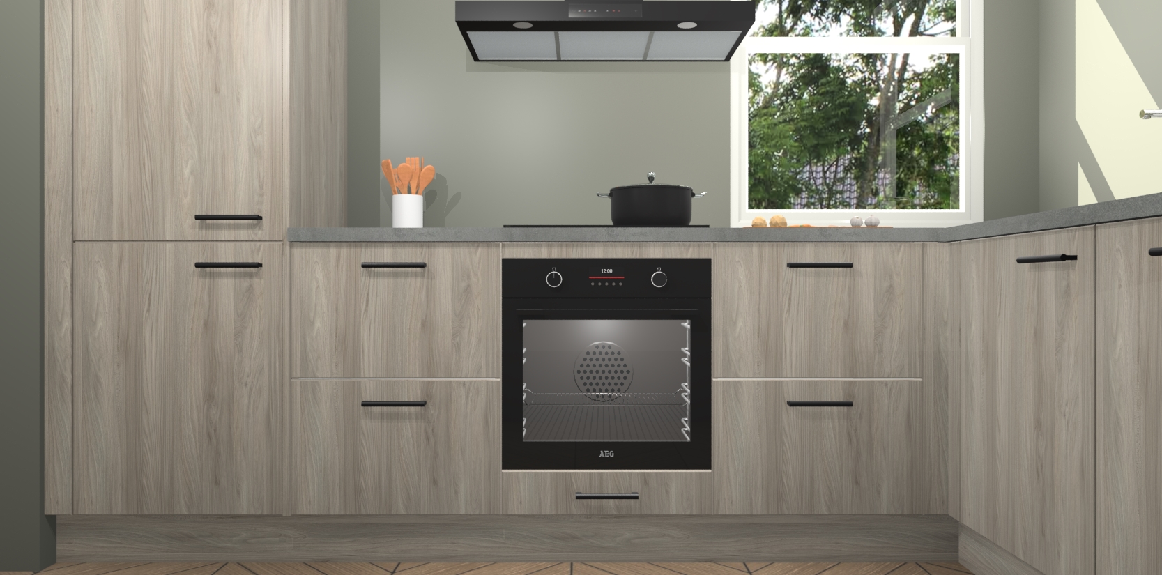 Wat maakt deze keuken zo bijzonder? Ten eerste geeft het houten werkblad uw ruimte een onmiskenbaar klassieke uitstraling. De natuurlijke afwerking roept warmte en elegantie op die nooit uit de mode zullen raken. Bovendien is het gemakkelijk schoon te houden en te onderhouden, zodat je er jarenlang plezier van kunt hebben. Als u op zoek bent naar extra gemak in uw keuken, dan heeft u bij het plaatsen van een bestelling bij ons ook de optie om uw toestellen te upgraden naar AEG-modellen - zo haalt u moderne innovatie van topmerken in apparatentechnologie rechtstreeks in huis.