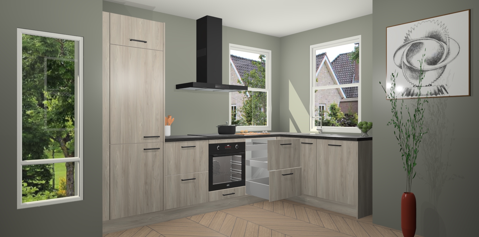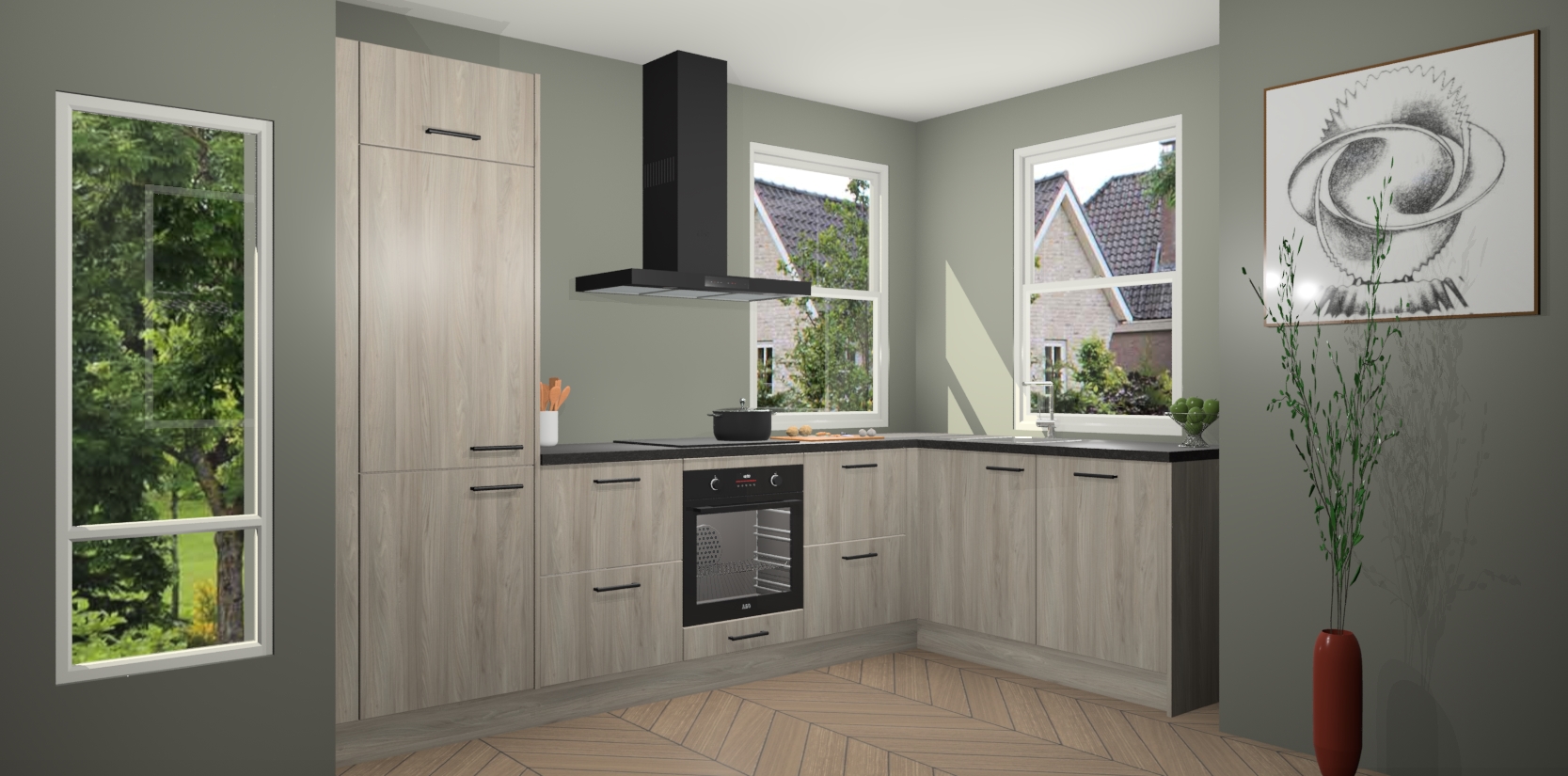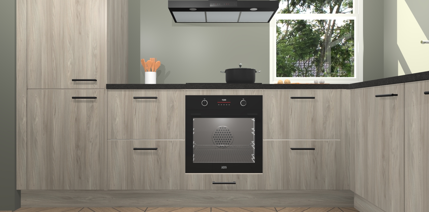 Wat maakt deze keuken zo bijzonder? Ten eerste geeft het houten werkblad uw ruimte een onmiskenbaar klassieke uitstraling. De natuurlijke afwerking roept warmte en elegantie op die nooit uit de mode zullen raken. Bovendien is het gemakkelijk schoon te houden en te onderhouden, zodat je er jarenlang plezier van kunt hebben. Als u op zoek bent naar extra gemak in uw keuken, dan heeft u bij het plaatsen van een bestelling bij ons ook de optie om uw toestellen te upgraden naar AEG-modellen - zo haalt u moderne innovatie van topmerken in apparatentechnologie rechtstreeks in huis.