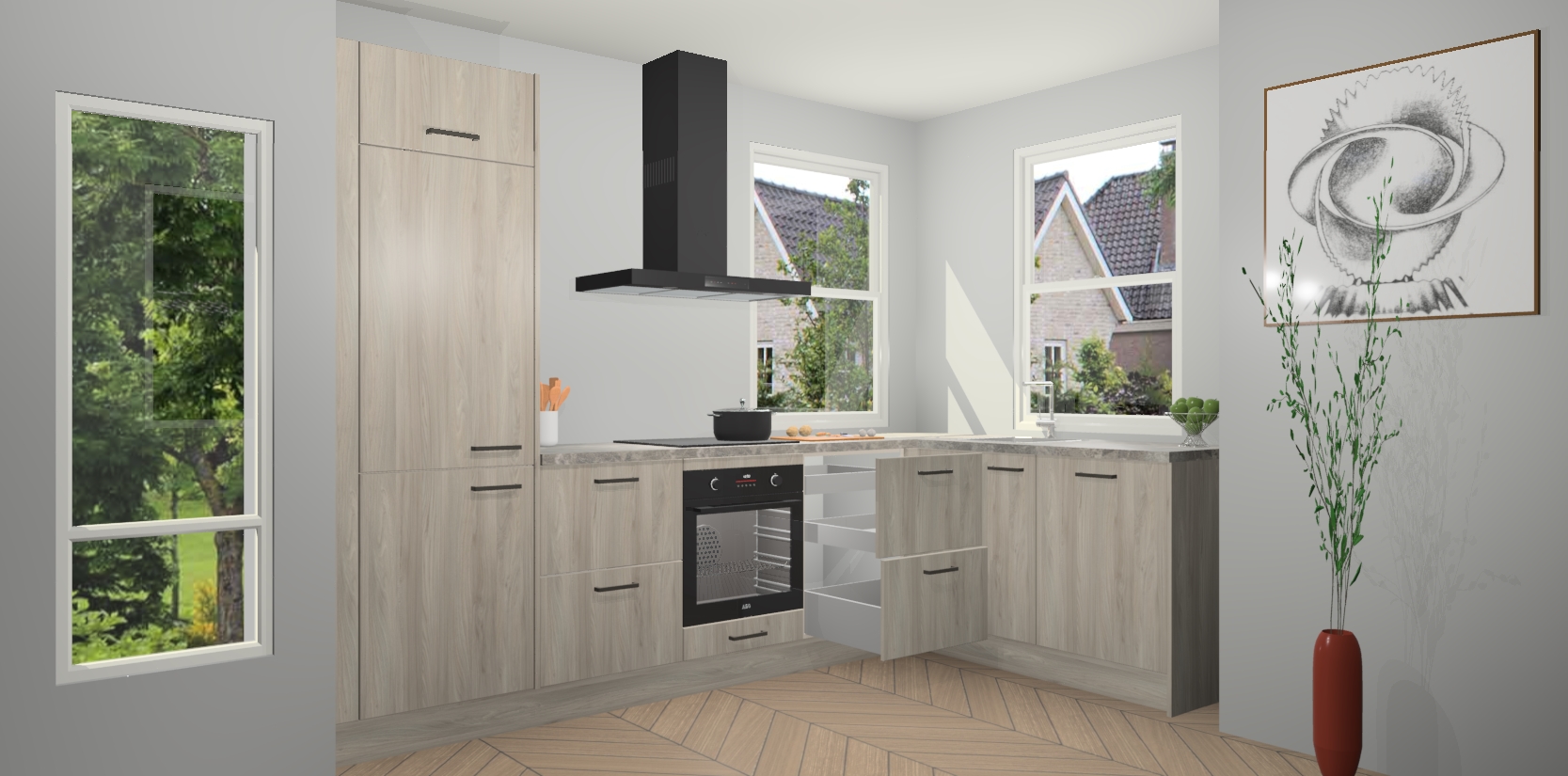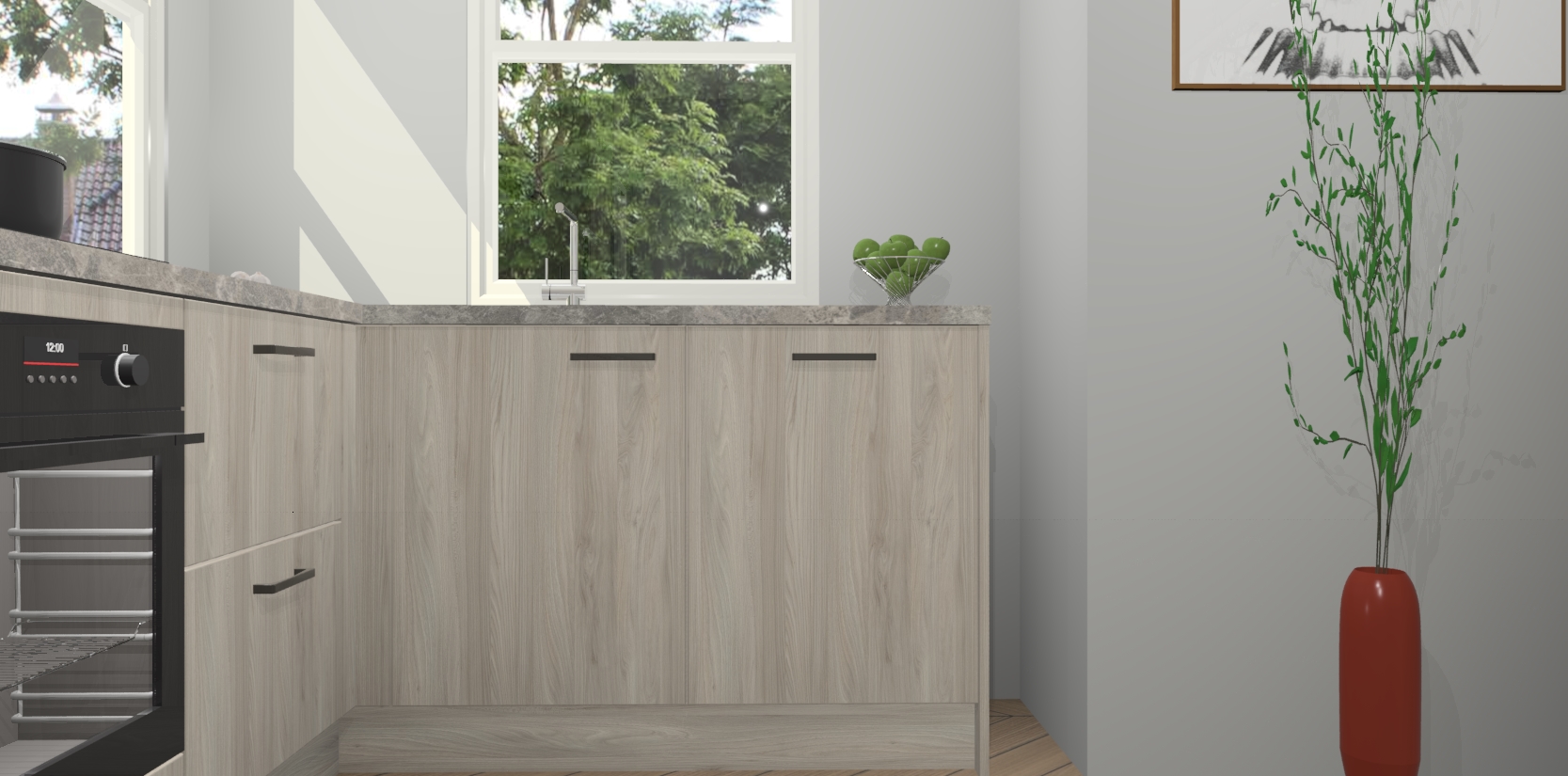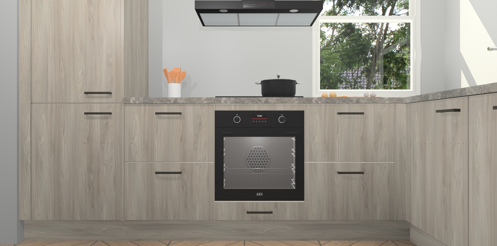 Wat maakt deze keuken zo bijzonder? Ten eerste geeft het houten werkblad uw ruimte een onmiskenbaar klassieke uitstraling. De natuurlijke afwerking roept warmte en elegantie op die nooit uit de mode zullen raken. Bovendien is het gemakkelijk schoon te houden en te onderhouden, zodat je er jarenlang plezier van kunt hebben. Als u op zoek bent naar extra gemak in uw keuken, dan heeft u bij het plaatsen van een bestelling bij ons ook de optie om uw toestellen te upgraden naar AEG-modellen - zo haalt u moderne innovatie van topmerken in apparatentechnologie rechtstreeks in huis.