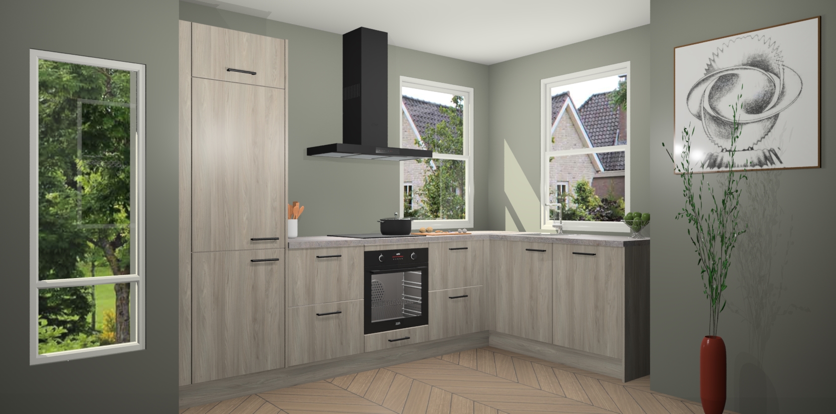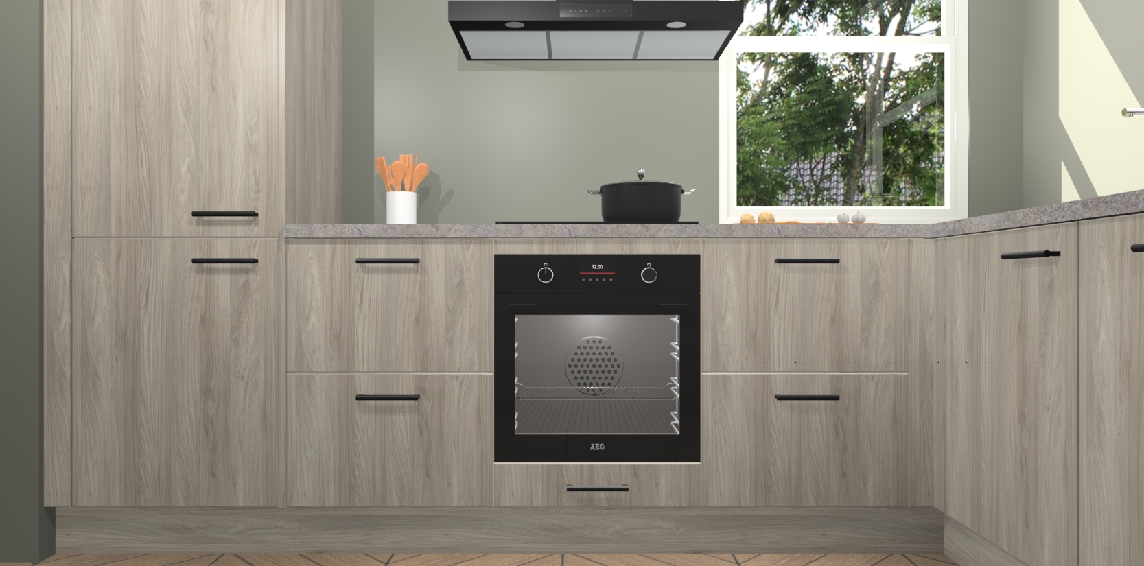 Wat maakt deze keuken zo bijzonder? Ten eerste geeft het houten werkblad uw ruimte een onmiskenbaar klassieke uitstraling. De natuurlijke afwerking roept warmte en elegantie op die nooit uit de mode zullen raken. Bovendien is het gemakkelijk schoon te houden en te onderhouden, zodat je er jarenlang plezier van kunt hebben. Als u op zoek bent naar extra gemak in uw keuken, dan heeft u bij het plaatsen van een bestelling bij ons ook de optie om uw toestellen te upgraden naar AEG-modellen - zo haalt u moderne innovatie van topmerken in apparatentechnologie rechtstreeks in huis.