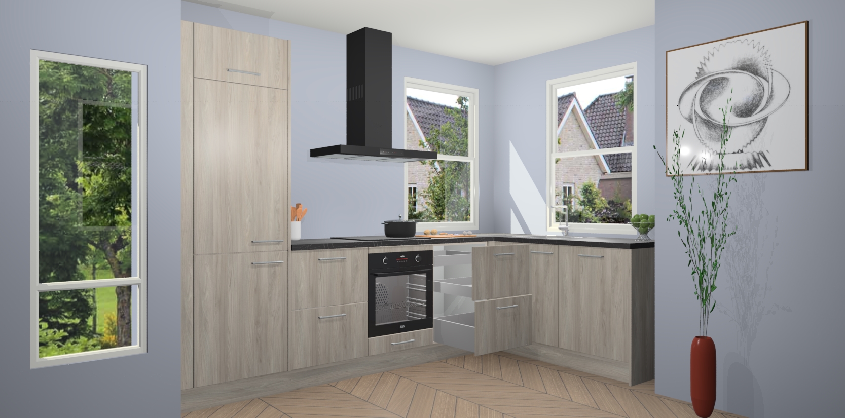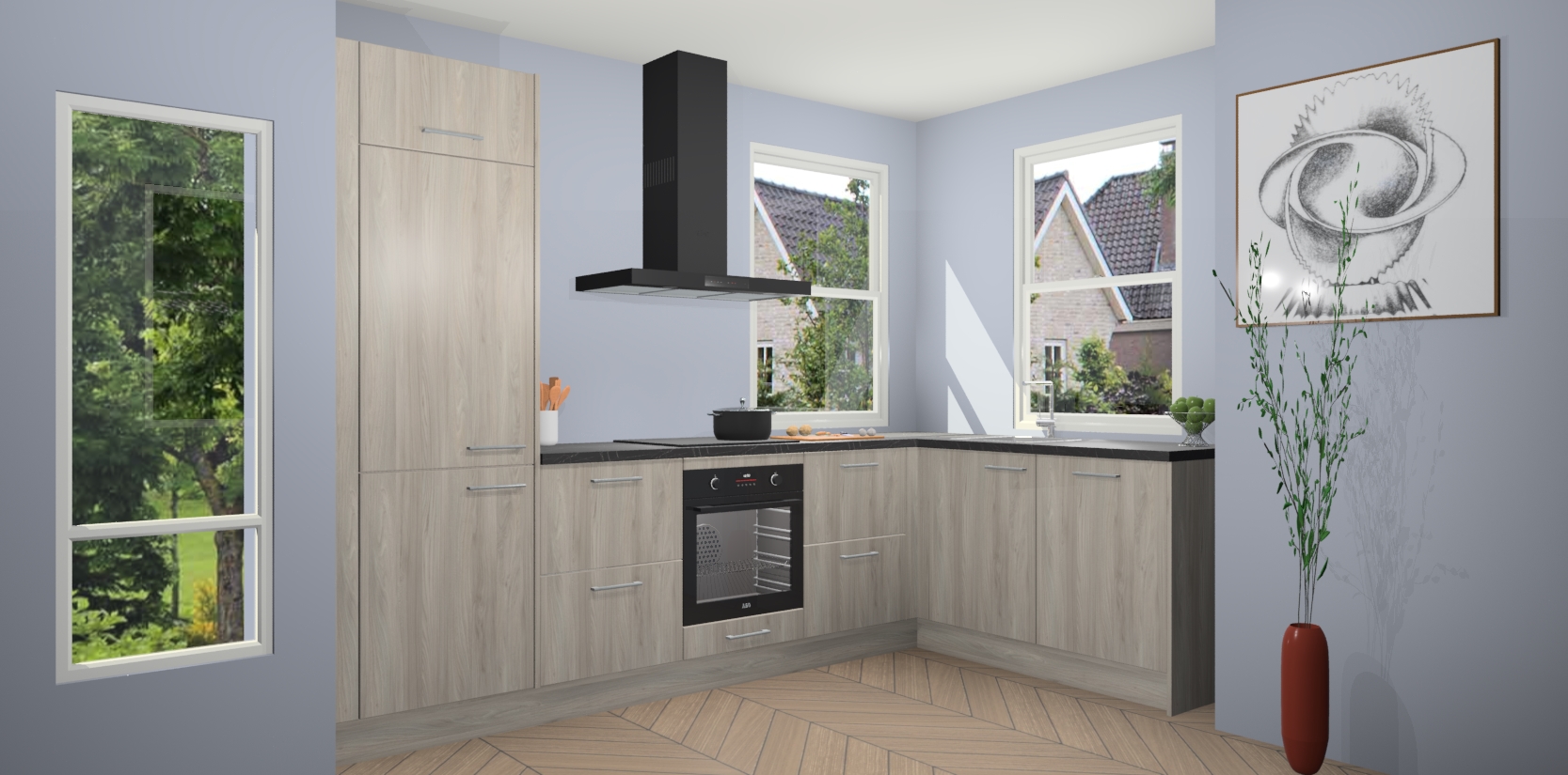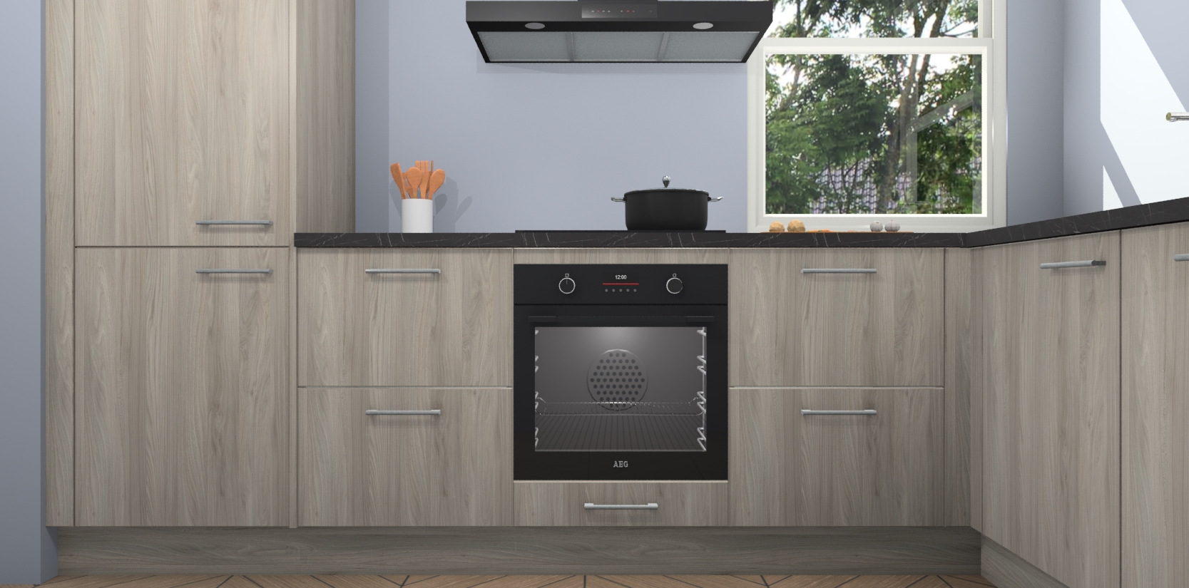 Wat maakt deze keuken zo bijzonder? Ten eerste geeft het houten werkblad uw ruimte een onmiskenbaar klassieke uitstraling. De natuurlijke afwerking roept warmte en elegantie op die nooit uit de mode zullen raken. Bovendien is het gemakkelijk schoon te houden en te onderhouden, zodat je er jarenlang plezier van kunt hebben. Als u op zoek bent naar extra gemak in uw keuken, dan heeft u bij het plaatsen van een bestelling bij ons ook de optie om uw toestellen te upgraden naar AEG-modellen - zo haalt u moderne innovatie van topmerken in apparatentechnologie rechtstreeks in huis.