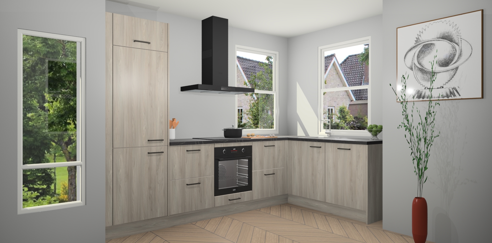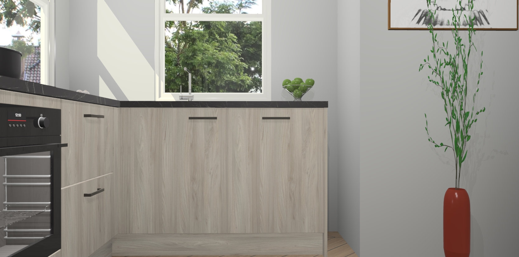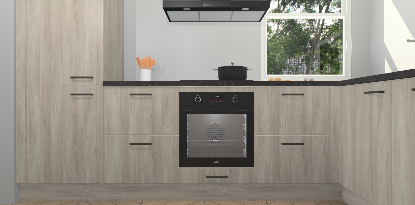Wat maakt deze keuken zo bijzonder? Ten eerste geeft het houten werkblad uw ruimte een onmiskenbaar klassieke uitstraling. De natuurlijke afwerking roept warmte en elegantie op die nooit uit de mode zullen raken. Bovendien is het gemakkelijk schoon te houden en te onderhouden, zodat je er jarenlang plezier van kunt hebben. Als u op zoek bent naar extra gemak in uw keuken, dan heeft u bij het plaatsen van een bestelling bij ons ook de optie om uw toestellen te upgraden naar AEG-modellen - zo haalt u moderne innovatie van topmerken in apparatentechnologie rechtstreeks in huis.