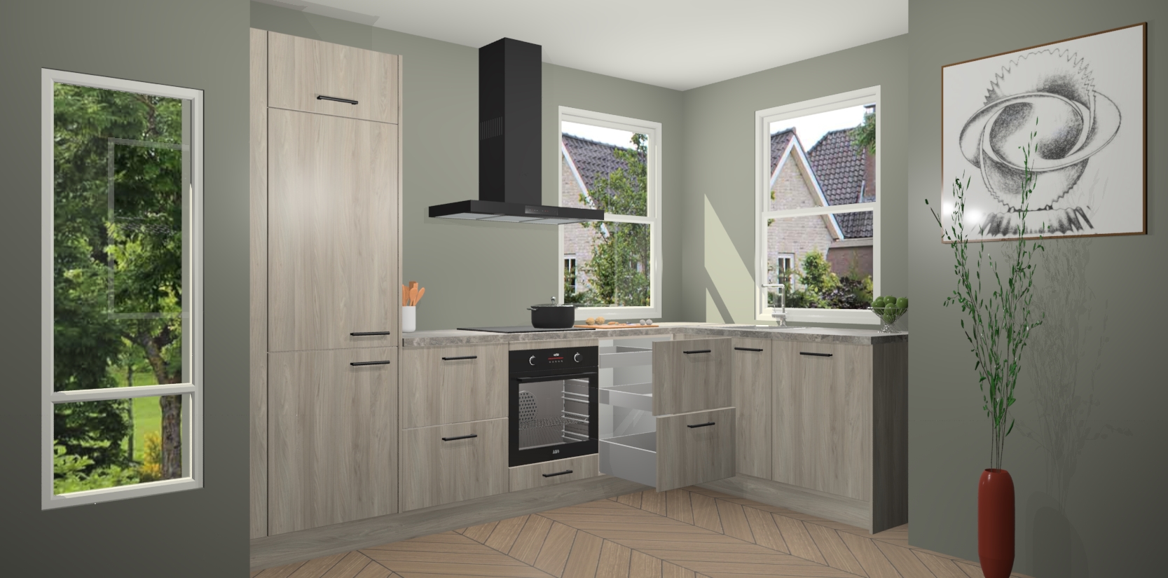Wat maakt deze keuken zo bijzonder? Ten eerste geeft het houten werkblad uw ruimte een onmiskenbaar klassieke uitstraling. De natuurlijke afwerking roept warmte en elegantie op die nooit uit de mode zullen raken. Bovendien is het gemakkelijk schoon te houden en te onderhouden, zodat je er jarenlang plezier van kunt hebben. Als u op zoek bent naar extra gemak in uw keuken, dan heeft u bij het plaatsen van een bestelling bij ons ook de optie om uw toestellen te upgraden naar AEG-modellen - zo haalt u moderne innovatie van topmerken in apparatentechnologie rechtstreeks in huis.