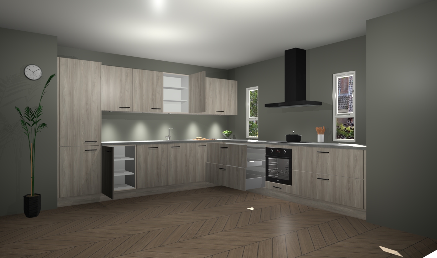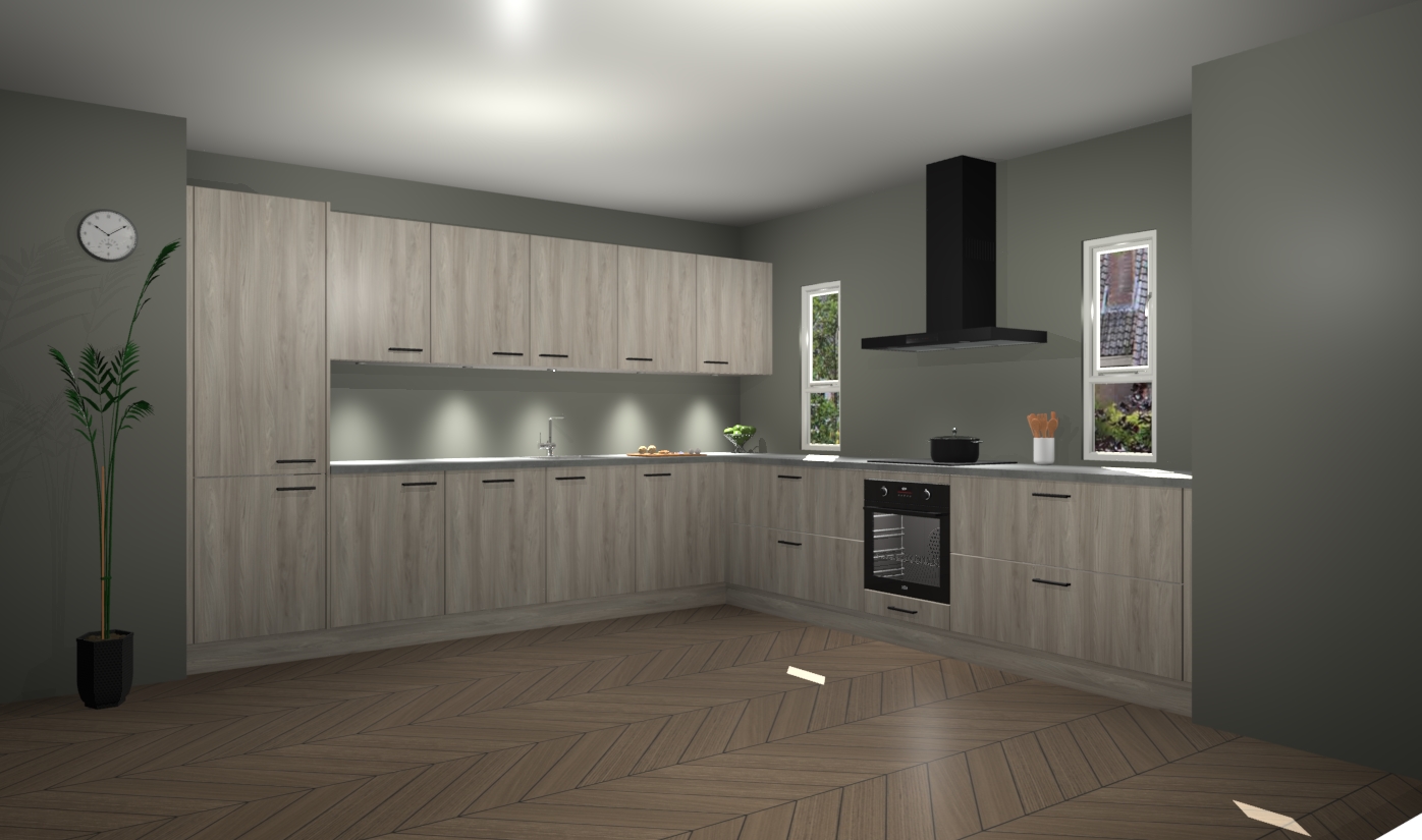 De olm keuken is een ideale hoekkeuken en heeft alle functies en apparatuur die u maar nodig kunt hebben. Bij de bestelling krijgt u een oven, inductiekookplaat, afzuigkap, vaatwasser en koelkast - deze kunnen desgewenst eenvoudig worden uitgebreid naar AEG na bestellen. Elke kast wordt ook voor gemonteerd geleverd met soft close deuren die jarenlang gebruik beloven. Stelt u zich voor dat u geen gedoe heeft met vervelende montage - vanaf het moment dat u uw bestelling plaats, duurt het slechts 7 weken voor het bij u thuis geleverd wordt.