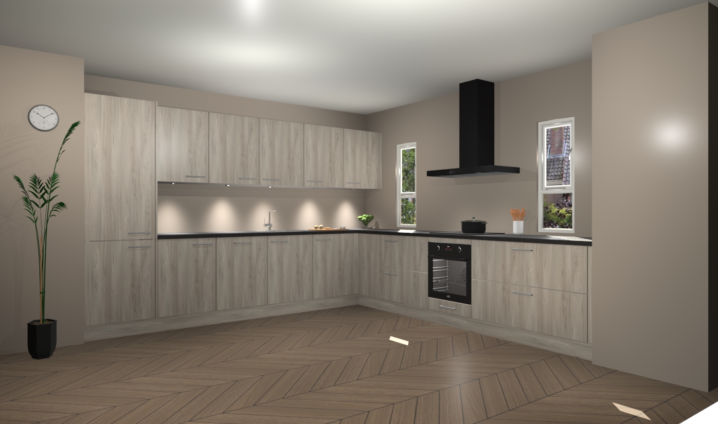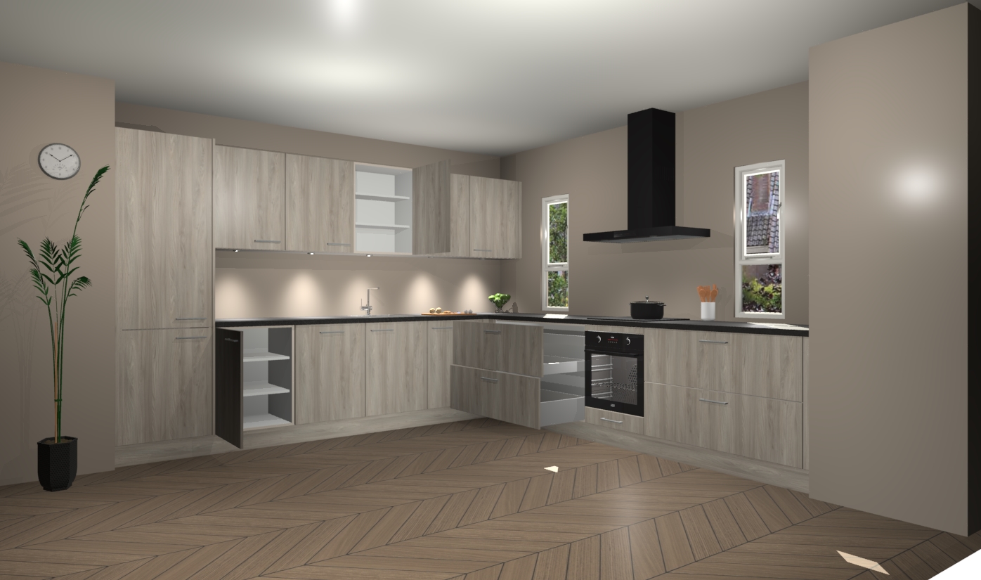 De olm keuken is een ideale hoekkeuken en heeft alle functies en apparatuur die u maar nodig kunt hebben. Bij de bestelling krijgt u een oven, inductiekookplaat, afzuigkap, vaatwasser en koelkast - deze kunnen desgewenst eenvoudig worden uitgebreid naar AEG na bestellen. Elke kast wordt ook voor gemonteerd geleverd met soft close deuren die jarenlang gebruik beloven. Stelt u zich voor dat u geen gedoe heeft met vervelende montage - vanaf het moment dat u uw bestelling plaats, duurt het slechts 7 weken voor het bij u thuis geleverd wordt.
