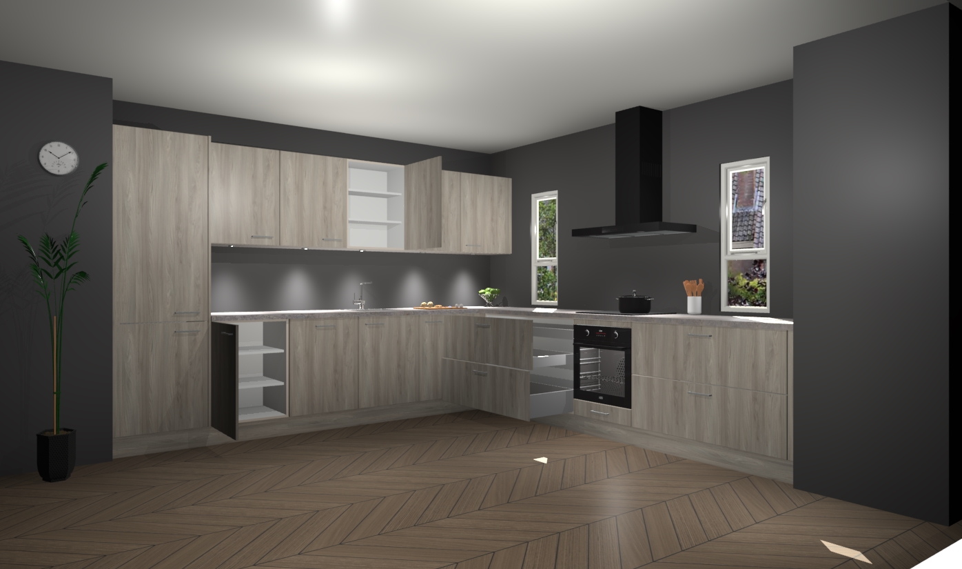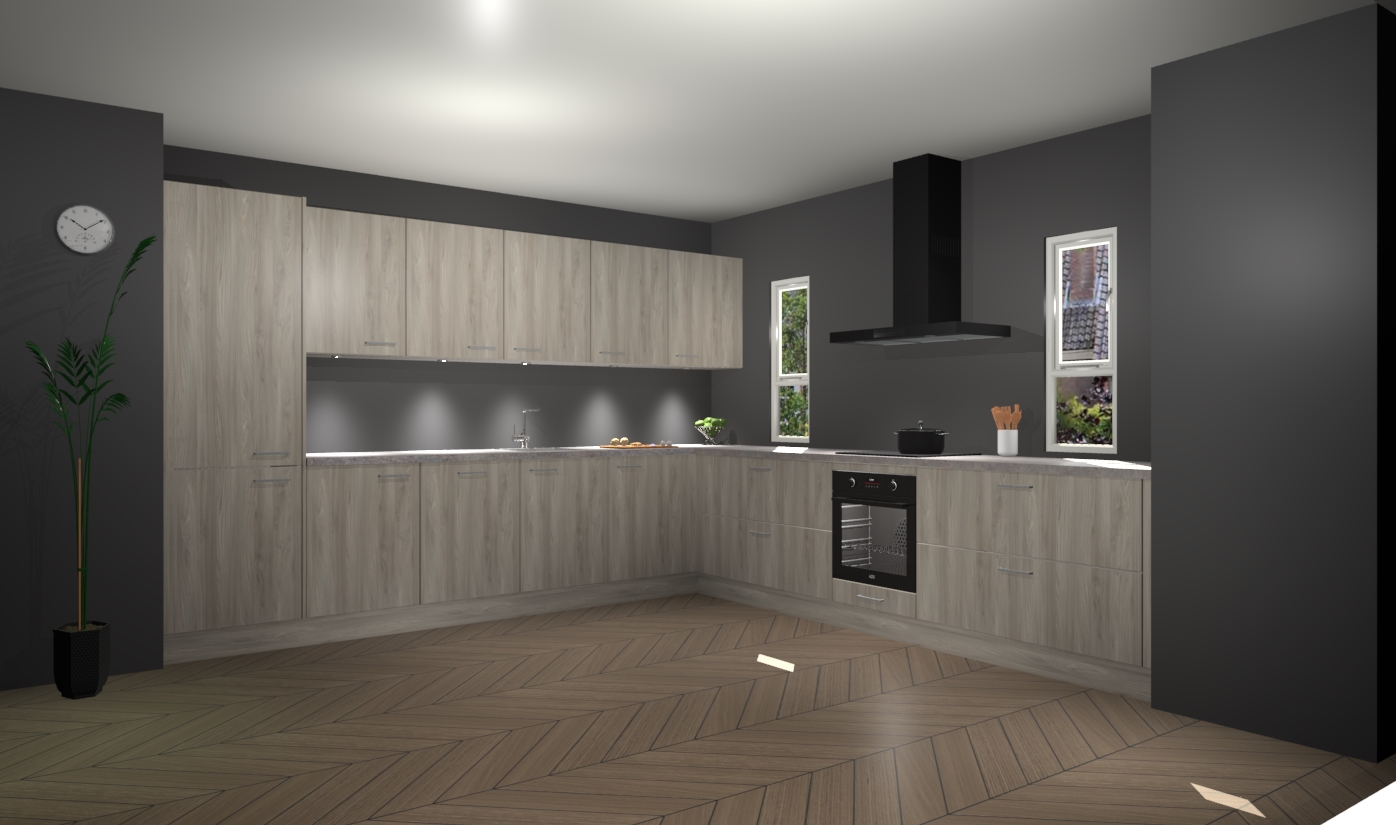 De olm keuken is een ideale hoekkeuken en heeft alle functies en apparatuur die u maar nodig kunt hebben. Bij de bestelling krijgt u een oven, inductiekookplaat, afzuigkap, vaatwasser en koelkast - deze kunnen desgewenst eenvoudig worden uitgebreid naar AEG na bestellen. Elke kast wordt ook voor gemonteerd geleverd met soft close deuren die jarenlang gebruik beloven. Stelt u zich voor dat u geen gedoe heeft met vervelende montage - vanaf het moment dat u uw bestelling plaats, duurt het slechts 7 weken voor het bij u thuis geleverd wordt.