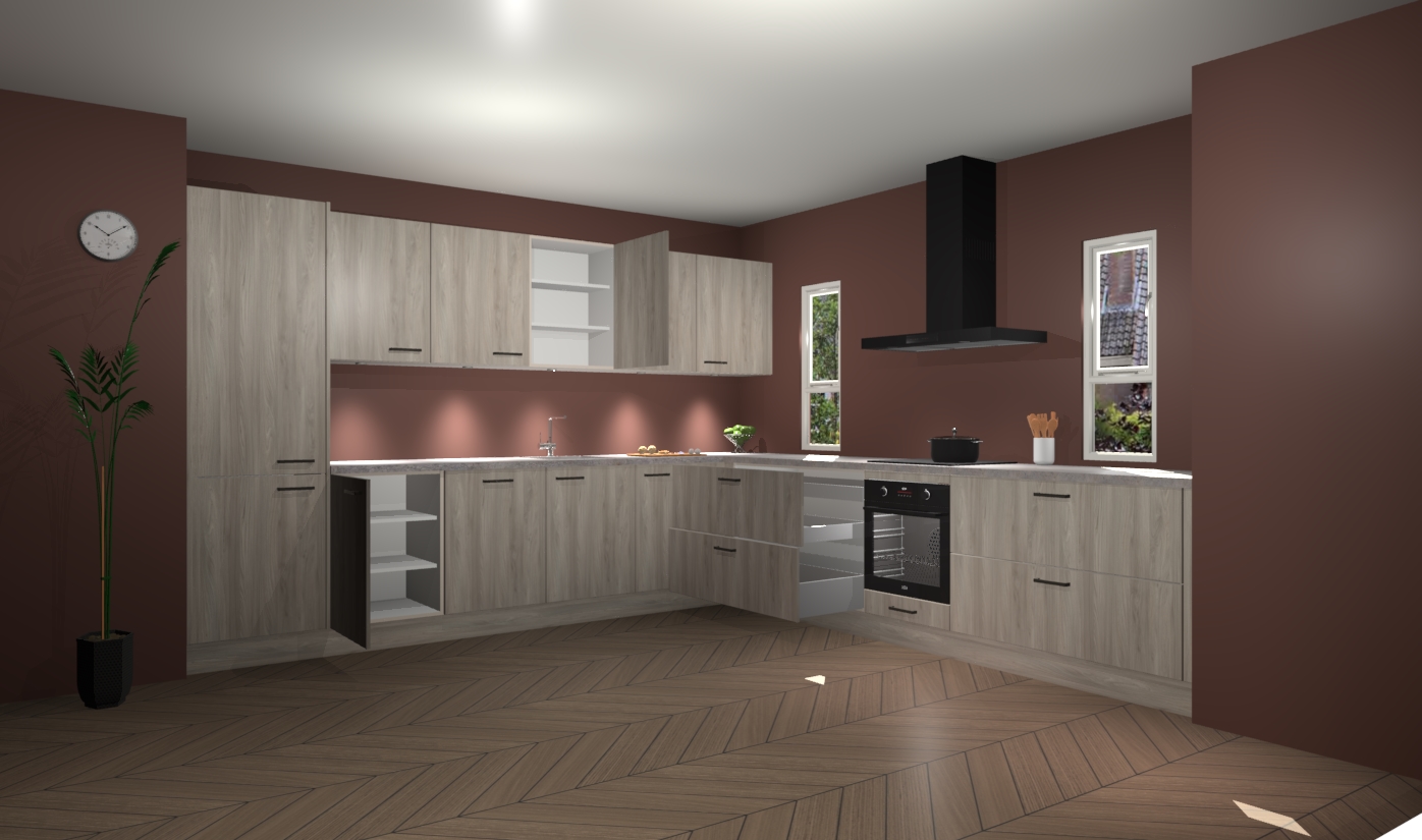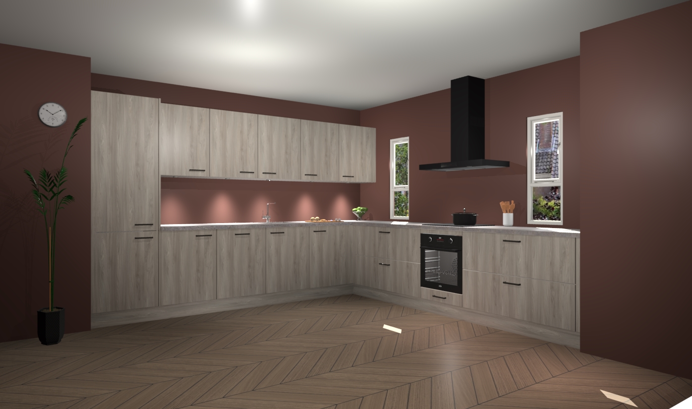 De olm keuken is een ideale hoekkeuken en heeft alle functies en apparatuur die u maar nodig kunt hebben. Bij de bestelling krijgt u een oven, inductiekookplaat, afzuigkap, vaatwasser en koelkast - deze kunnen desgewenst eenvoudig worden uitgebreid naar AEG na bestellen. Elke kast wordt ook voor gemonteerd geleverd met soft close deuren die jarenlang gebruik beloven. Stelt u zich voor dat u geen gedoe heeft met vervelende montage - vanaf het moment dat u uw bestelling plaats, duurt het slechts 7 weken voor het bij u thuis geleverd wordt.