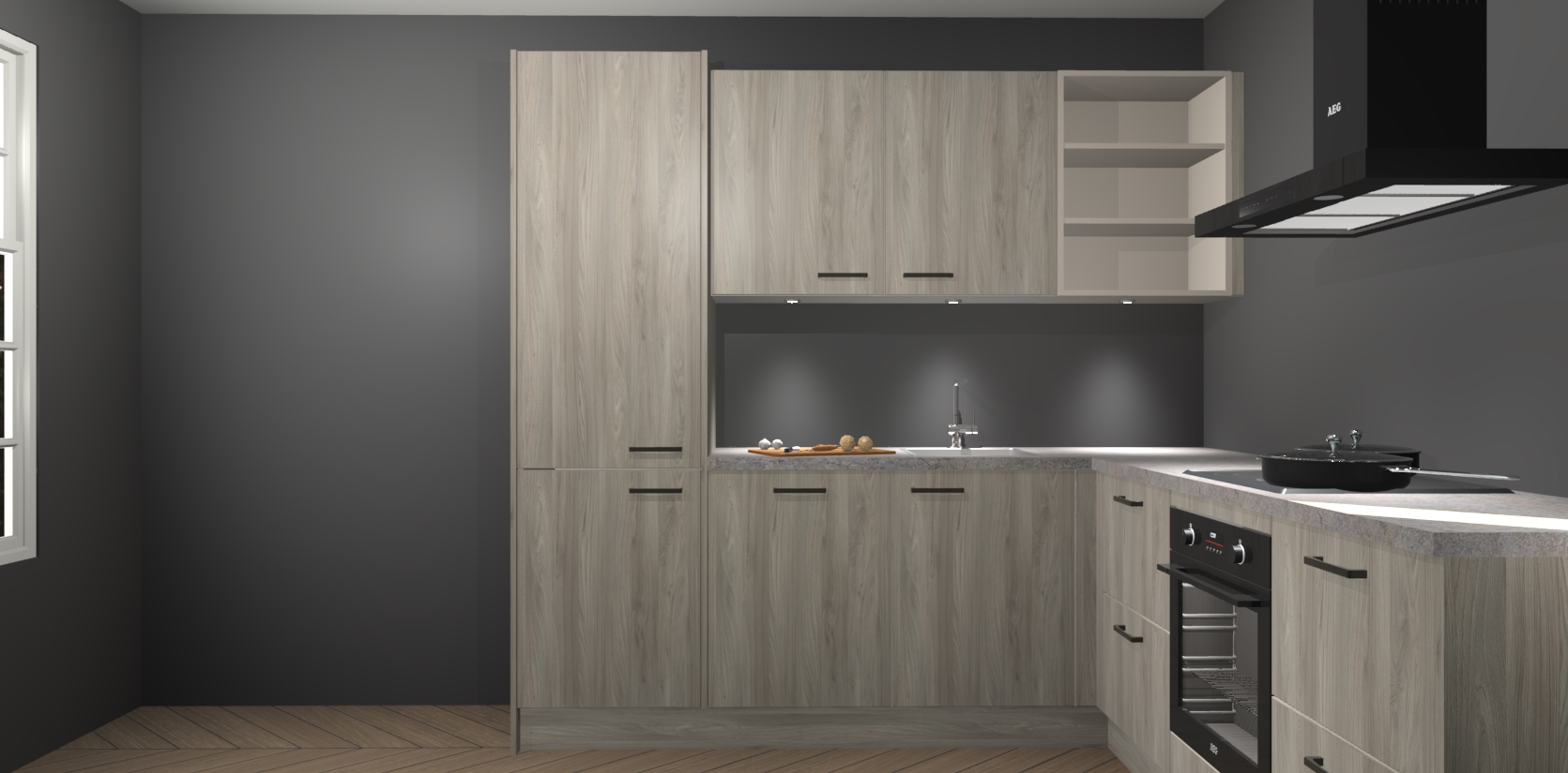 Met zijn moderne design en aantrekkelijke hoekopstelling biedt deze keuken een unieke look die zelfs de meest veeleisende huiseigenaar zal bevallen. En omdat de binnenkant van de kasten dezelfde kleur heeft als de buitenkant, heeft uw keuken een consistente afwerking. Bovenop de geweldige look is opbergruimte ook geen probleem, met voldoende kast- en laderuimte achter zelfs de mooiste buitenkant.