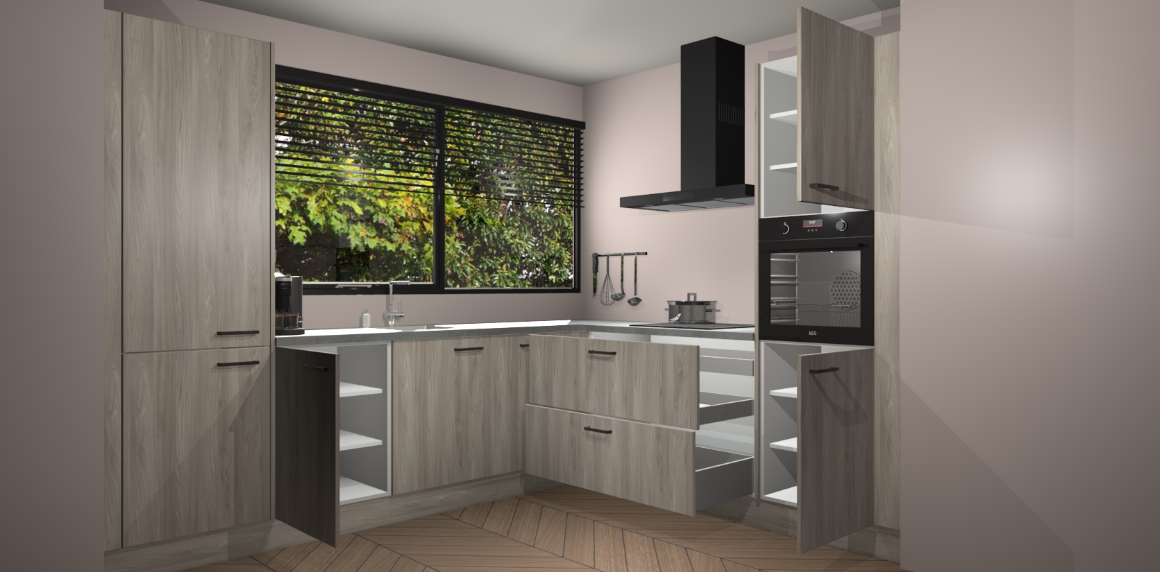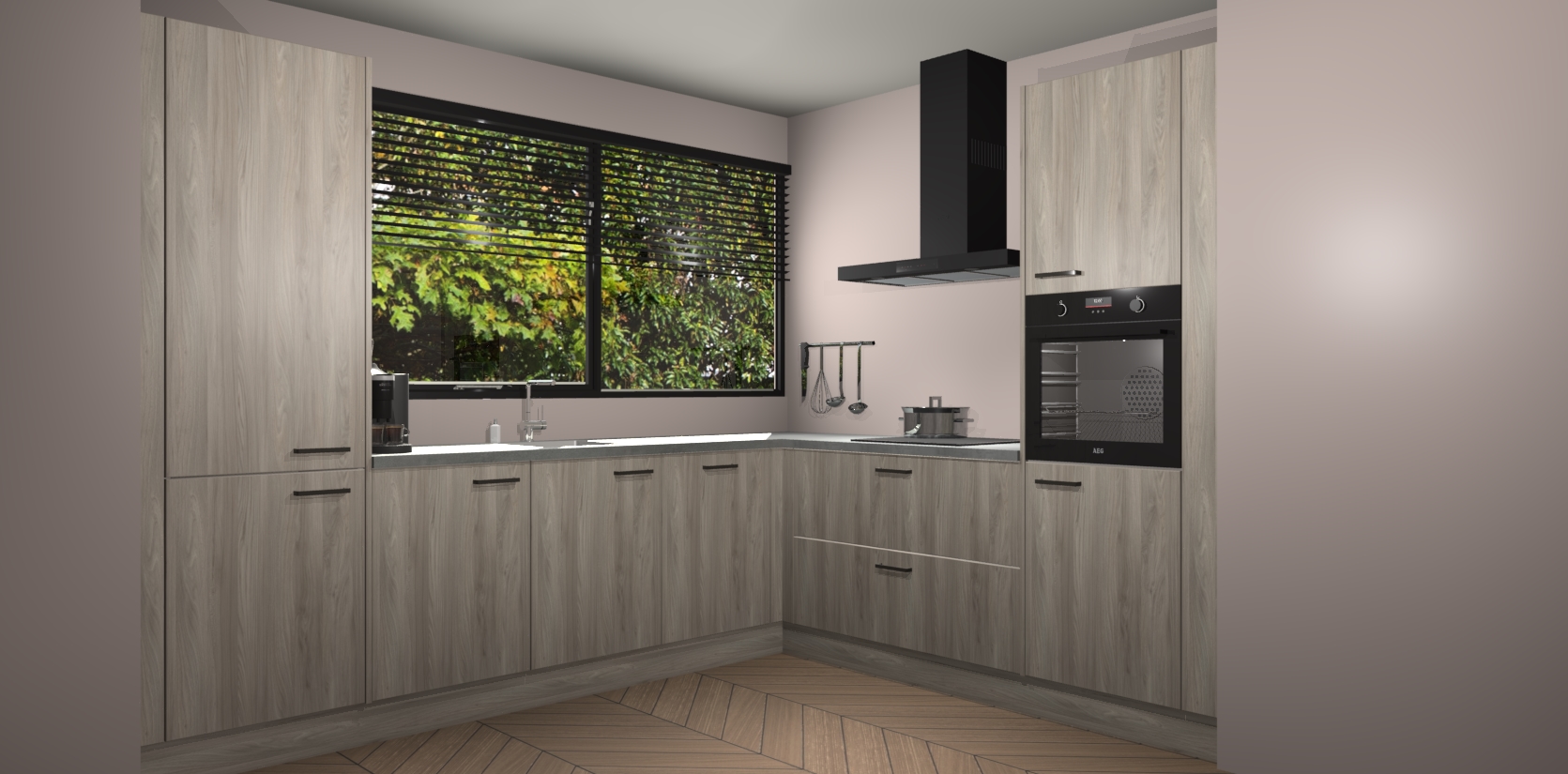 Met een modern, tijdloos design en ruime opslagruimte, zult u zich in no-time thuis voelen in uw nieuwe keuken. Uw leven wordt eenvoudiger met de soft-close deuren die voor het ultieme stille comfort zorgen - geen geluid dat u stoort terwijl u kookt. Ook is de keuken voorzien van 5 ingebouwde apparaten: een oven, inductie kookplaat, afzuigkap, vaatwasser en koelkast. Deze kunnen gemakkelijk na bestelling worden bijgewerkt naar AEG - waardoor uw luxe ervaring compleet is.