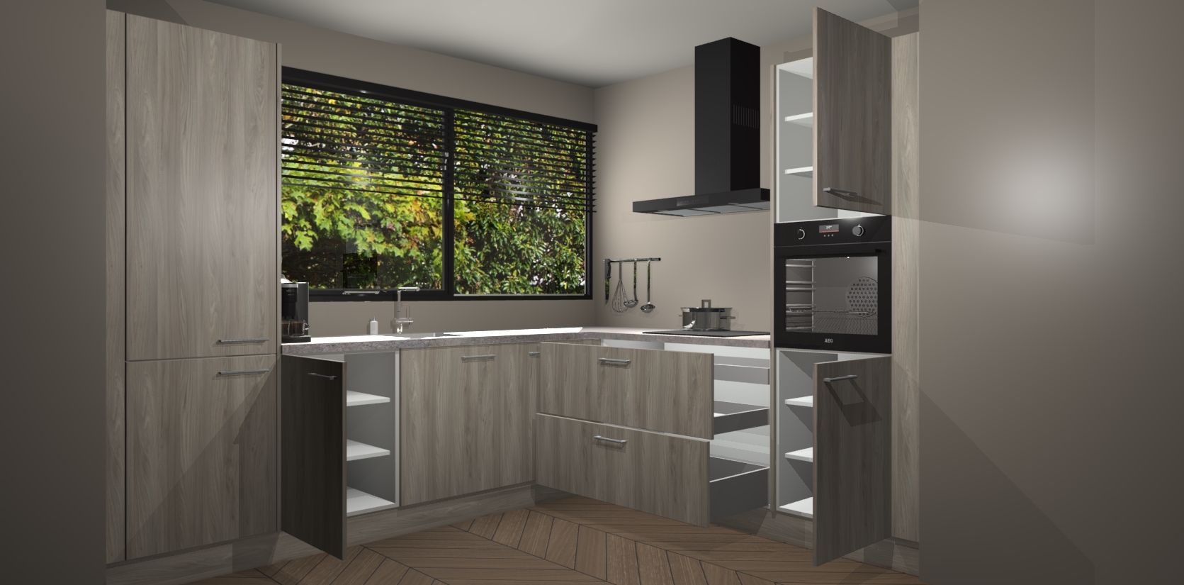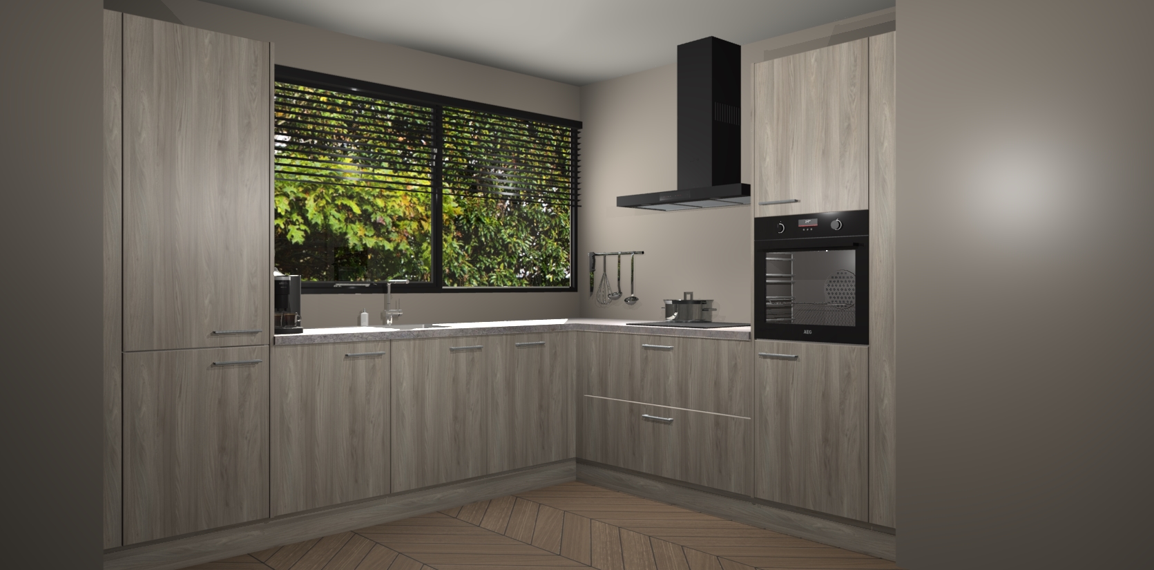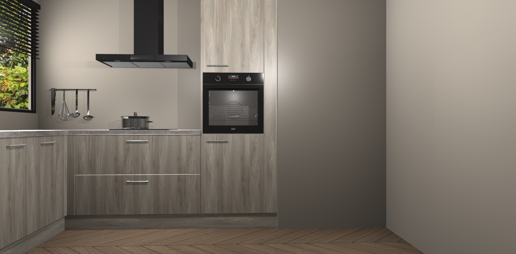 Met een modern, tijdloos design en ruime opslagruimte, zult u zich in no-time thuis voelen in uw nieuwe keuken. Uw leven wordt eenvoudiger met de soft-close deuren die voor het ultieme stille comfort zorgen - geen geluid dat u stoort terwijl u kookt. Ook is de keuken voorzien van 5 ingebouwde apparaten: een oven, inductie kookplaat, afzuigkap, vaatwasser en koelkast. Deze kunnen gemakkelijk na bestelling worden bijgewerkt naar AEG - waardoor uw luxe ervaring compleet is.
