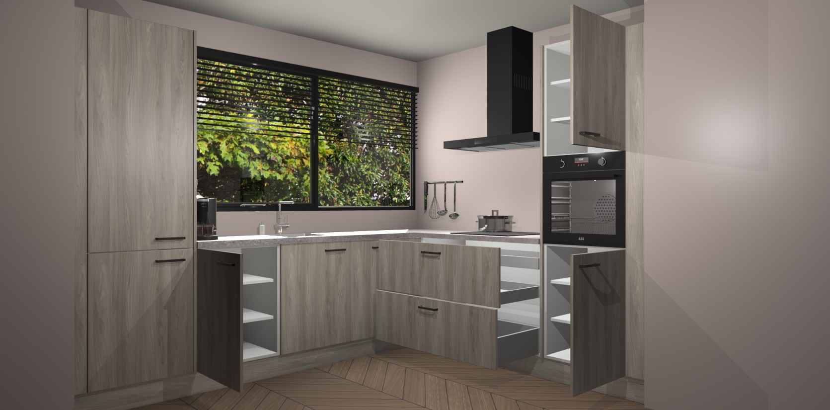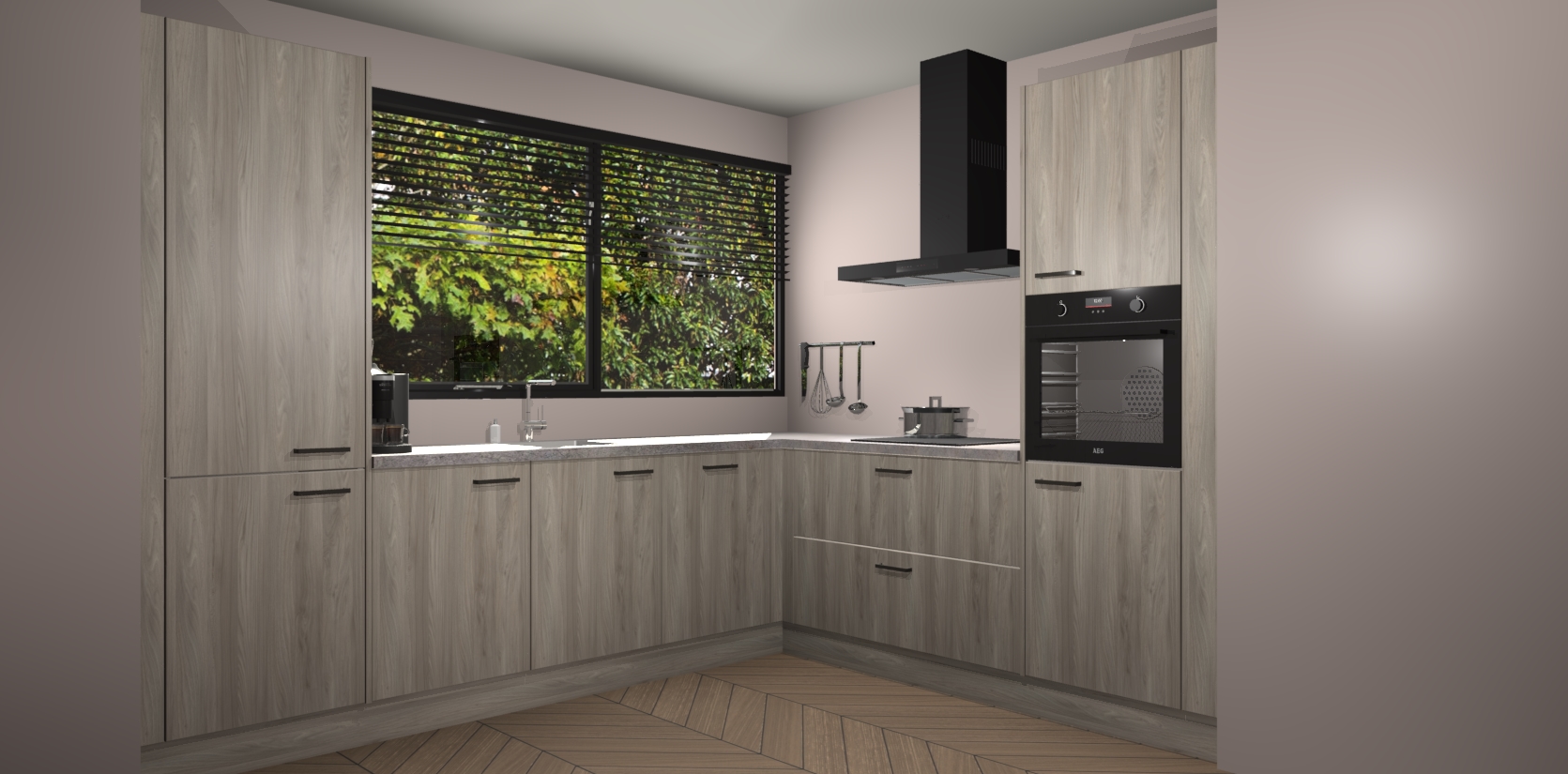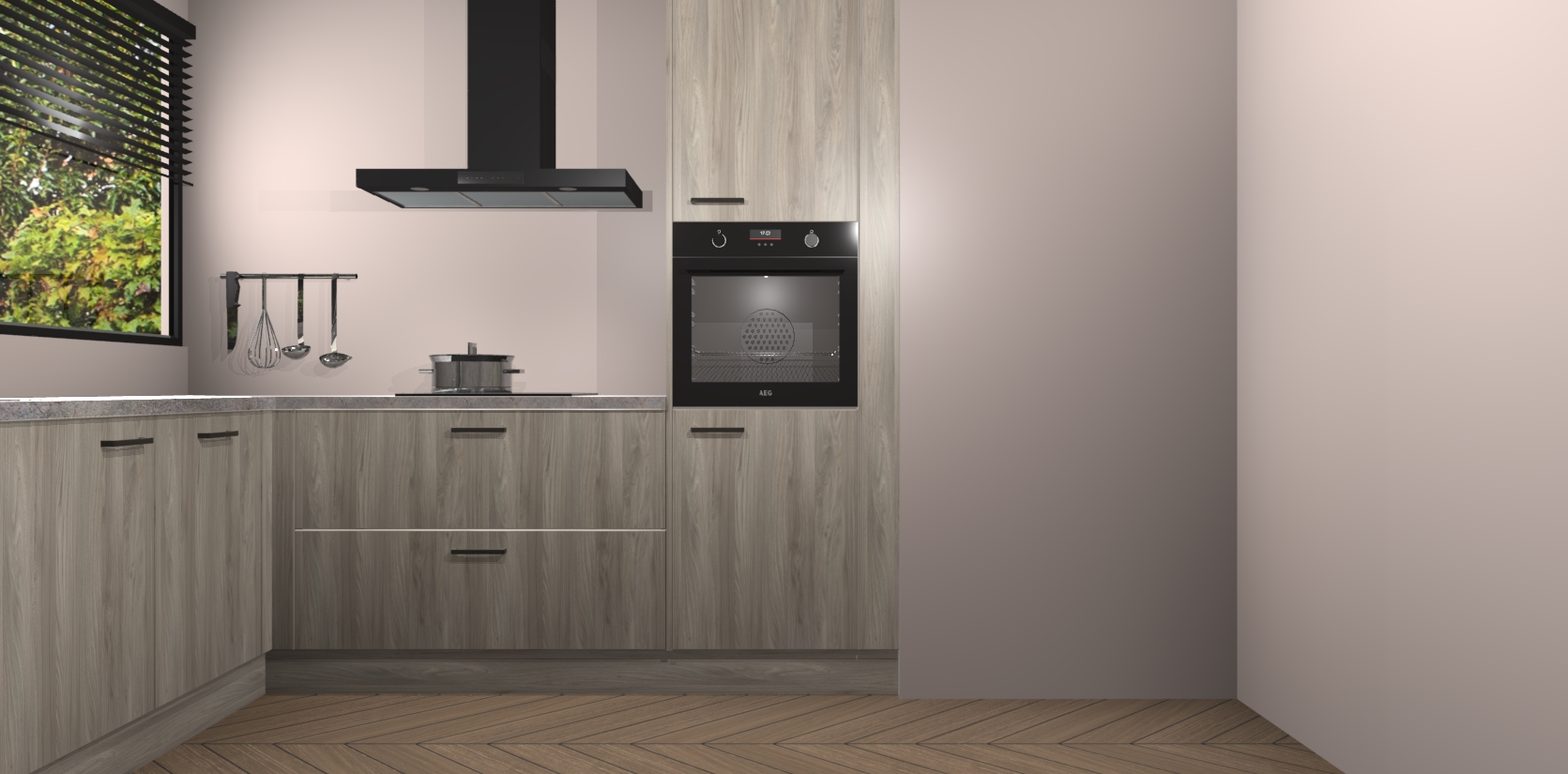 Met een modern, tijdloos design en ruime opslagruimte, zult u zich in no-time thuis voelen in uw nieuwe keuken. Uw leven wordt eenvoudiger met de soft-close deuren die voor het ultieme stille comfort zorgen - geen geluid dat u stoort terwijl u kookt. Ook is de keuken voorzien van 5 ingebouwde apparaten: een oven, inductie kookplaat, afzuigkap, vaatwasser en koelkast. Deze kunnen gemakkelijk na bestelling worden bijgewerkt naar AEG - waardoor uw luxe ervaring compleet is.