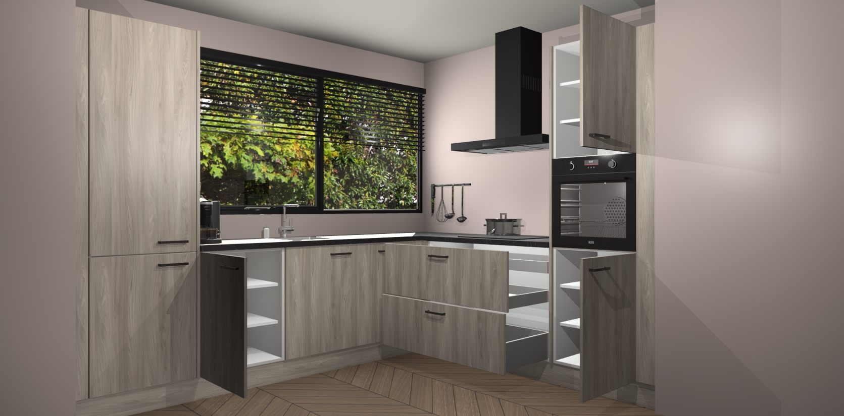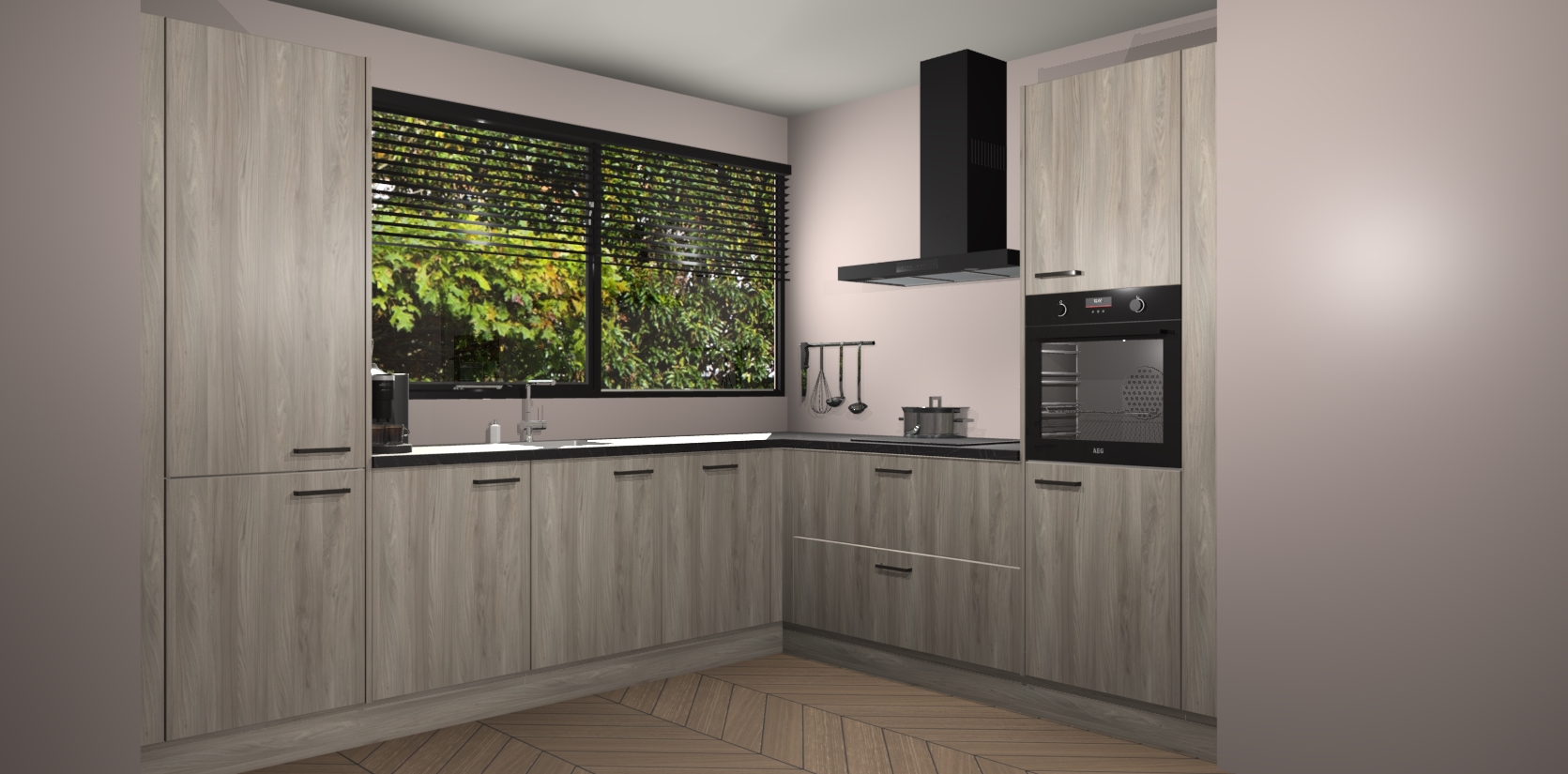 Met een modern, tijdloos design en ruime opslagruimte, zult u zich in no-time thuis voelen in uw nieuwe keuken. Uw leven wordt eenvoudiger met de soft-close deuren die voor het ultieme stille comfort zorgen - geen geluid dat u stoort terwijl u kookt. Ook is de keuken voorzien van 5 ingebouwde apparaten: een oven, inductie kookplaat, afzuigkap, vaatwasser en koelkast. Deze kunnen gemakkelijk na bestelling worden bijgewerkt naar AEG - waardoor uw luxe ervaring compleet is.