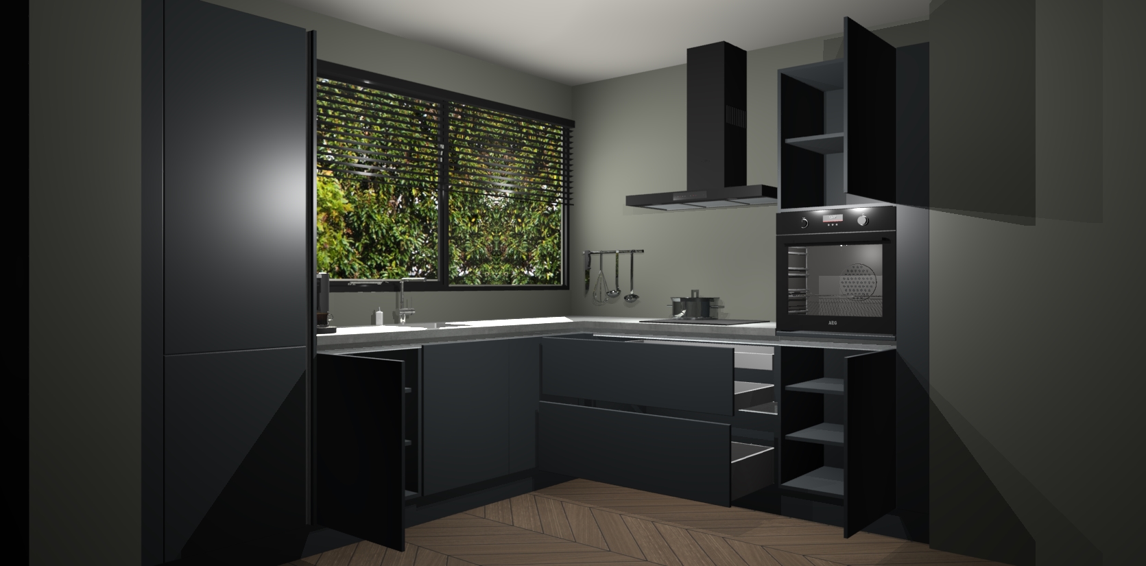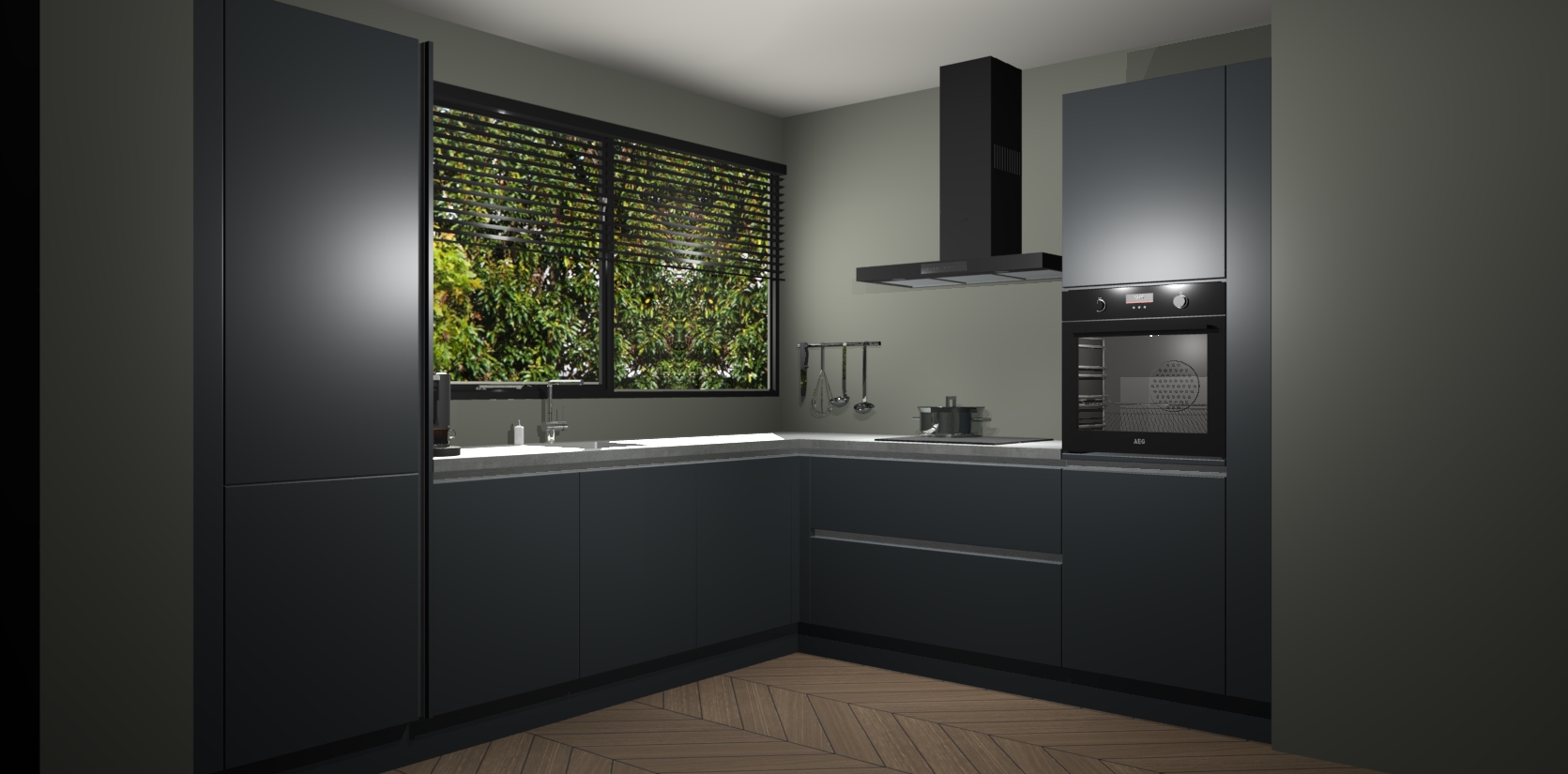 Met een modern, tijdloos design en ruime opslagruimte, zult u zich in no-time thuis voelen in uw nieuwe keuken. Uw leven wordt eenvoudiger met de soft-close deuren die voor het ultieme stille comfort zorgen - geen geluid dat u stoort terwijl u kookt. Ook is de keuken voorzien van 5 ingebouwde apparaten: een oven, inductie kookplaat, afzuigkap, vaatwasser en koelkast. Deze kunnen gemakkelijk na bestelling worden bijgewerkt naar AEG - waardoor uw luxe ervaring compleet is.
