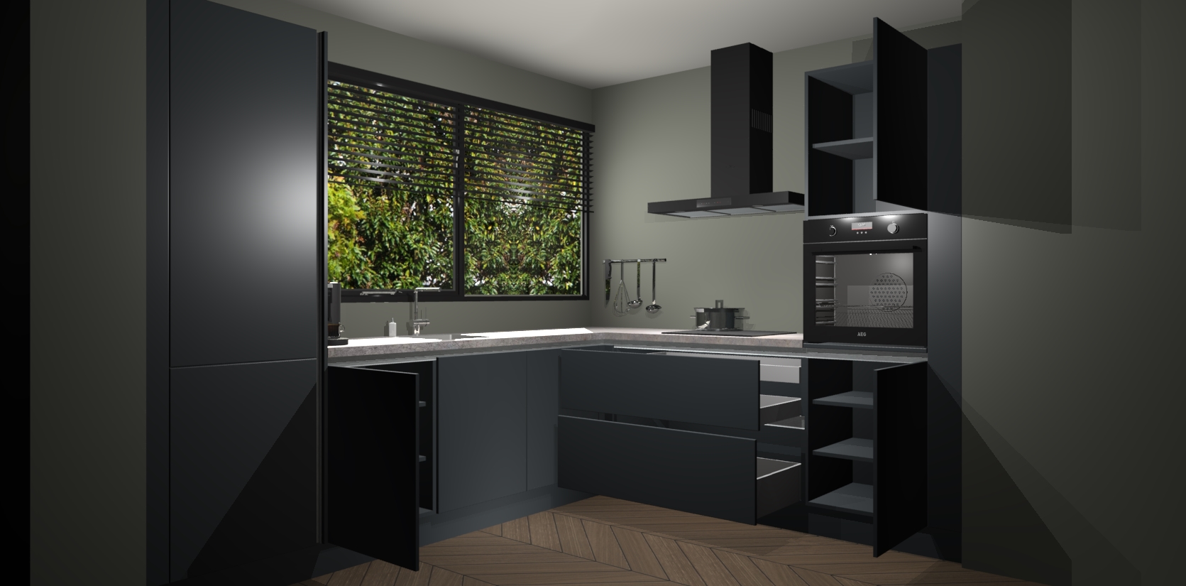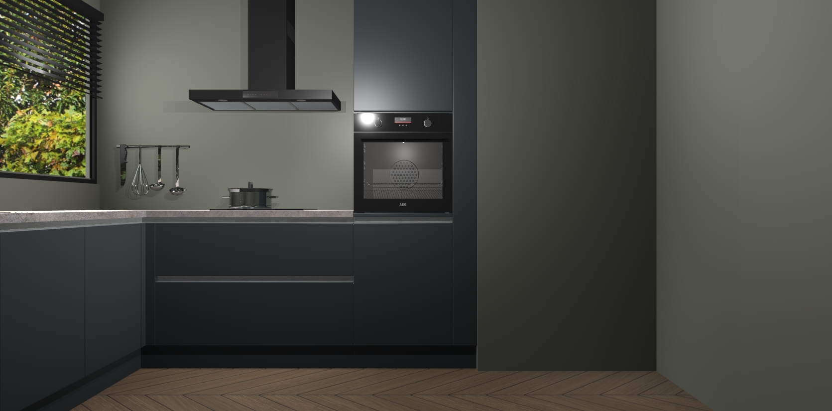 Met een modern, tijdloos design en ruime opslagruimte, zult u zich in no-time thuis voelen in uw nieuwe keuken. Uw leven wordt eenvoudiger met de soft-close deuren die voor het ultieme stille comfort zorgen - geen geluid dat u stoort terwijl u kookt. Ook is de keuken voorzien van 5 ingebouwde apparaten: een oven, inductie kookplaat, afzuigkap, vaatwasser en koelkast. Deze kunnen gemakkelijk na bestelling worden bijgewerkt naar AEG - waardoor uw luxe ervaring compleet is.
