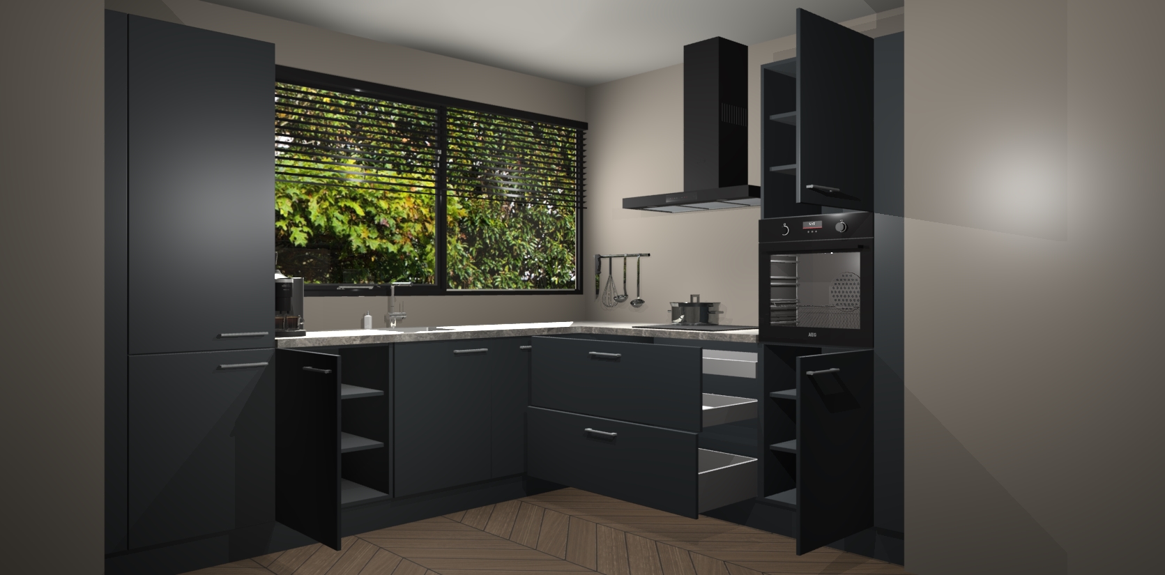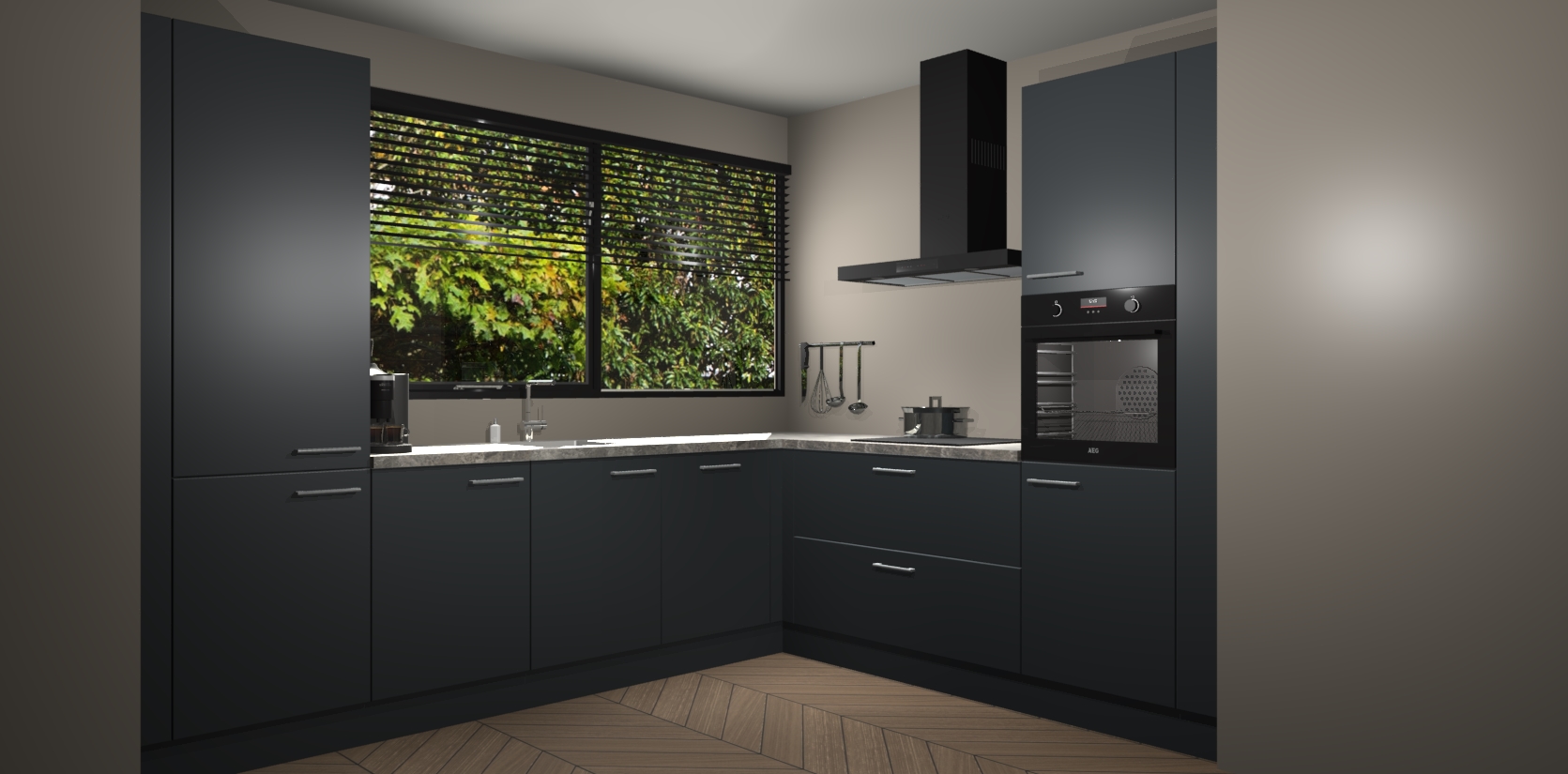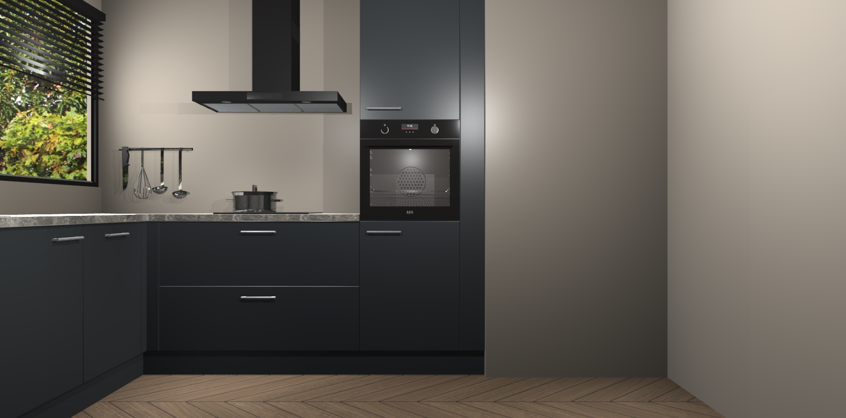 Met een modern, tijdloos design en ruime opslagruimte, zult u zich in no-time thuis voelen in uw nieuwe keuken. Uw leven wordt eenvoudiger met de soft-close deuren die voor het ultieme stille comfort zorgen - geen geluid dat u stoort terwijl u kookt. Ook is de keuken voorzien van 5 ingebouwde apparaten: een oven, inductie kookplaat, afzuigkap, vaatwasser en koelkast. Deze kunnen gemakkelijk na bestelling worden bijgewerkt naar AEG - waardoor uw luxe ervaring compleet is.