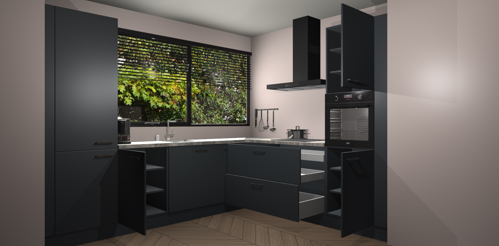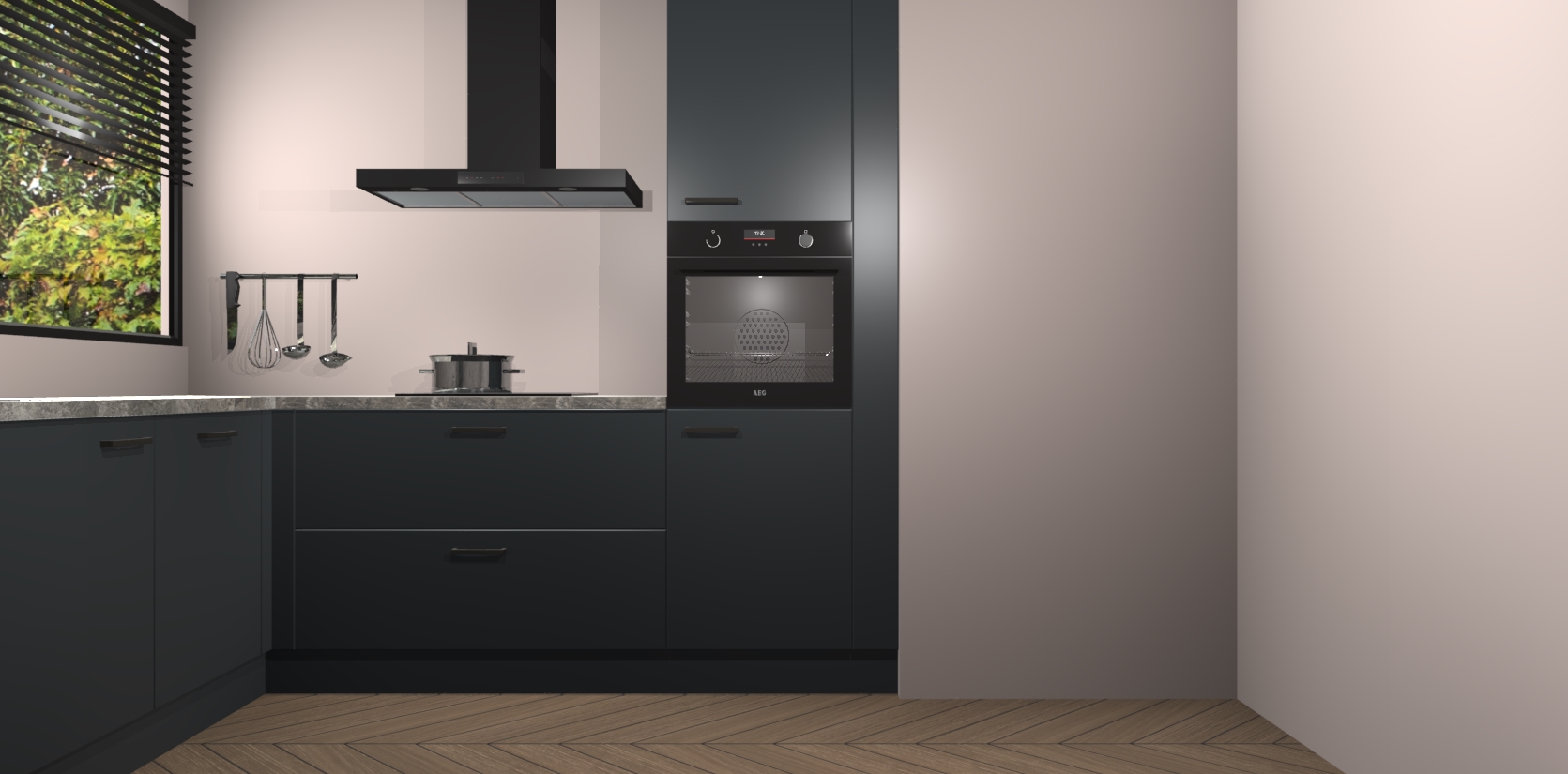 Met een modern, tijdloos design en ruime opslagruimte, zult u zich in no-time thuis voelen in uw nieuwe keuken. Uw leven wordt eenvoudiger met de soft-close deuren die voor het ultieme stille comfort zorgen - geen geluid dat u stoort terwijl u kookt. Ook is de keuken voorzien van 5 ingebouwde apparaten: een oven, inductie kookplaat, afzuigkap, vaatwasser en koelkast. Deze kunnen gemakkelijk na bestelling worden bijgewerkt naar AEG - waardoor uw luxe ervaring compleet is.