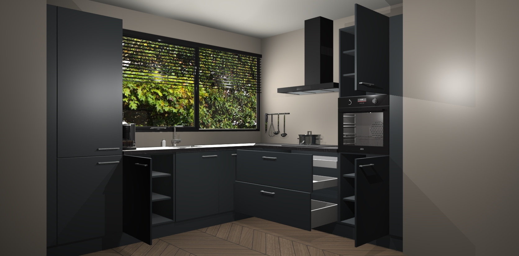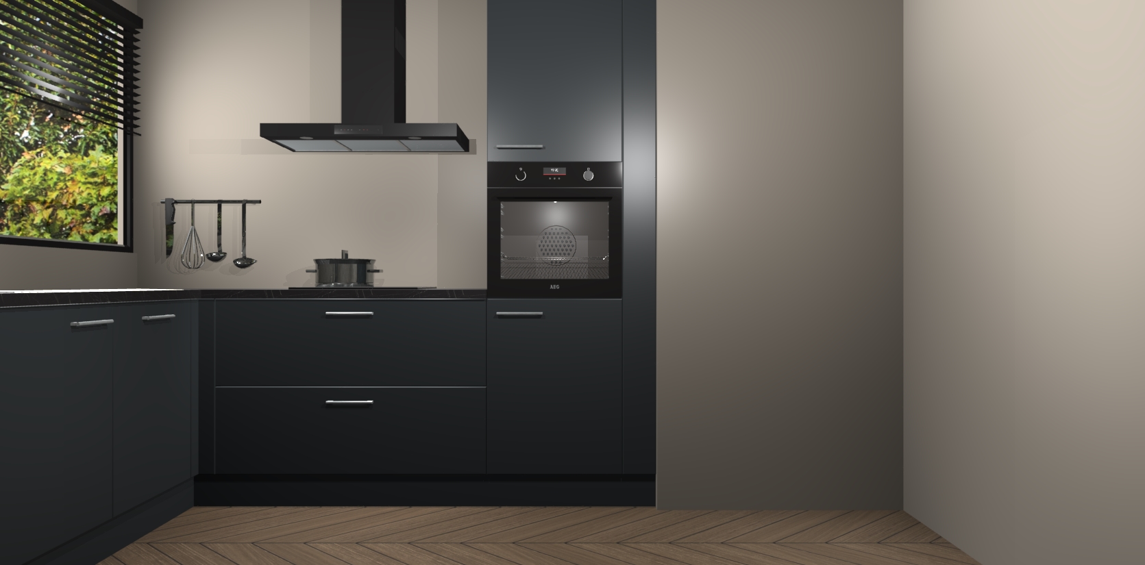 Met een modern, tijdloos design en ruime opslagruimte, zult u zich in no-time thuis voelen in uw nieuwe keuken. Uw leven wordt eenvoudiger met de soft-close deuren die voor het ultieme stille comfort zorgen - geen geluid dat u stoort terwijl u kookt. Ook is de keuken voorzien van 5 ingebouwde apparaten: een oven, inductie kookplaat, afzuigkap, vaatwasser en koelkast. Deze kunnen gemakkelijk na bestelling worden bijgewerkt naar AEG - waardoor uw luxe ervaring compleet is.