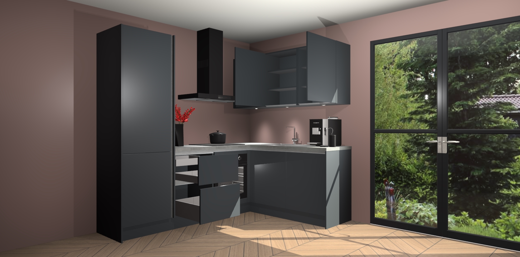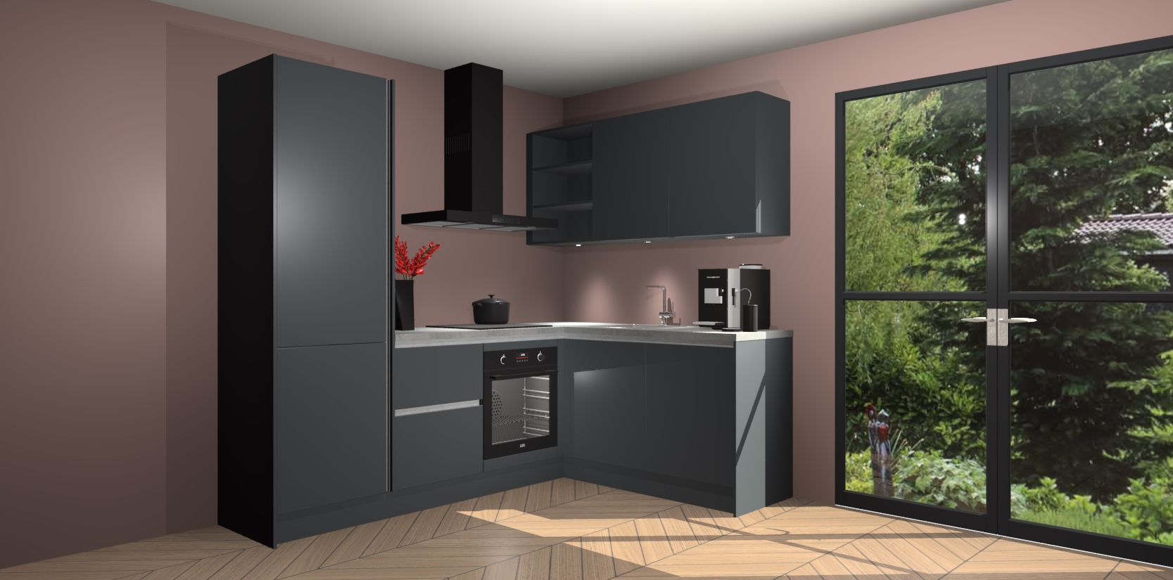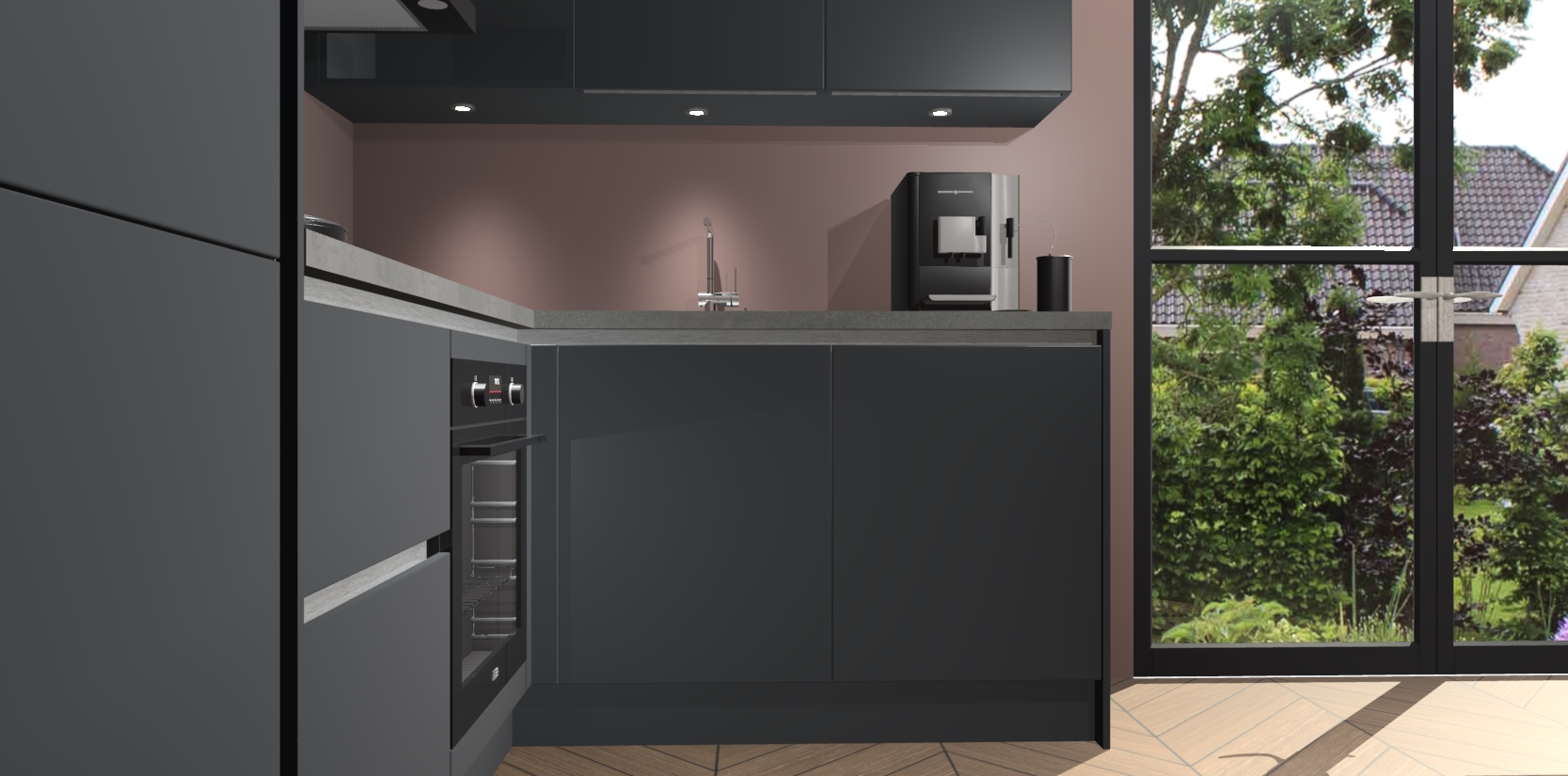 Wauw, dit is de onyxgrijze greeploze keuken Pilsen! U kunt gerust zeggen dat u elegantie combineert met functionaliteit met deze keuken. Met een modern en chique ontwerp is de keuken precies wat u nodig heeft om uw ruimte te verfraaien. De binnenzijde van de kasten is in dezelfde donkere kleur als de buitenzijde voor een uniforme look, compleet met softclose-kasten die stil sluiten.