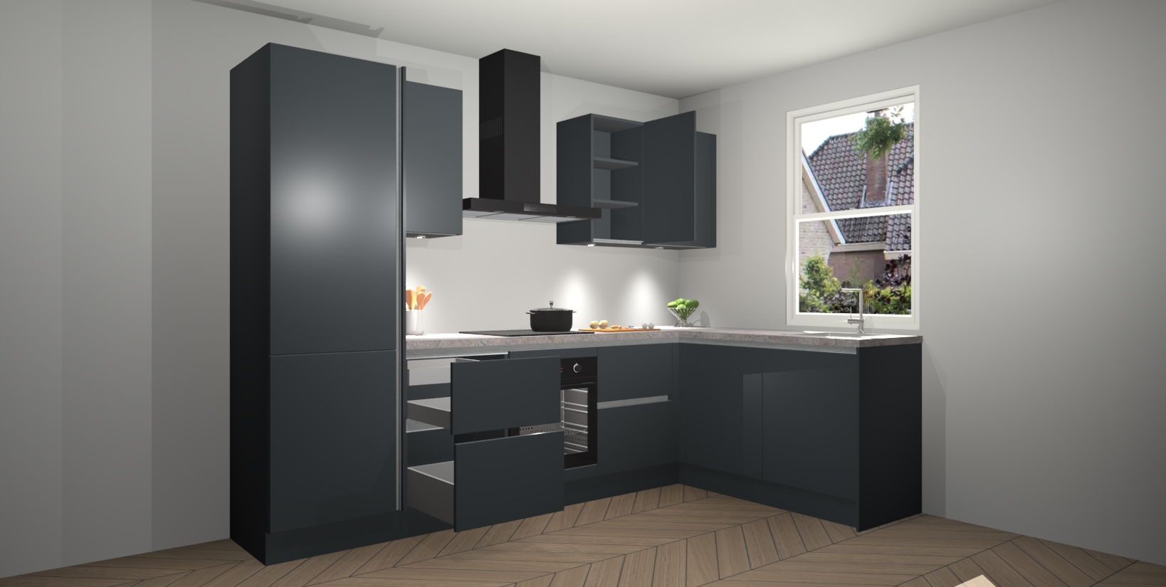 Maak kennis met de trendsettende en luxe Onyxgrijze greeploze keuken Bazel! Deze uitzonderlijke keuken van Duitse kwaliteit is stijlvol, modern en perfect om elk huis mee op te fleuren. De binnenkant van de kasten worden meegenomen in een bijpassende kleur om een samenhangende eigentijdse esthetiek te voltooien. U zult dol zijn op hoe uw pas gerenoveerde keuken eruitziet met de Onyxgrijze editie!