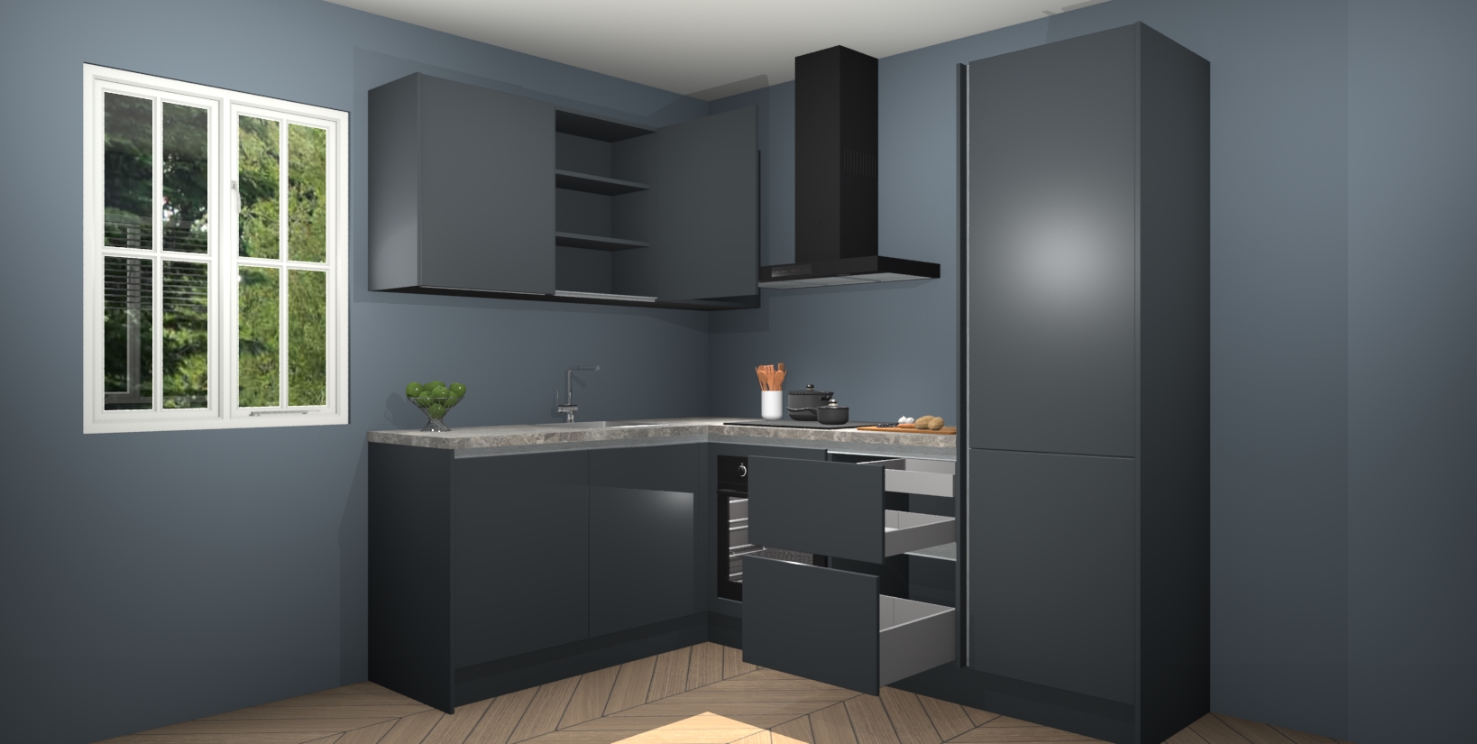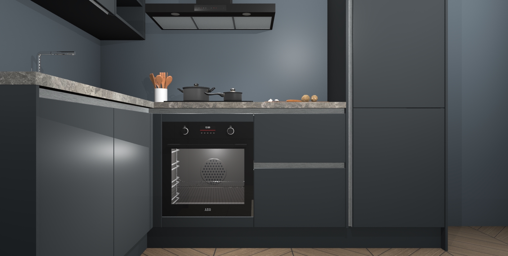 Maak kennis met de Onyxgrijze greeploze keuken Boekarest, een moderne hoekkeuken waar al uw vrienden en familie jaloers op zullen zijn! Het verbluffende mooie ontwerp past in elk interieur en is een ideale keuze voor wie op zoek is naar een klassieke, maar verfijnde look.