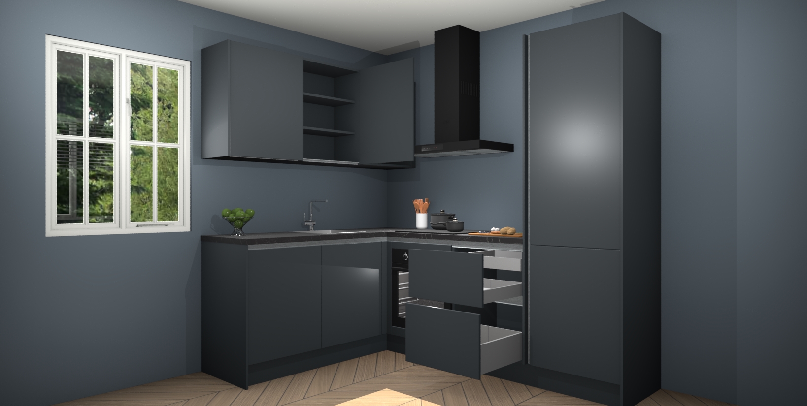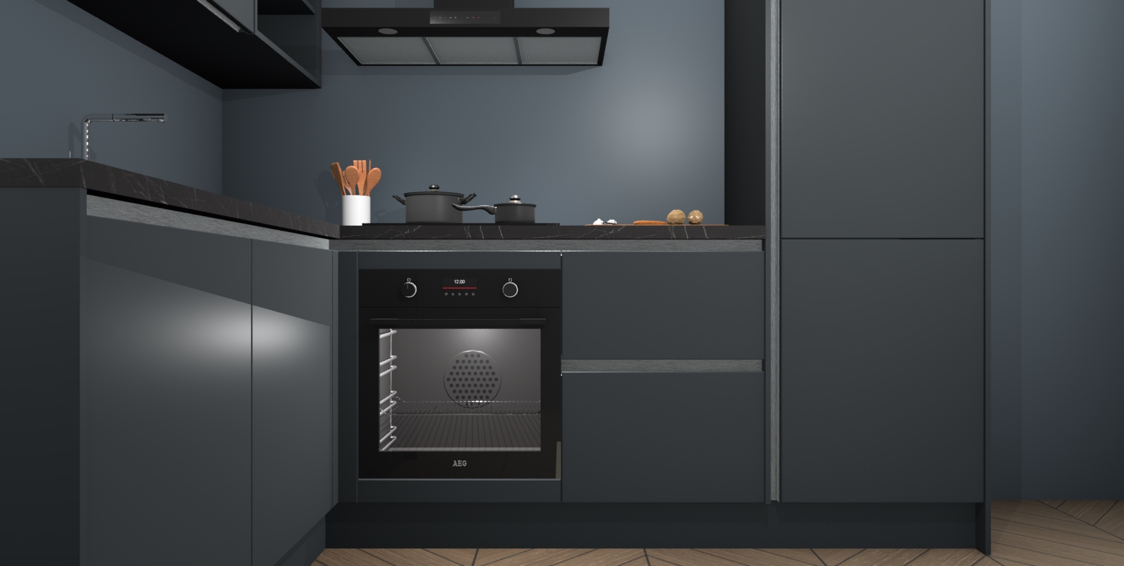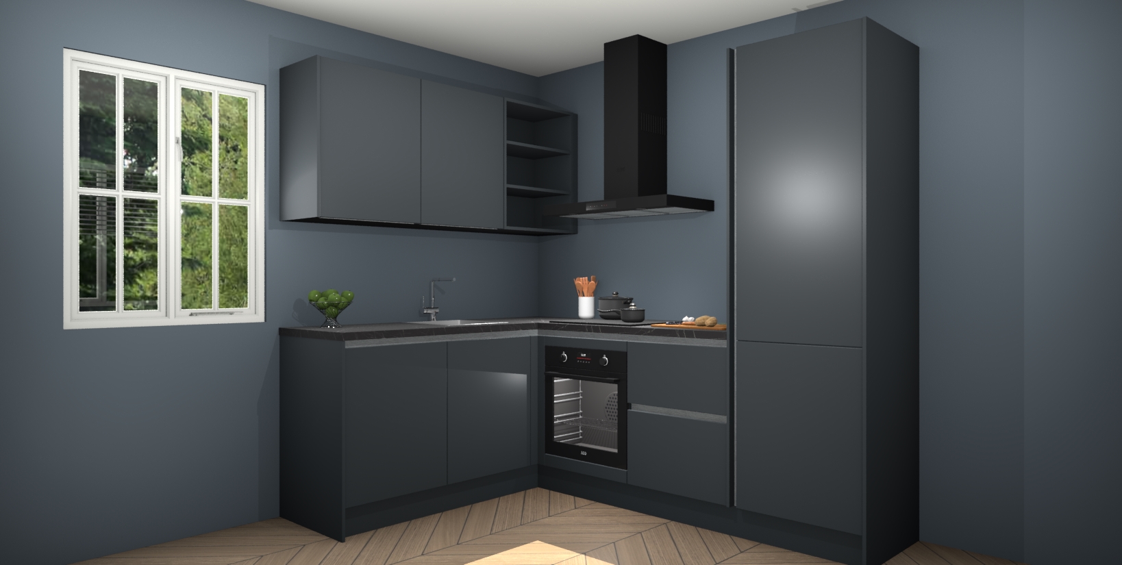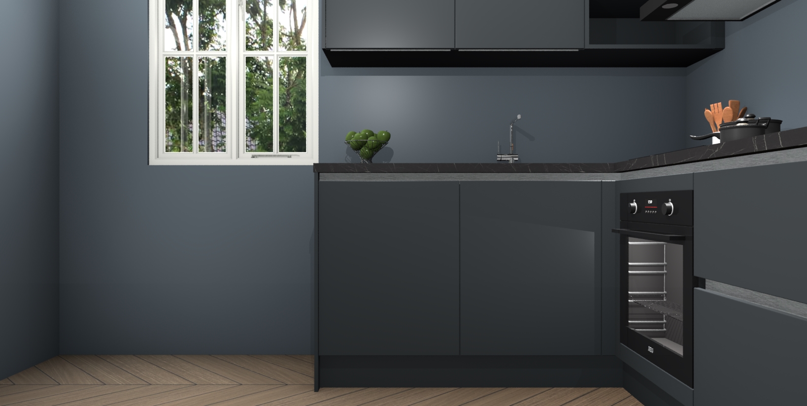 Maak kennis met de Onyxgrijze greeploze keuken Boekarest, een moderne hoekkeuken waar al uw vrienden en familie jaloers op zullen zijn! Het verbluffende mooie ontwerp past in elk interieur en is een ideale keuze voor wie op zoek is naar een klassieke, maar verfijnde look.