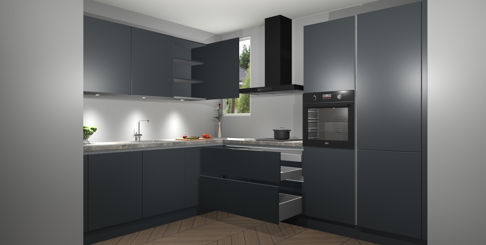 De ruime opbergruimte van dit model maakt het bereiden van voedsel en het gebruik van apparaten snel en gemakkelijk. Het beste van alles is dat het wordt geleverd met vijf inbouwapparaten: een oven, inductiekookplaat, afzuigkap, vaatwasser en koelkast - die allemaal gemakkelijk kunnen worden opgewaardeerd naar AEG na aankoop. Wat de gemaksfactor nog groter maakt, is het feit dat alle cabines voorgemonteerd worden geleverd, zodat u er meteen mee aan de slag kunt!