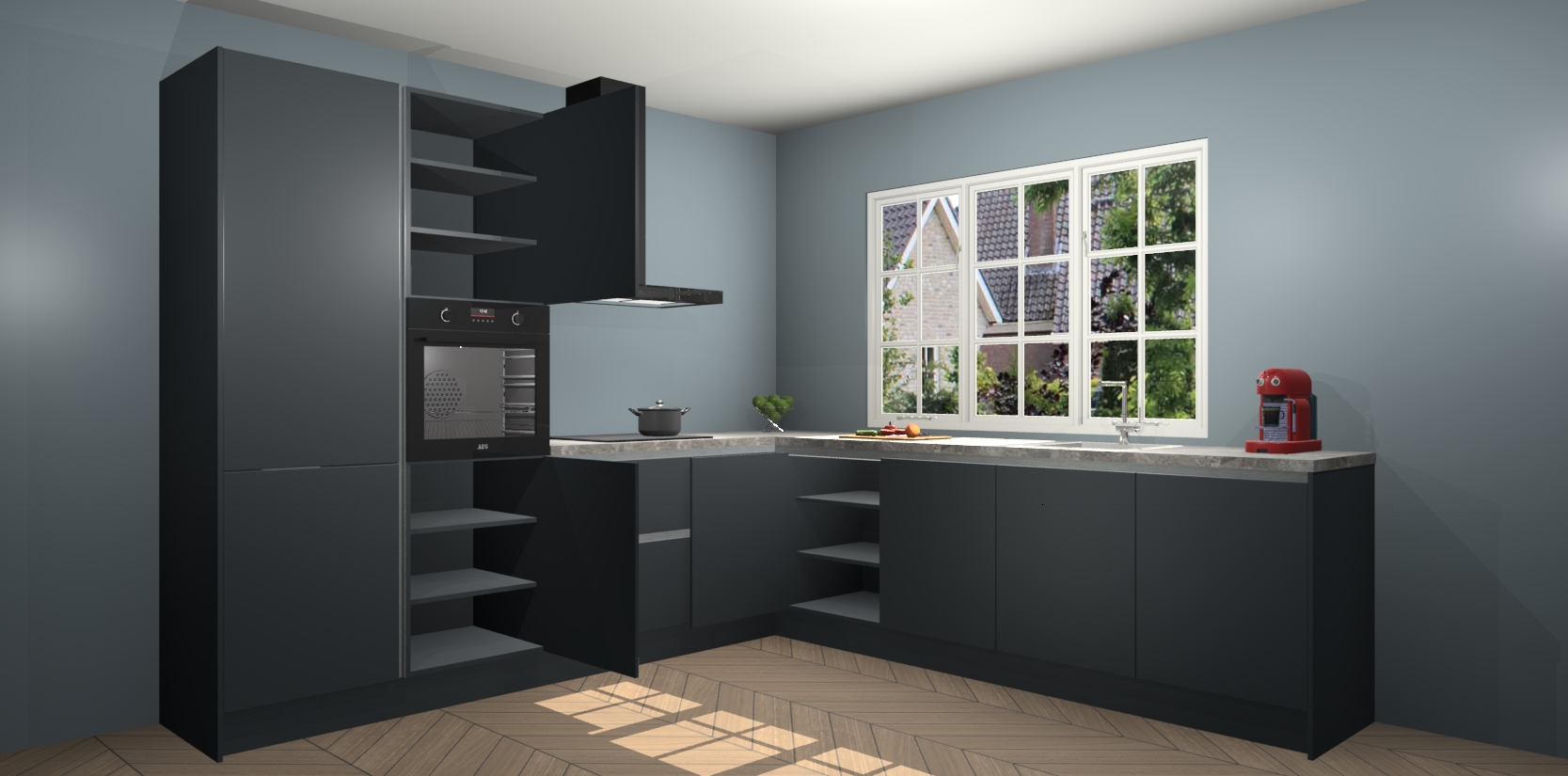 De keuken heeft veel opbergruimte, waardoor u alle ingrediënten gemakkelijk bereikbaar hebt staan. En daarnaast bevat deze volledig uitgeruste keuken ook 5 ingebouwde apparaten: een oven, inductiekookplaat, afzuigkap, vaatwasser en koelkast. Deze zijn heel eenvoudig na bestellen te upgraden naar AEG als u dit wilt. Bovendien zijn de softclose-kastdeuren ideaal; geef ze gewoon even een tikje en ze sluiten automatisch met geruisloze precisie.
