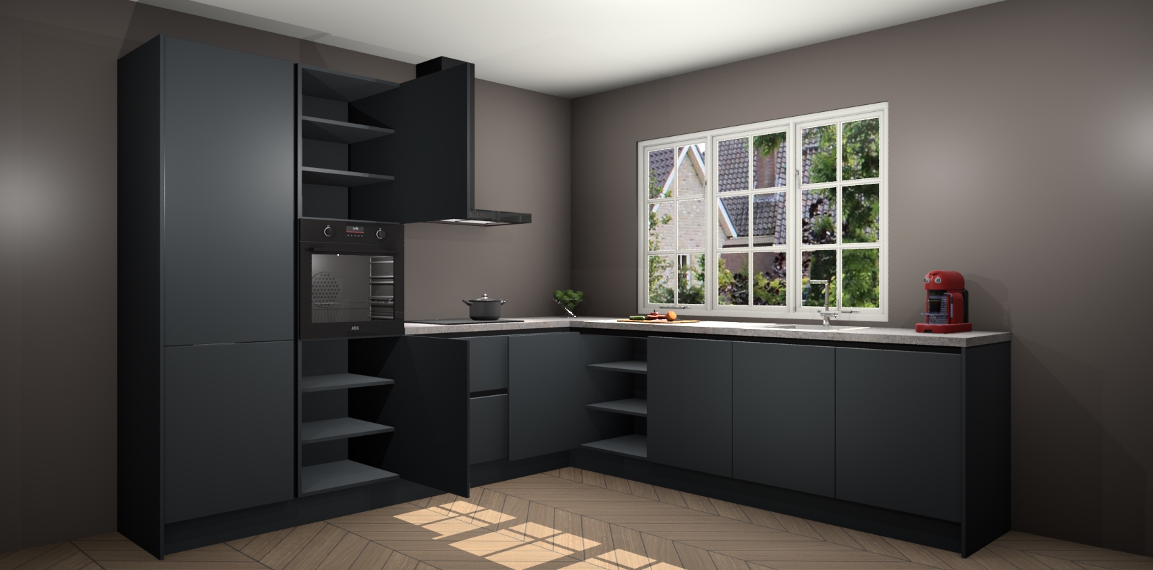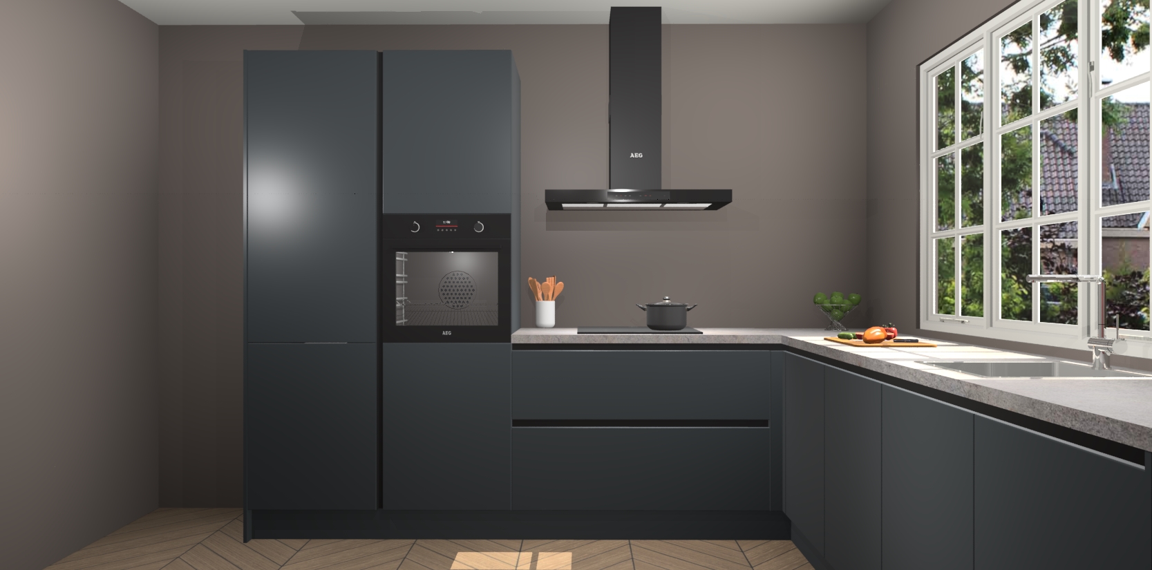 De keuken heeft veel opbergruimte, waardoor u alle ingrediënten gemakkelijk bereikbaar hebt staan. En daarnaast bevat deze volledig uitgeruste keuken ook 5 ingebouwde apparaten: een oven, inductiekookplaat, afzuigkap, vaatwasser en koelkast. Deze zijn heel eenvoudig na bestellen te upgraden naar AEG als u dit wilt. Bovendien zijn de softclose-kastdeuren ideaal; geef ze gewoon even een tikje en ze sluiten automatisch met geruisloze precisie.
