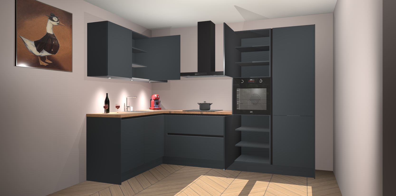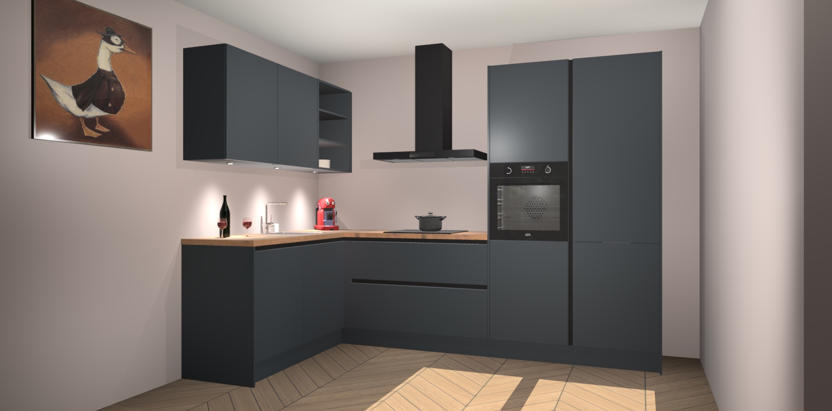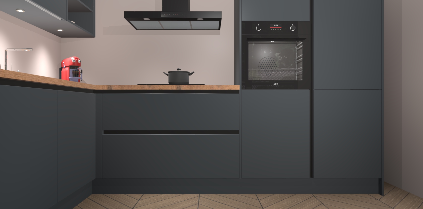 De Onyxgrijze greeploze keuken Cognac is een adembenemend ontwerp met een modern en tijdloos uiterlijk. Deze luxe keuken straalt echt aristocratisch uit, waardoor uw koken plezieriger zal worden! Het prachtige design begint bij de hoekkeuken, wat perfect past bij elk type interieur. Bovendien bevat deze hoogwaardige set vijf inbouwapparaten - van oven tot koelkast - die via bestelling naar AEG geüpgraded kunnen worden!